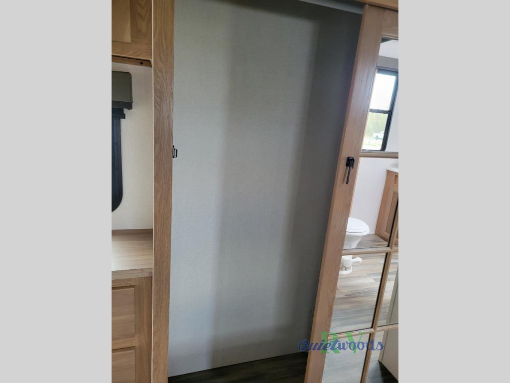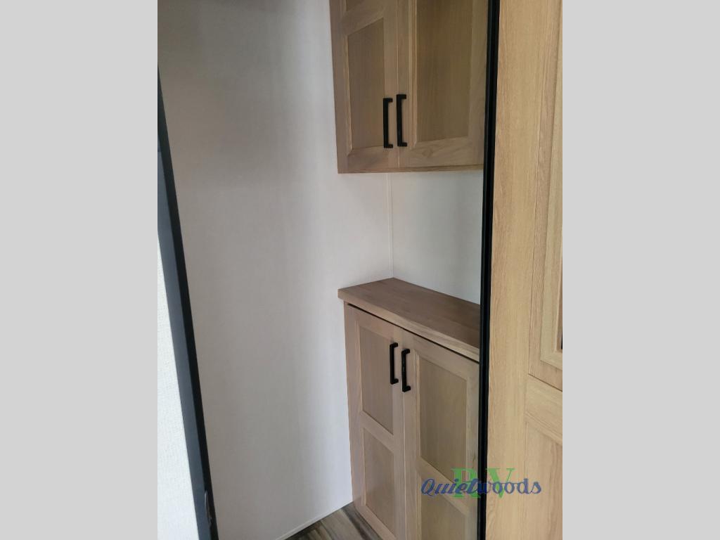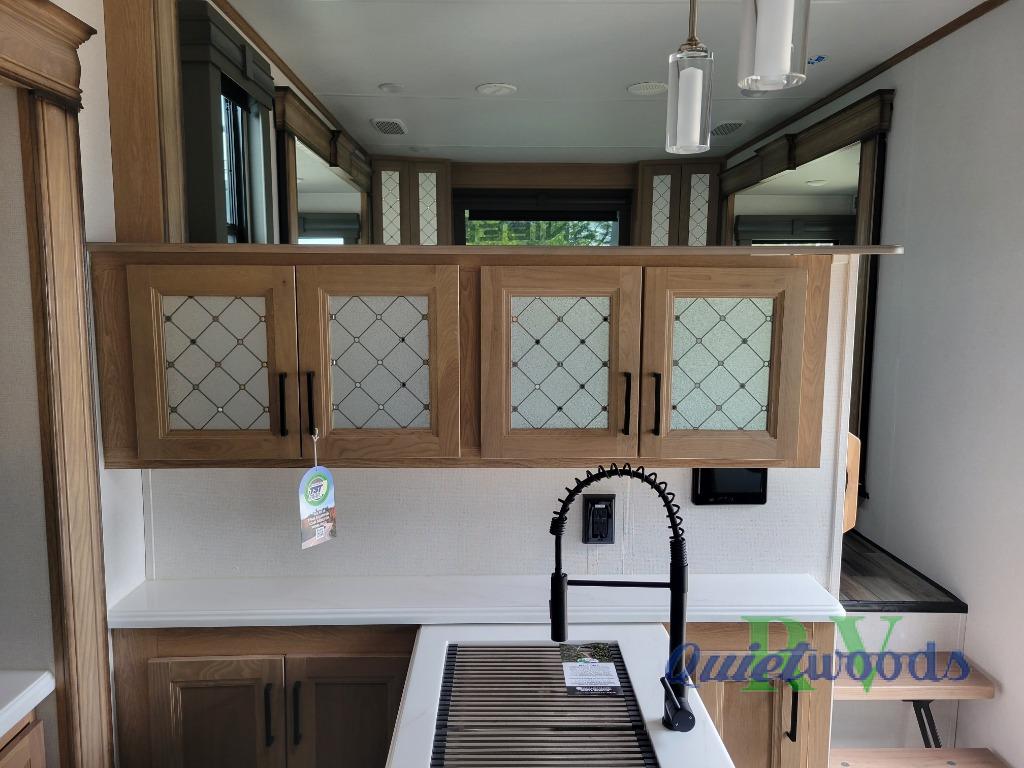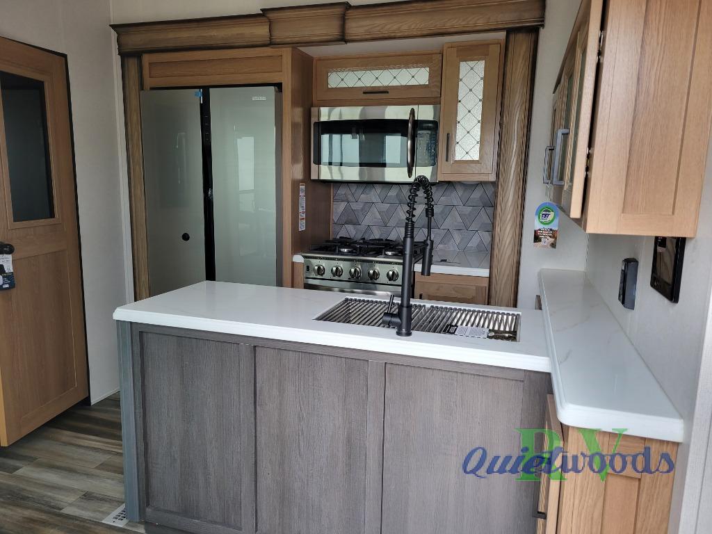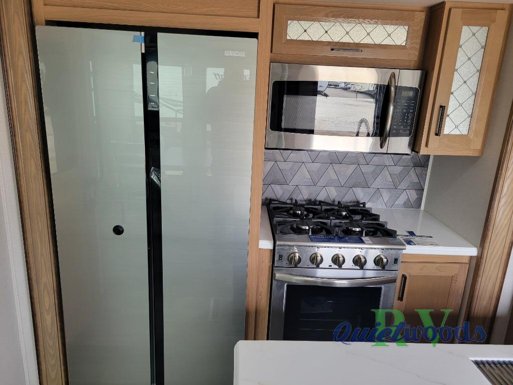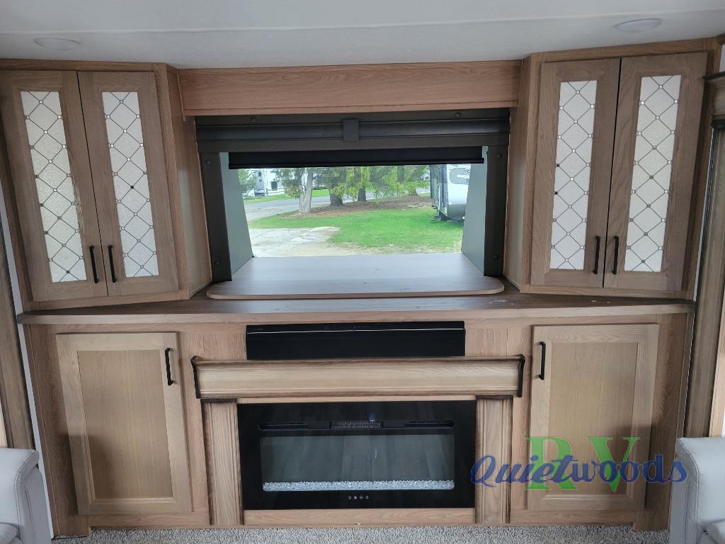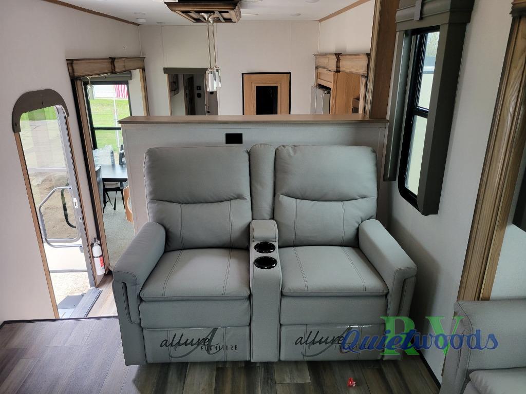 Experience a home away from home with this fifth wheel! The front living area has opposing EZ glide couches and 65" power theater seating across from the front entertainment center with a fireplace and 50" LED pop-up TV to watch your favorite movies. Just grab a snack from the walk-in pantry, pop a bag of popcorn in the microwave, and grab a cold drink from the 15 cu. ft. residential refrigerator then you're all set. The private bedroom has a 72" x 80" king bed slide for more walking around space and a dresser with wardrobes on either side to keep your clothes looking nice, plus it leads directly into the full rear bathroom. Two can get ready at once in the bathroom with the dual sink vanity and there is a linen closet for your towels, plus a second linen closet that is prepped to add an optional washer and dryer so you can extend your trip with clean clothes!