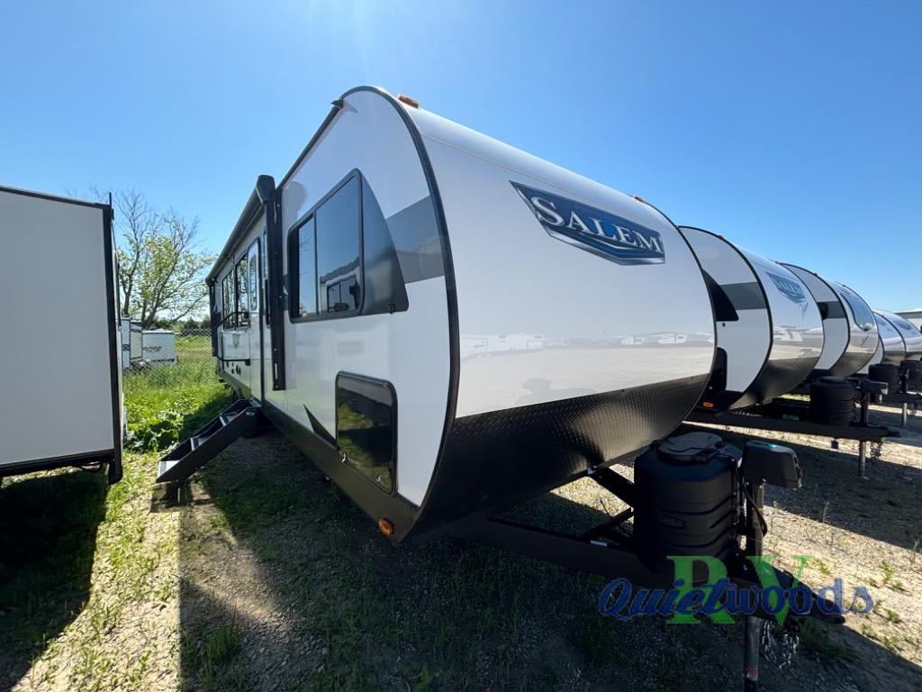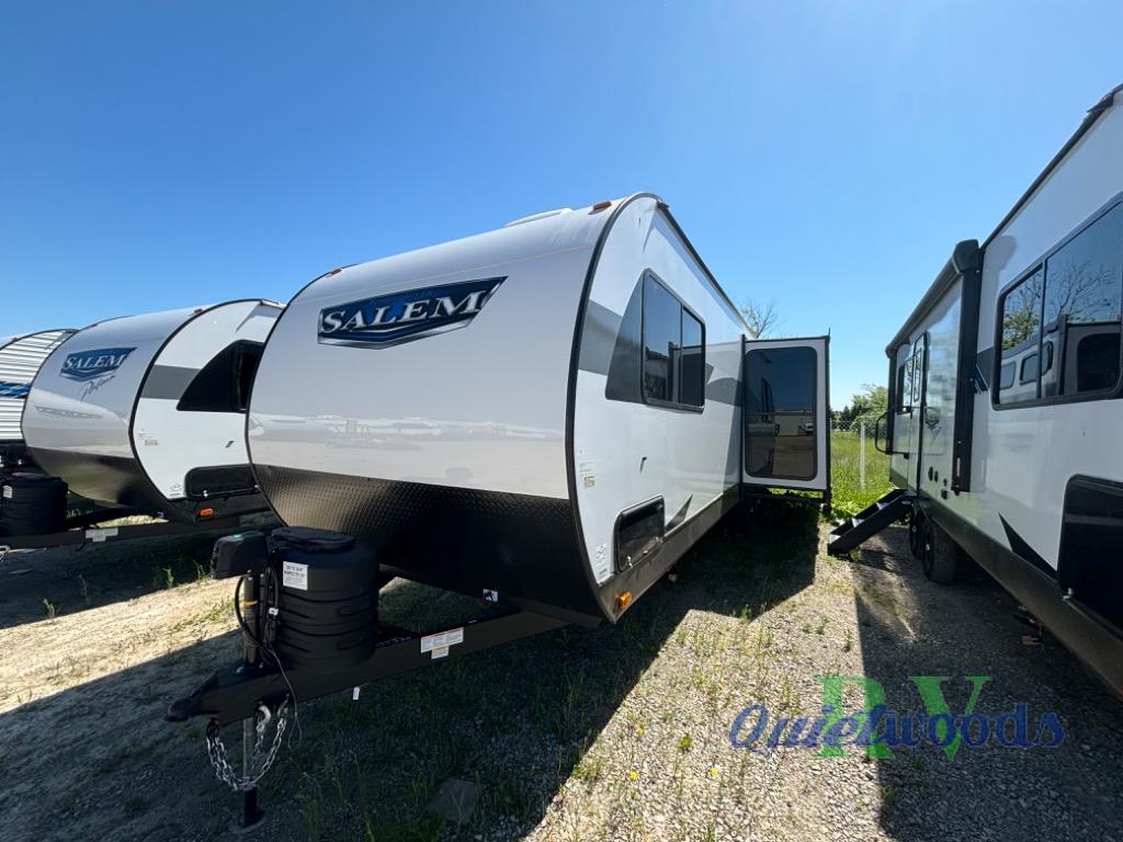 Choose any Salem View travel trailer if you are looking to bring the outdoors inside. With loads of windows you will easily be soaking up your surroundings. All models feature a cambered chassis with a 2" wall construction, 16" (or less) on center, a powder coated I-beam frame with a 3/8" walk-on roof decking and 5/8" tongue and groove plywood floor decking, plus smooth hung fiberglass exterior along with an aerodynamic front radius profile. These units feature seamless holding tanks and color coded water lines as well. The heated and enclosed underbelly allows you to camp through more seasons, and you will enjoy the power tongue jack with LED light, quick drop stabilizer jacks for easy set up, as well as a power awning with adjustable legs, and so much more!