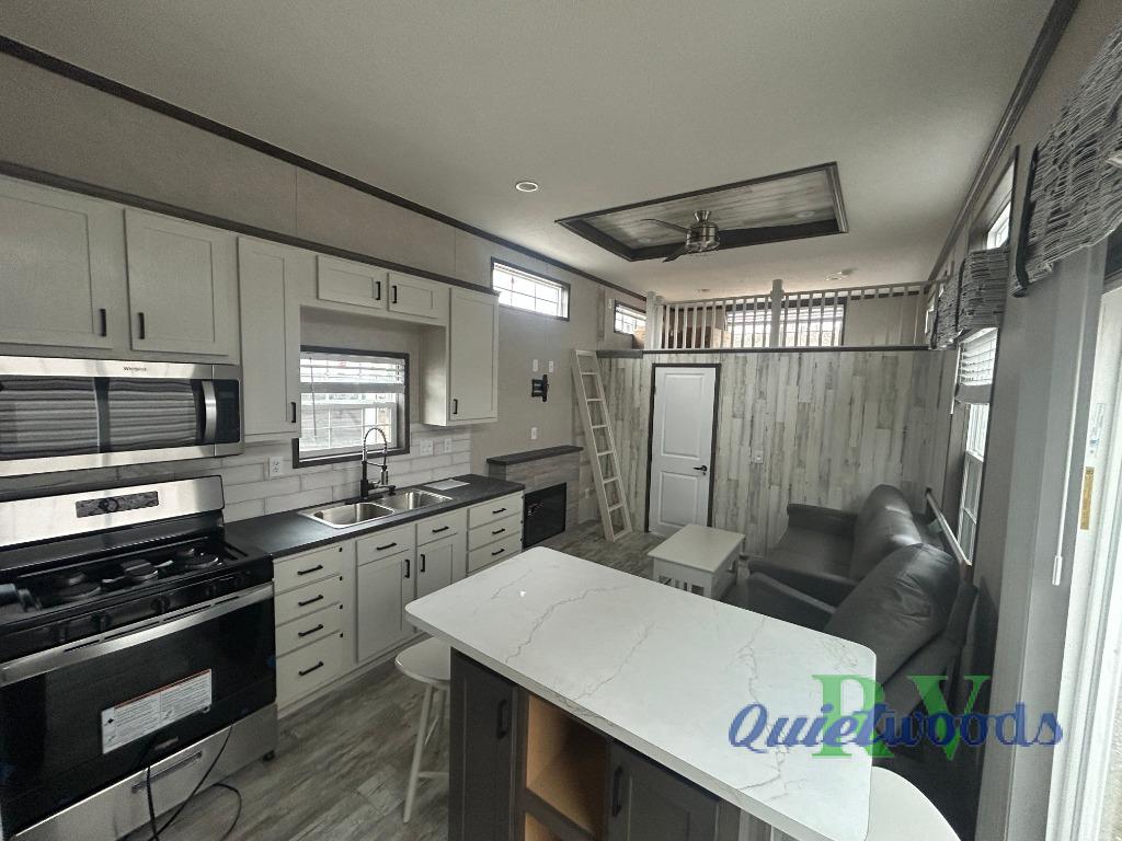 Head out to your park model today for some rest and relaxation! Whether you're lounging together in the central living area in front of the 54" floating entertainment center, or you're getting ready for bed and brushing your teeth with the residential ceramic sink in the rear bathroom, you will appreciate all of the many wonderful features that come standard in this model. Even bed time will be fun with the set of double-size bunks that are located in the rear private bunkhouse. You might even like to add the optional stacked washer/dryer option, and there are more you can choose for your specific needs.