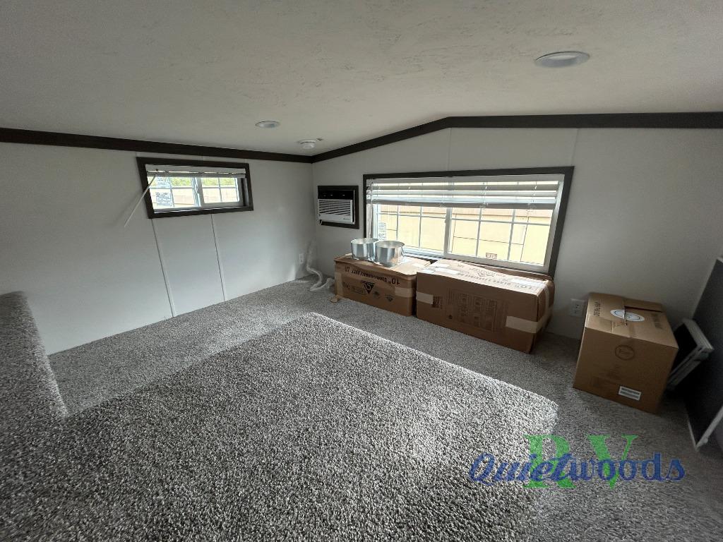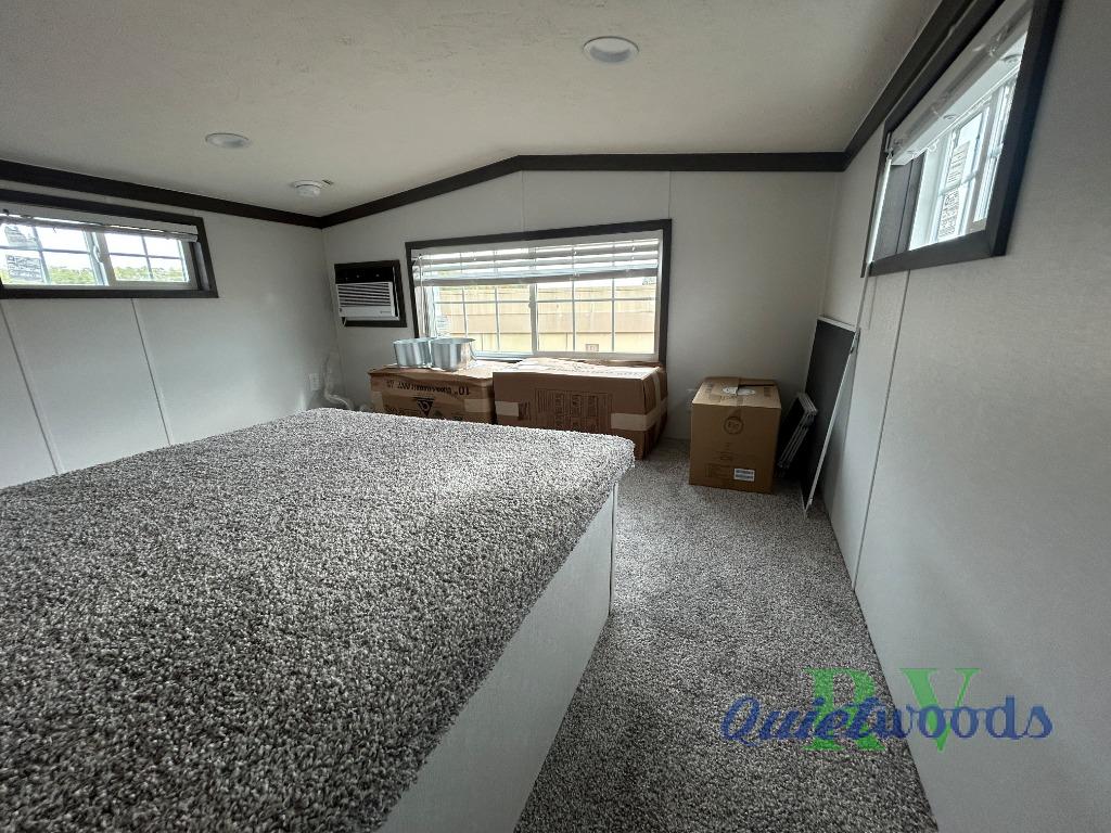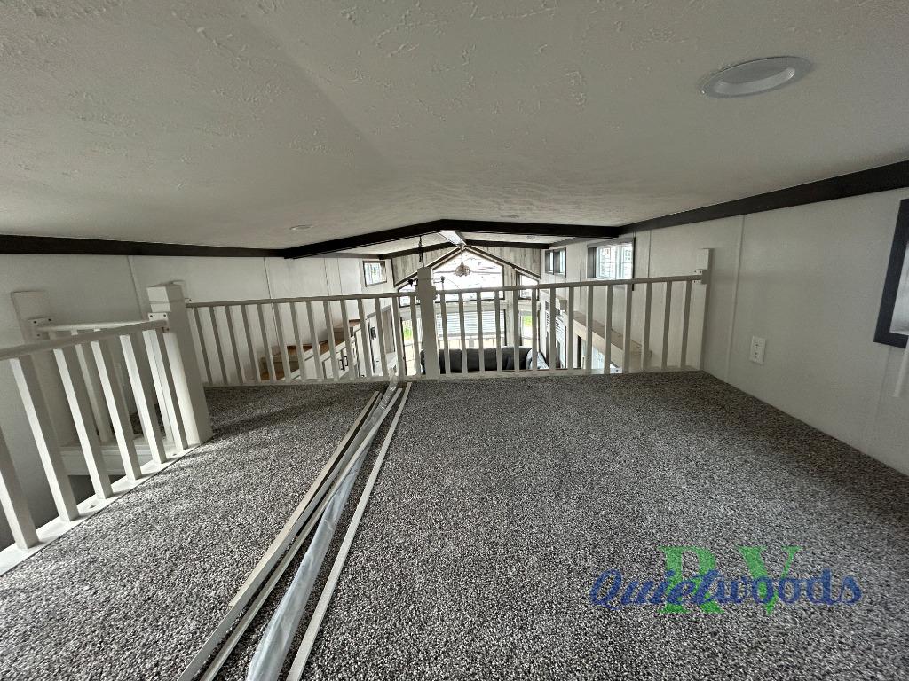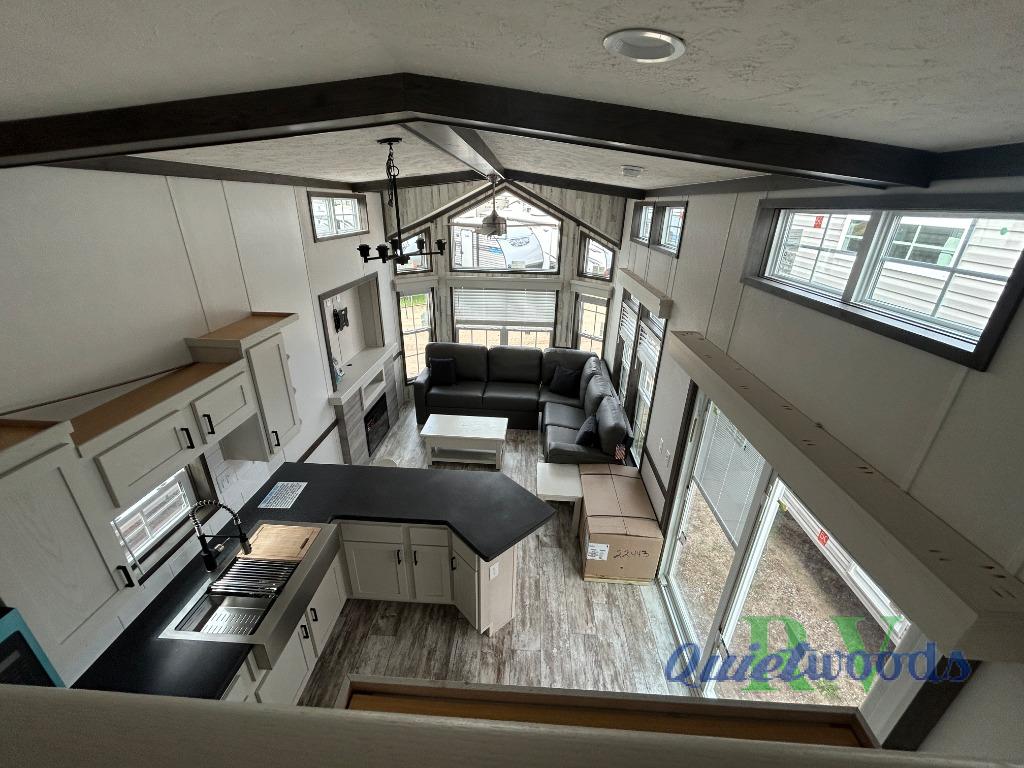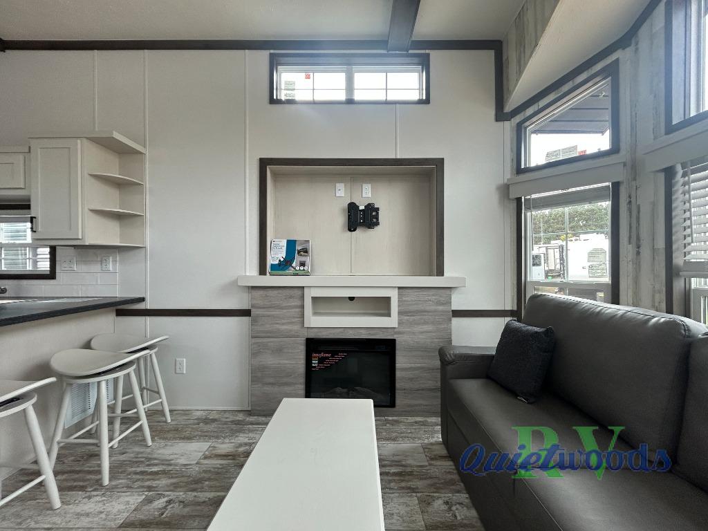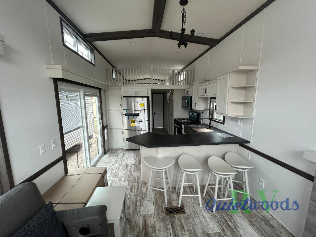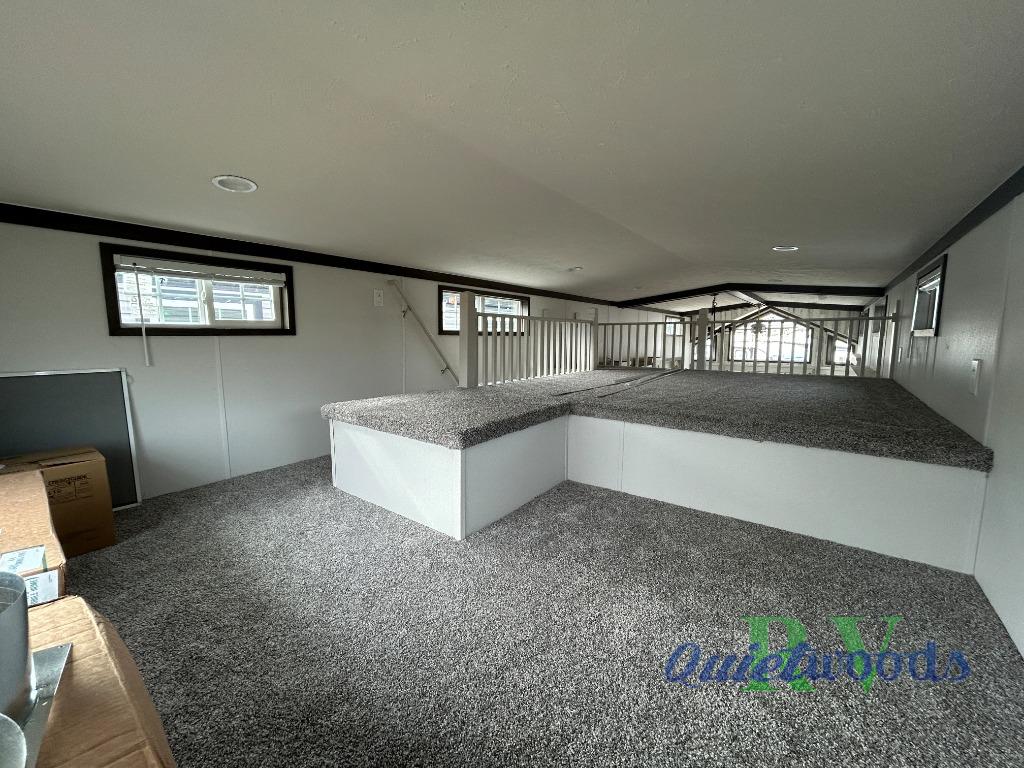 This park model with a loft is sure to make you feel right at home. This area will be perfect for little ones or storage of luggage and gear. The rear sunken bedroom includes a queen bed and dual nightstands for your book and glasses. Stay fresh each day with the one-piece tub/shower, and you can store your necessities in the lighted medicine cabinet. The living area includes a queen hide-a-bed sleeper sofa and a recliner for seating and sleeping space. You will love how much counter space you have in the kitchen, and the four burner cooktop will allow you to cook up any meal you have planned. You may also like to choose model 100162 that features a flat floor bedroom!