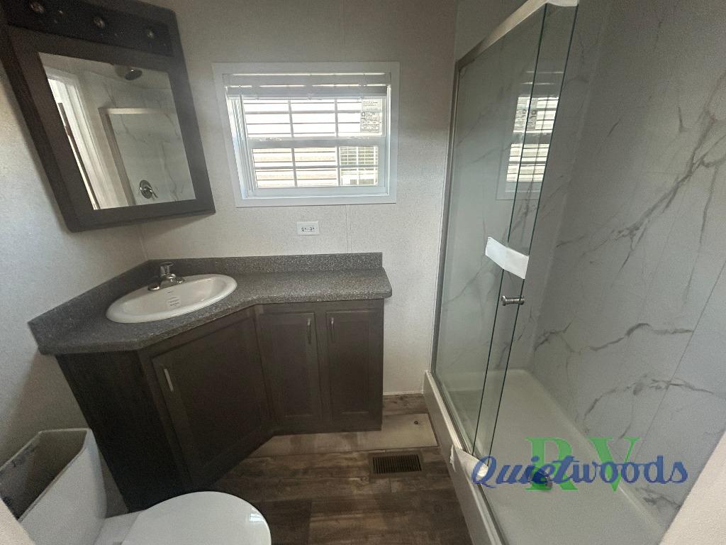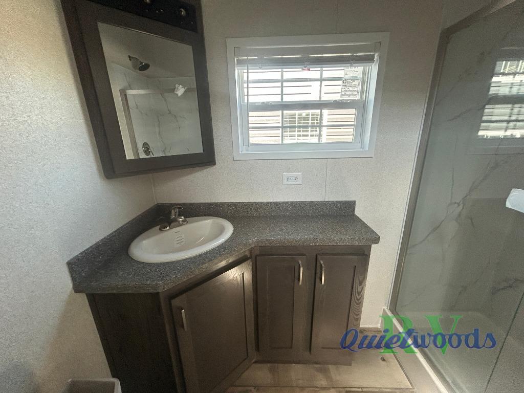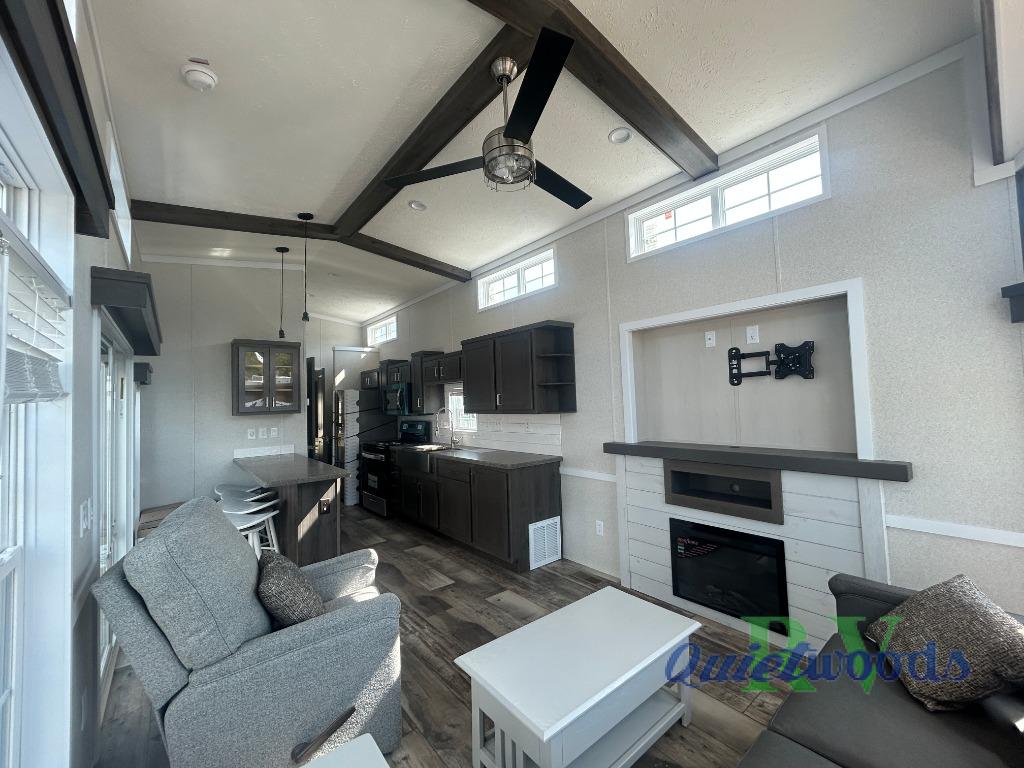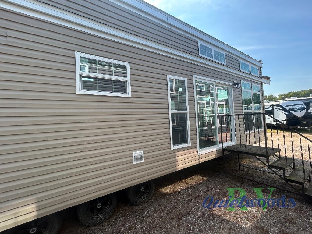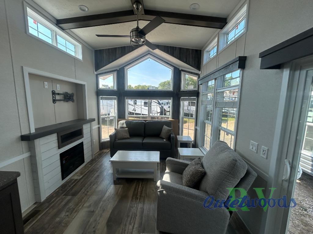 This park model is perfect for extended stays or full time living! You can relax in the front living room on the sofa and recliner, then head to the kitchen to make dinner on the four burner gas range or in the microwave. The full bath includes a one-piece spacious shower, lighted medicine cabinet and exhaust fan to keep air moving. And you'll love having your own space in the rear bedroom! You can also choose model 100185M if you are needing a loft for more sleeping space!