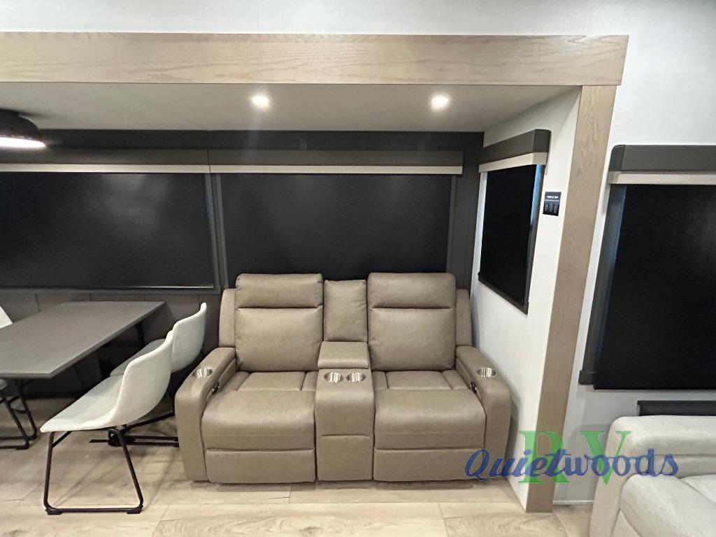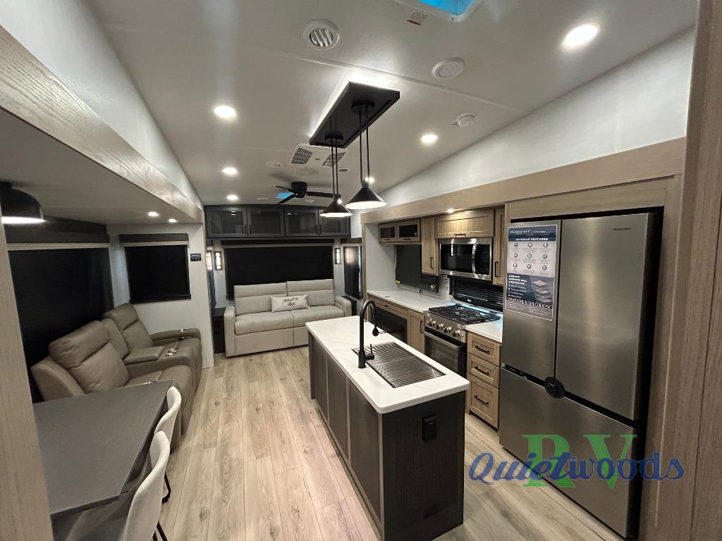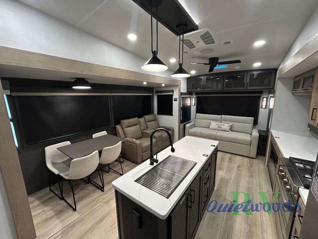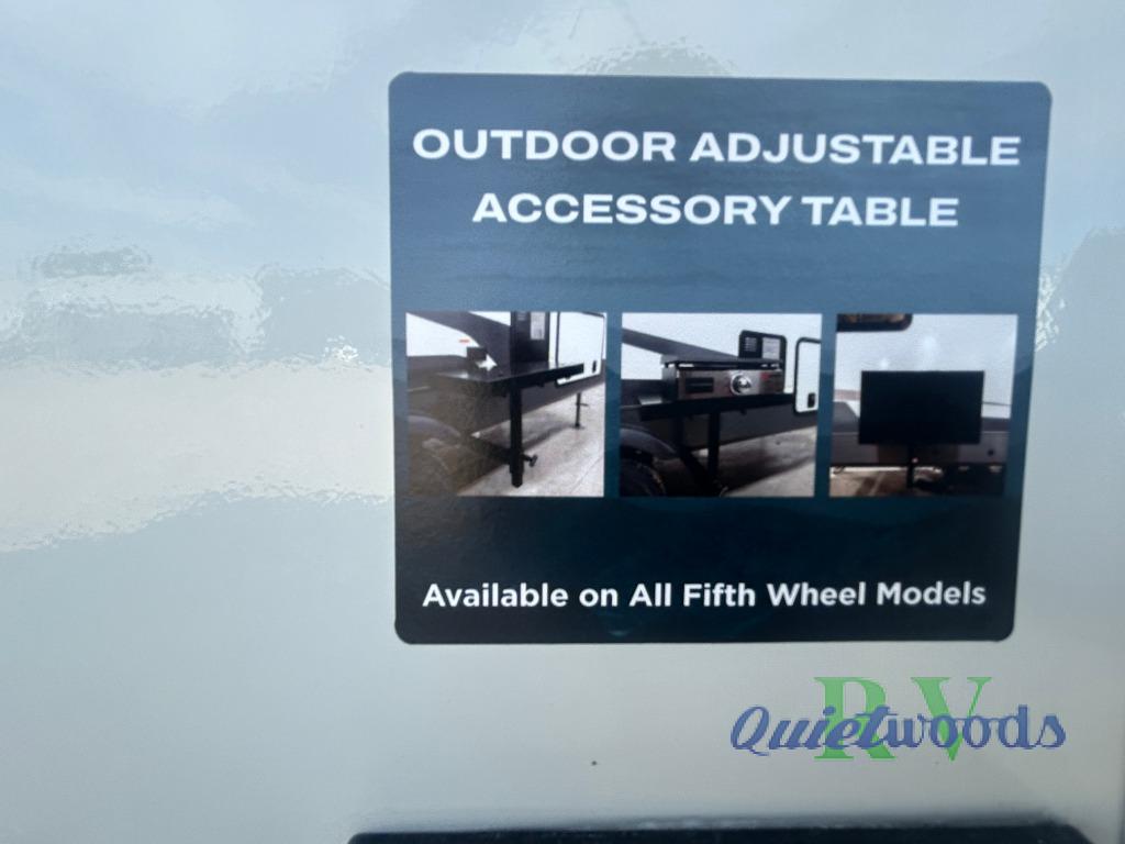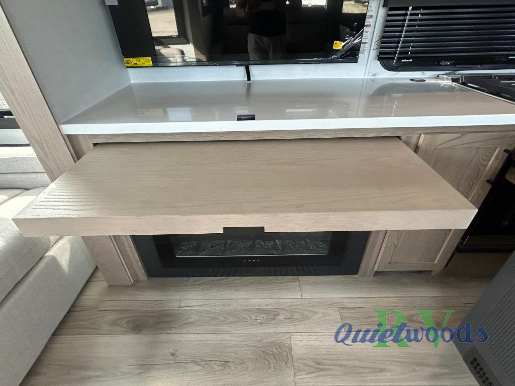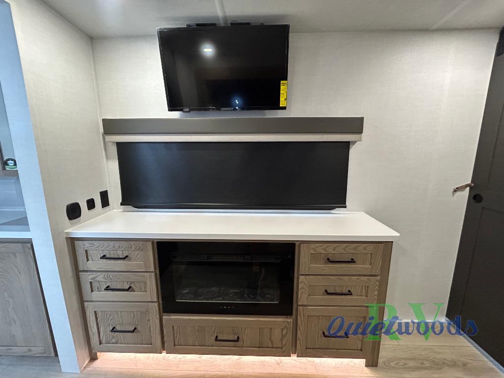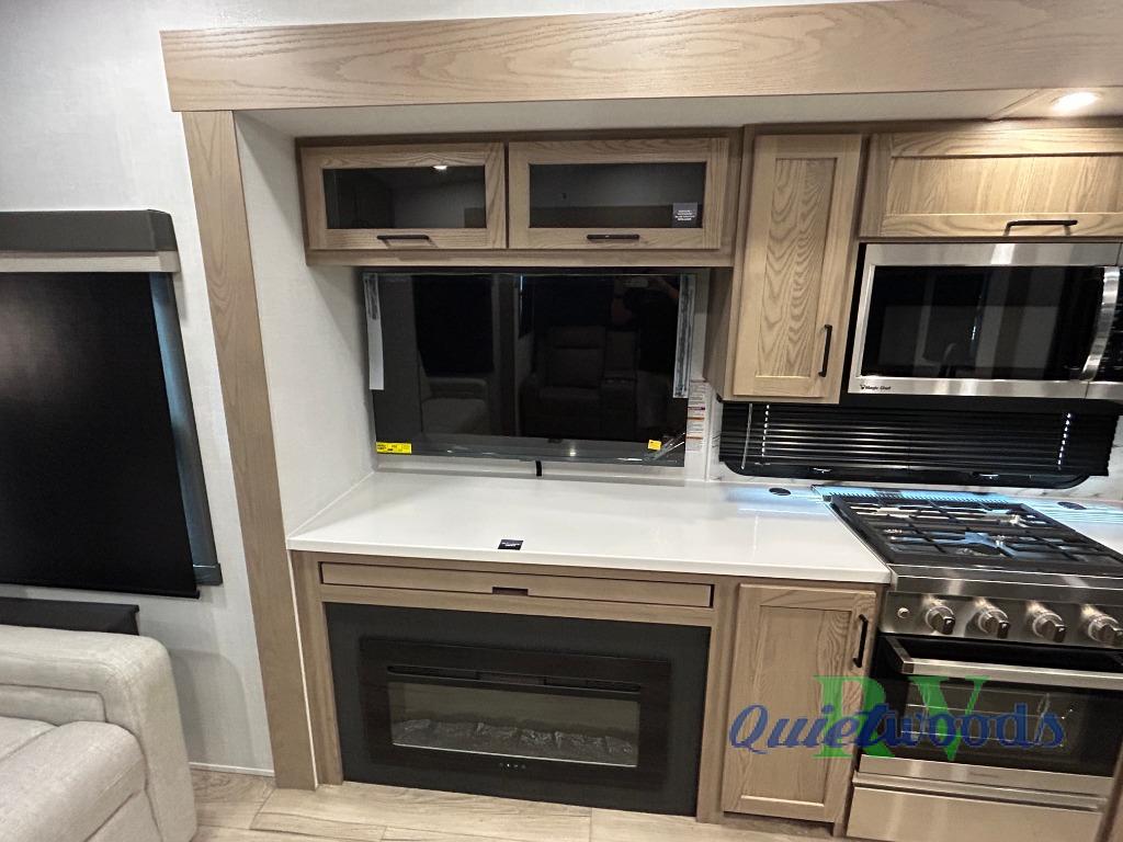 You can't go wrong when choosing this spacious fifth wheel! The master bedroom features a king bed slide out, wardrobe, and a dresser with a fireplace, and the full front bath is sure to bring comfort. There are dual bath sinks here, tons of storage, and even washer and dryer prep if you choose to add these appliances. The mid-coach half bath will come in handy if you have guests staying over on the rear hide-a-bed sofa. You'll also find a theater seat and a rotating table and chairs where you can dine and relax each day, plus there is a large kitchen island so the chef of your group has plenty of prep space. A Smart TV and fireplace will make your space feel more like home, and there is a pull-out desk here if you need to get some work done!