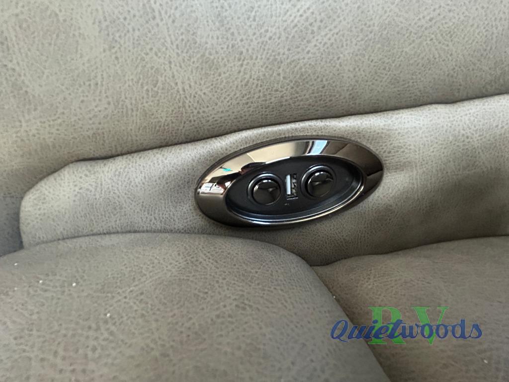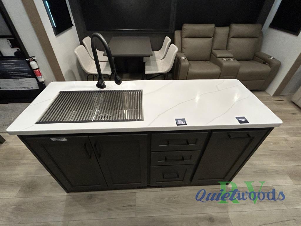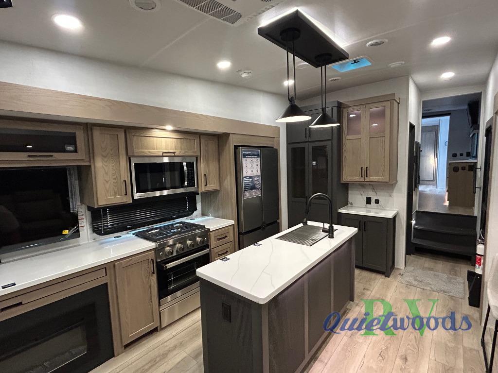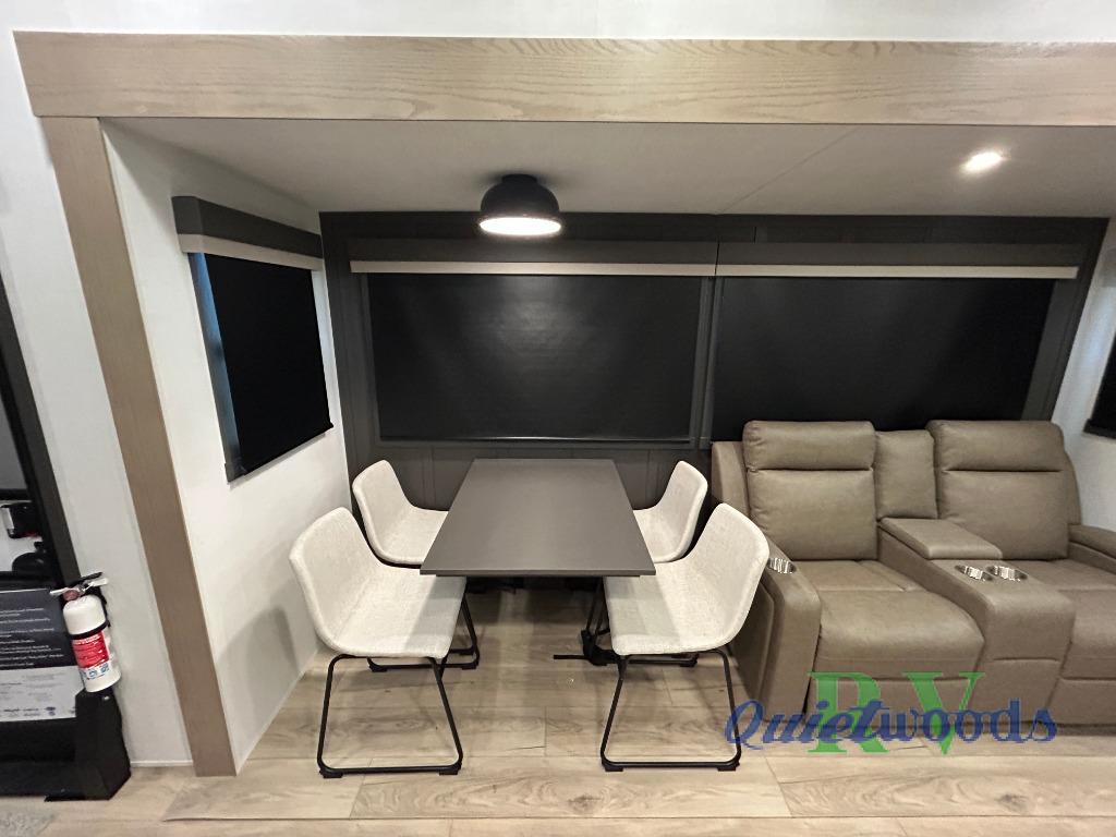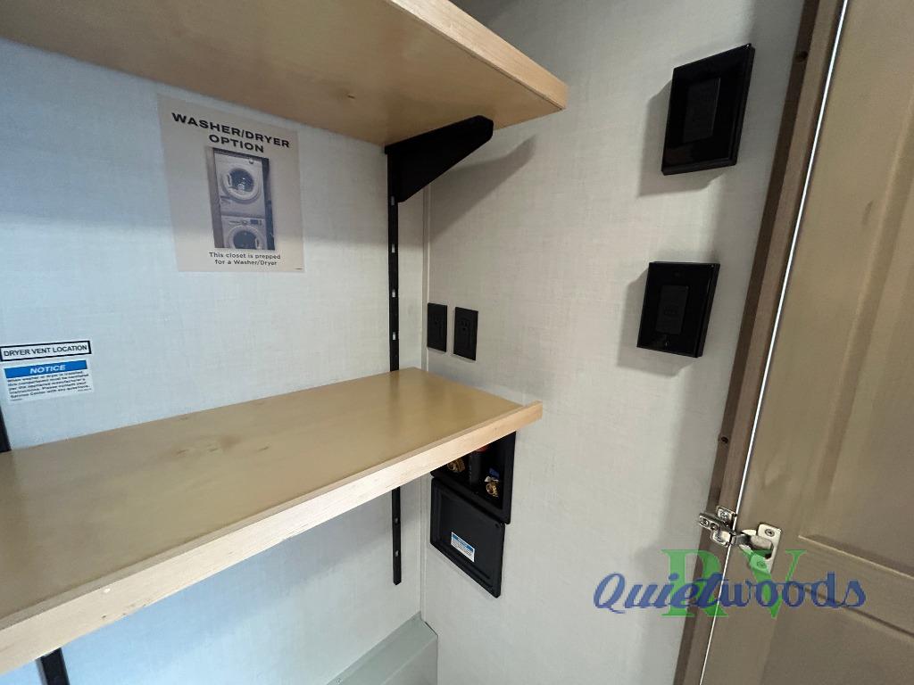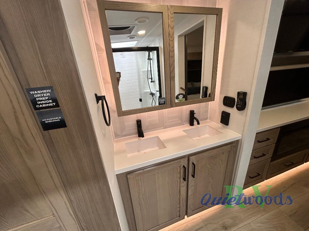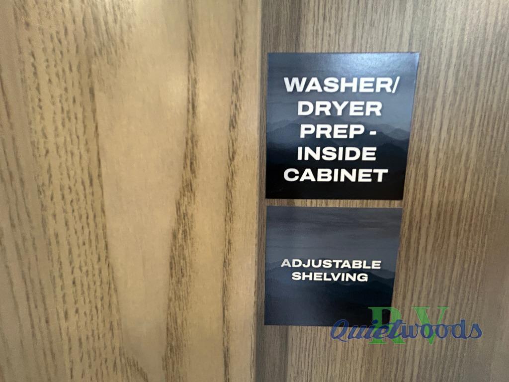 You can't go wrong when choosing this spacious fifth wheel! The master bedroom features a king bed slide out, wardrobe, and a dresser with a fireplace, and the full front bath is sure to bring comfort. There are dual bath sinks here, tons of storage, and even washer and dryer prep if you choose to add these appliances. The mid-coach half bath will come in handy if you have guests staying over on the rear hide-a-bed sofa. You'll also find a theater seat and a rotating table and chairs where you can dine and relax each day, plus there is a large kitchen island so the chef of your group has plenty of prep space. A Smart TV and fireplace will make your space feel more like home, and there is a pull-out desk here if you need to get some work done!