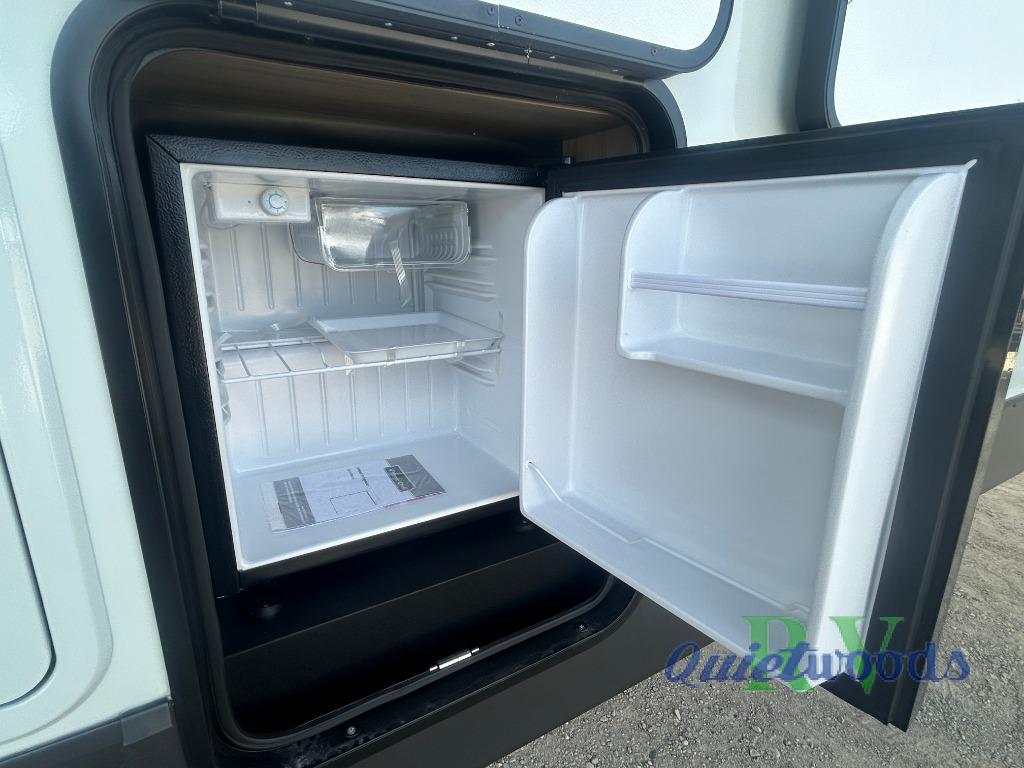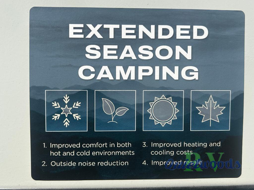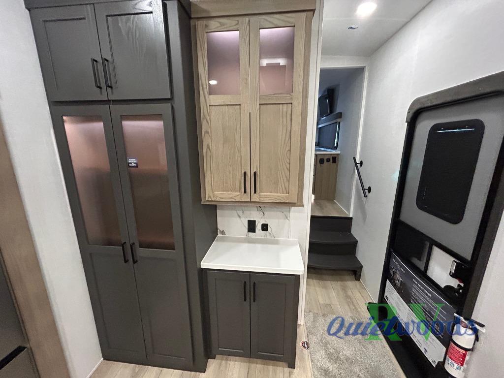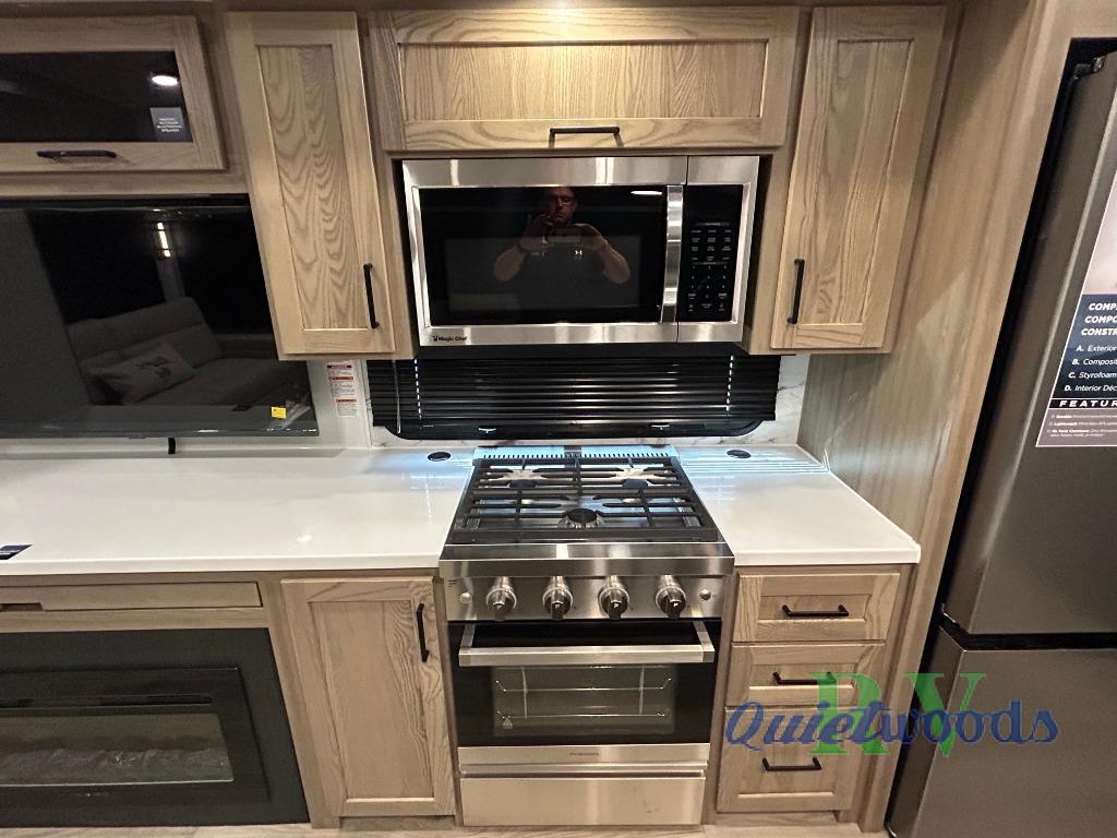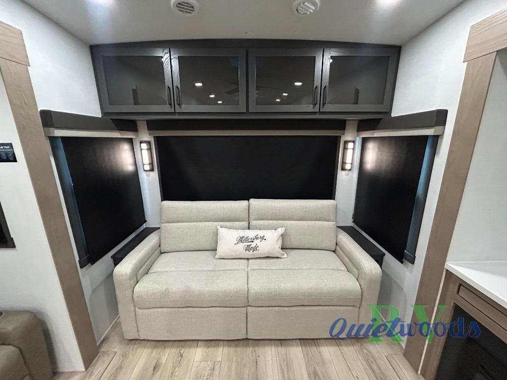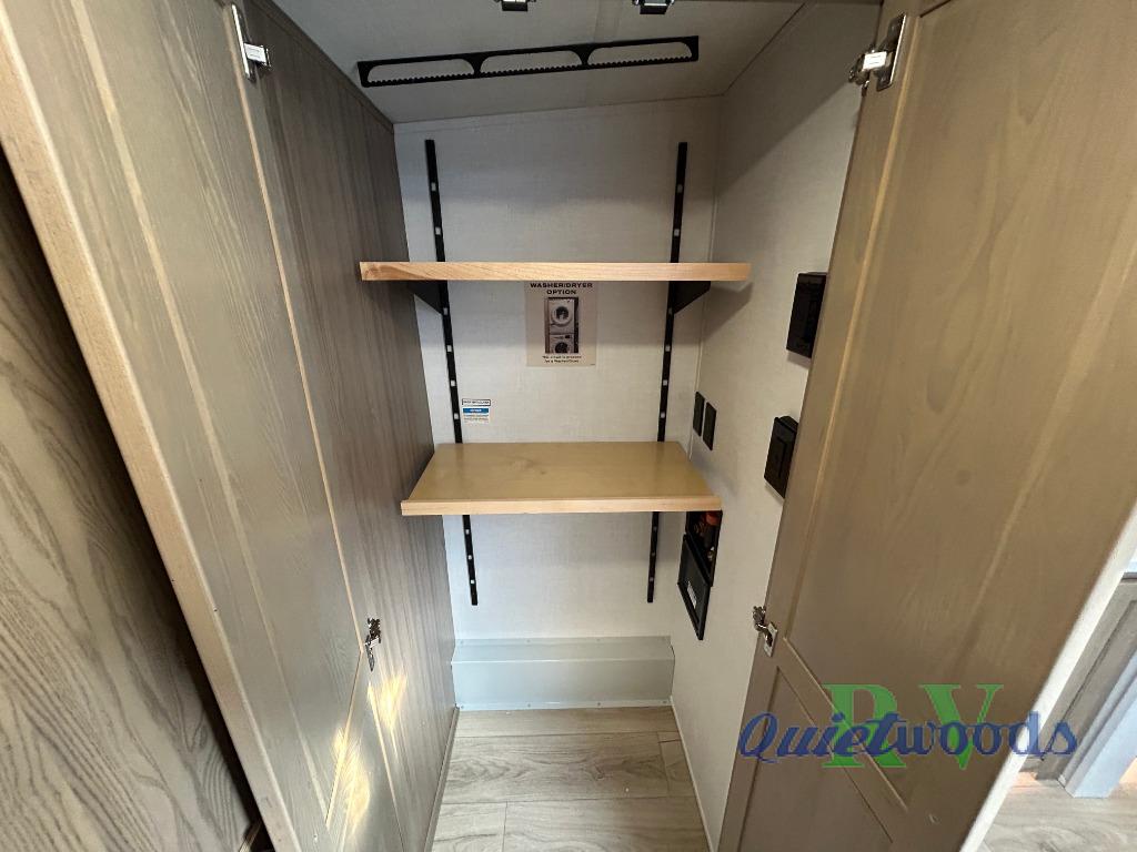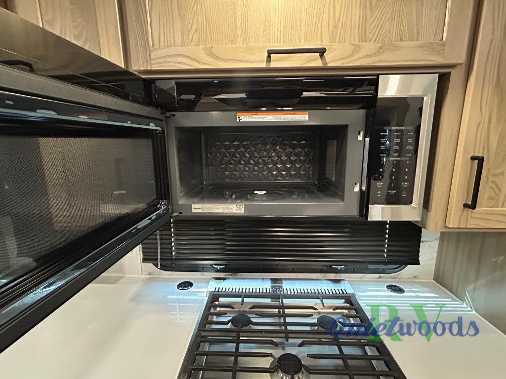 You can't go wrong when choosing this spacious fifth wheel! The master bedroom features a king bed slide out, wardrobe, and a dresser with a fireplace, and the full front bath is sure to bring comfort. There are dual bath sinks here, tons of storage, and even washer and dryer prep if you choose to add these appliances. The mid-coach half bath will come in handy if you have guests staying over on the rear hide-a-bed sofa. You'll also find a theater seat and a rotating table and chairs where you can dine and relax each day, plus there is a large kitchen island so the chef of your group has plenty of prep space. A Smart TV and fireplace will make your space feel more like home, and there is a pull-out desk here if you need to get some work done!
