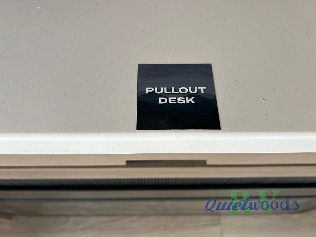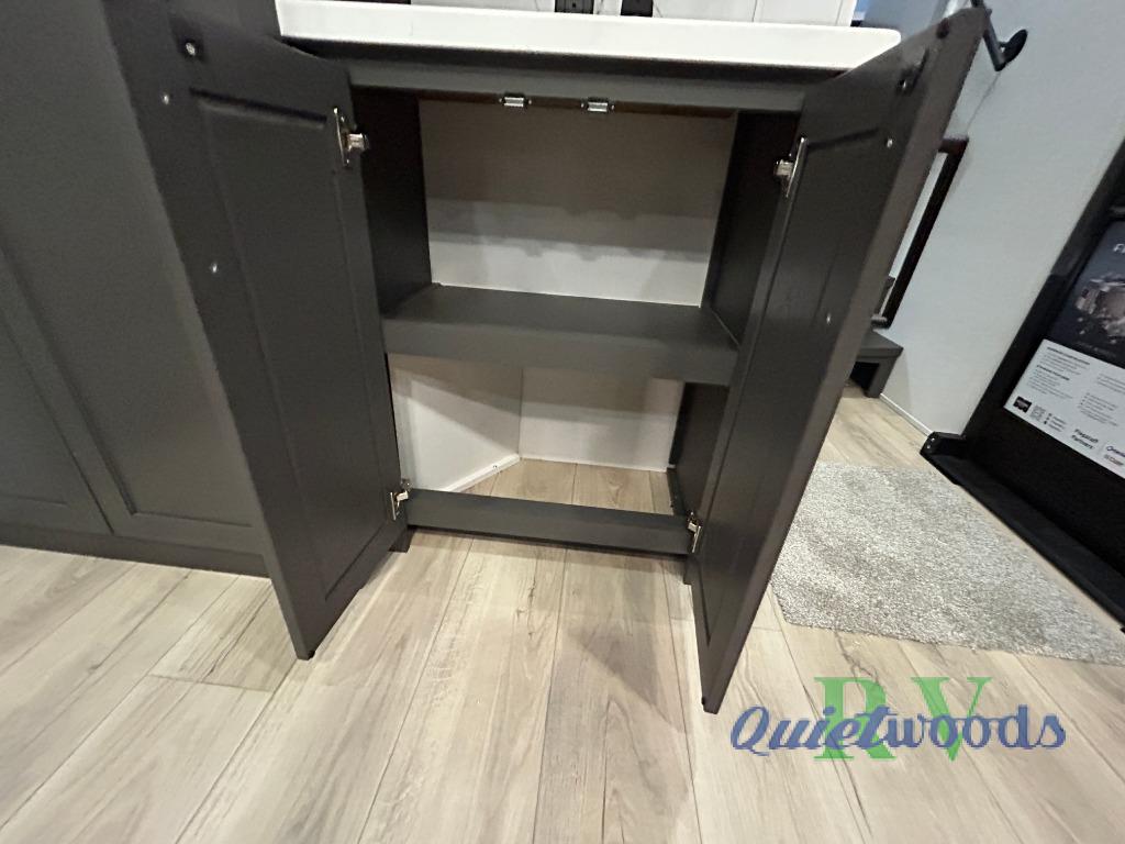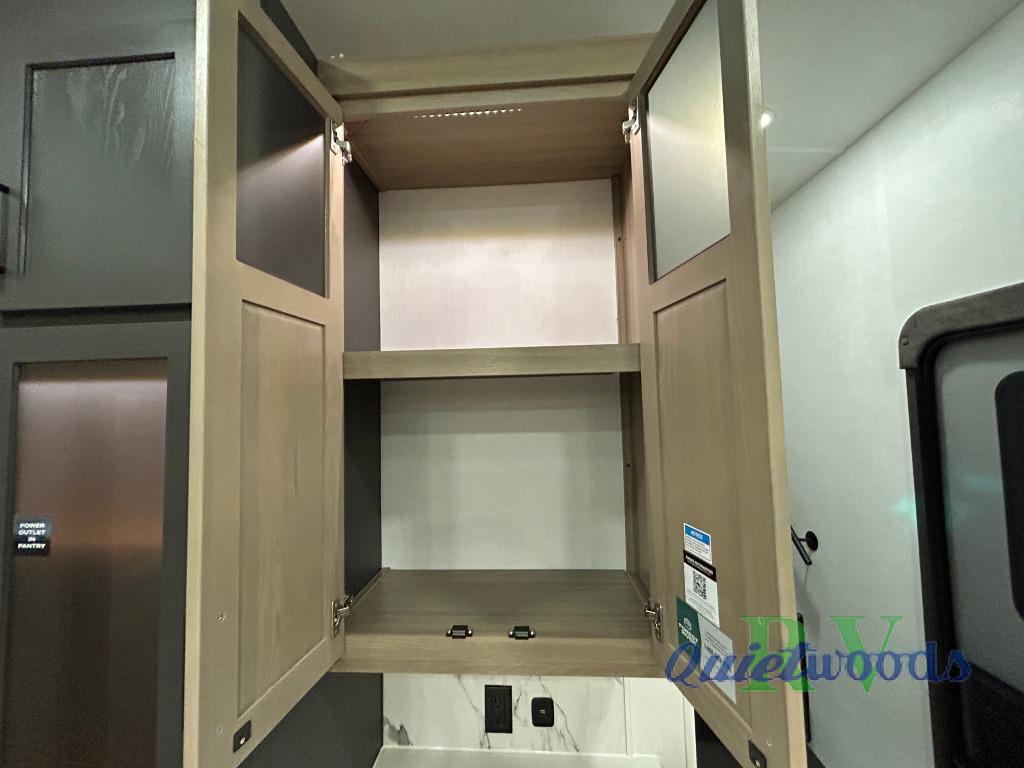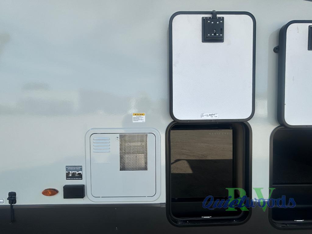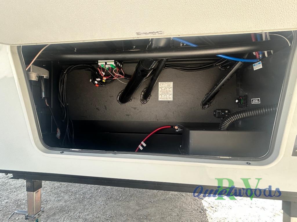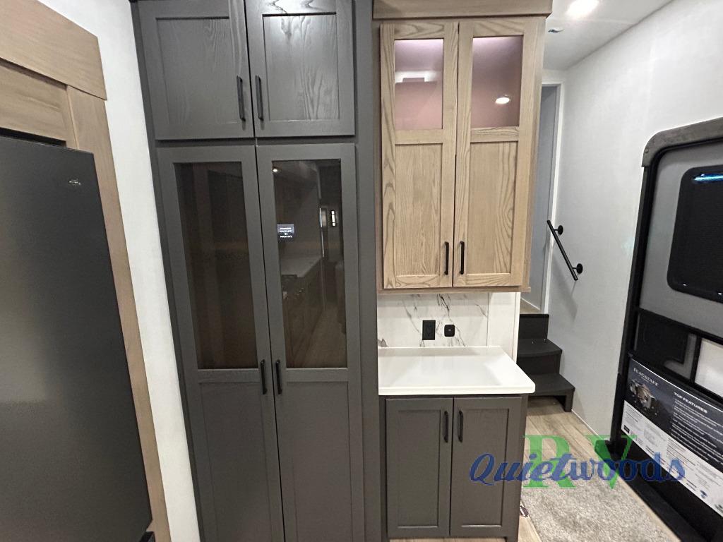 You can't go wrong when choosing this spacious fifth wheel! The master bedroom features a king bed slide out, wardrobe, and a dresser with a fireplace, and the full front bath is sure to bring comfort. There are dual bath sinks here, tons of storage, and even washer and dryer prep if you choose to add these appliances. The mid-coach half bath will come in handy if you have guests staying over on the rear hide-a-bed sofa. You'll also find a theater seat and a rotating table and chairs where you can dine and relax each day, plus there is a large kitchen island so the chef of your group has plenty of prep space. A Smart TV and fireplace will make your space feel more like home, and there is a pull-out desk here if you need to get some work done!