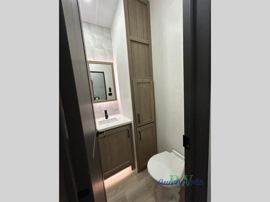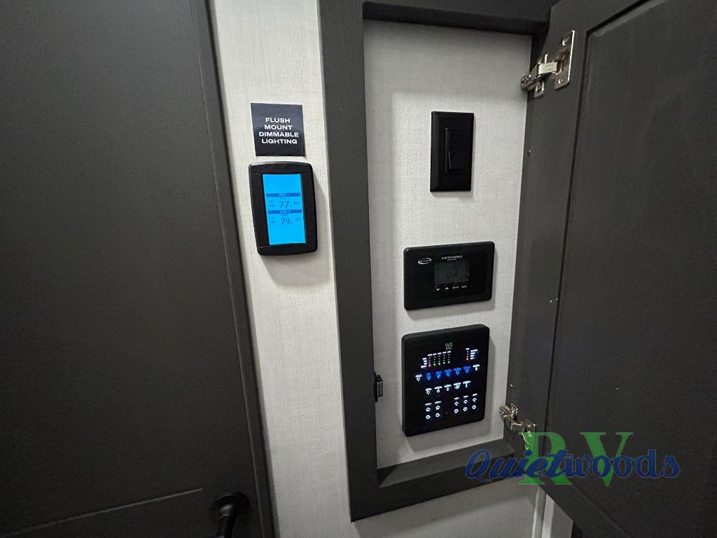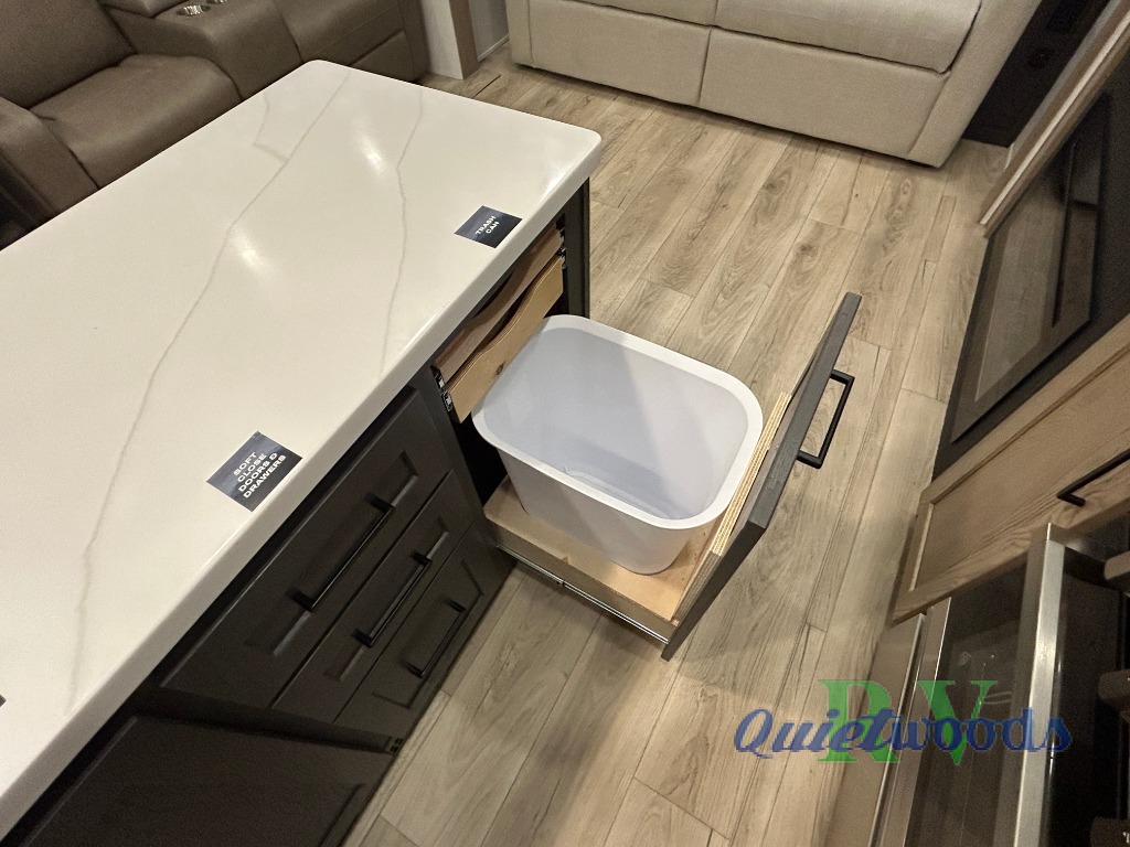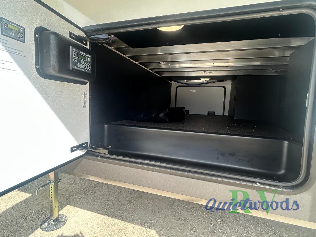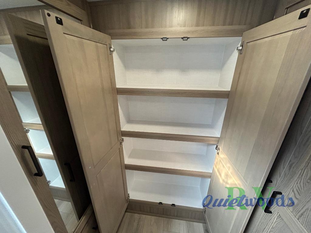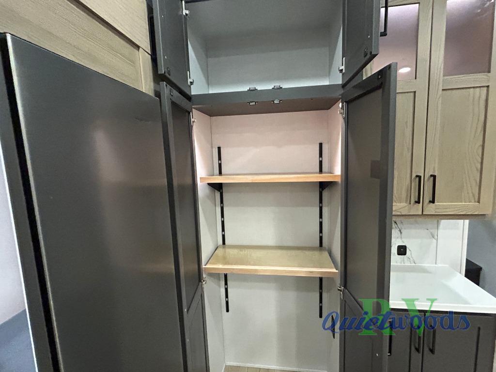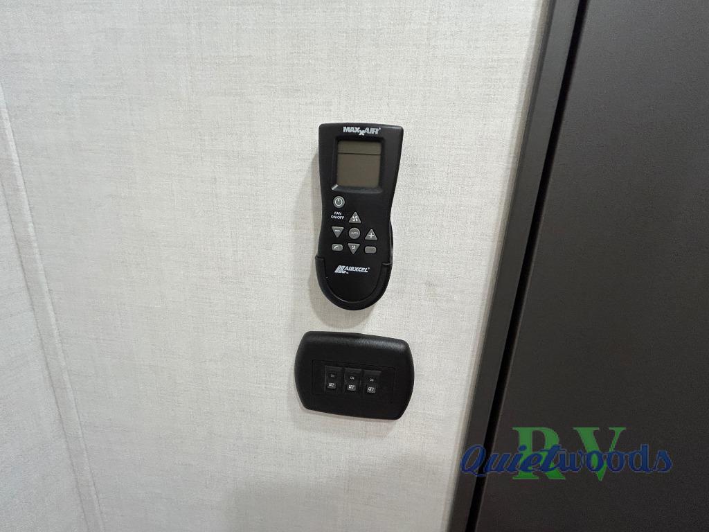 You can't go wrong when choosing this spacious fifth wheel! The master bedroom features a king bed slide out, wardrobe, and a dresser with a fireplace, and the full front bath is sure to bring comfort. There are dual bath sinks here, tons of storage, and even washer and dryer prep if you choose to add these appliances. The mid-coach half bath will come in handy if you have guests staying over on the rear hide-a-bed sofa. You'll also find a theater seat and a rotating table and chairs where you can dine and relax each day, plus there is a large kitchen island so the chef of your group has plenty of prep space. A Smart TV and fireplace will make your space feel more like home, and there is a pull-out desk here if you need to get some work done!