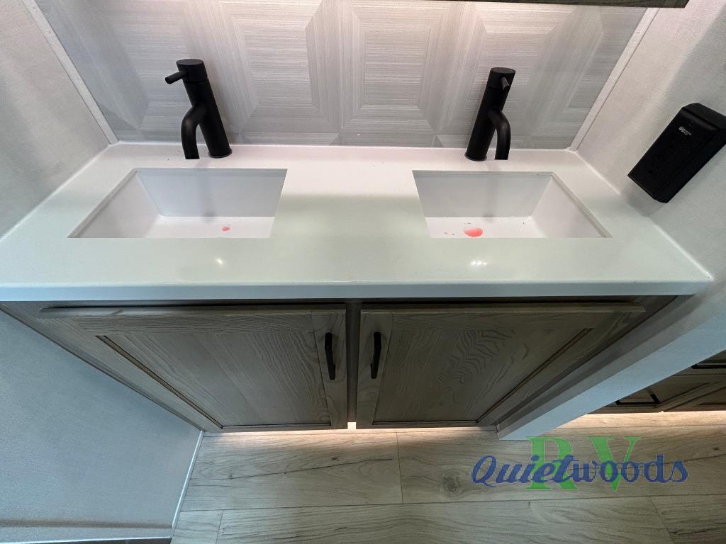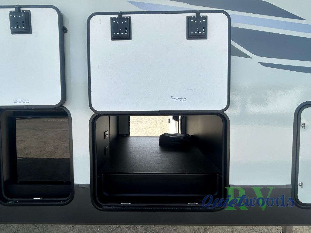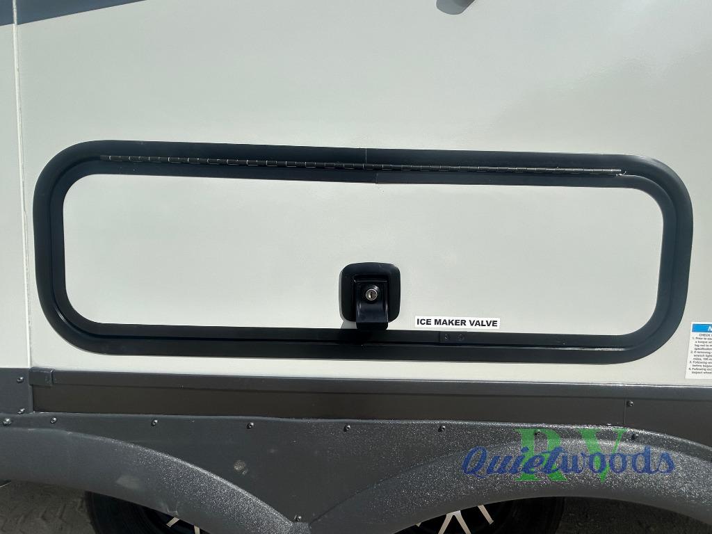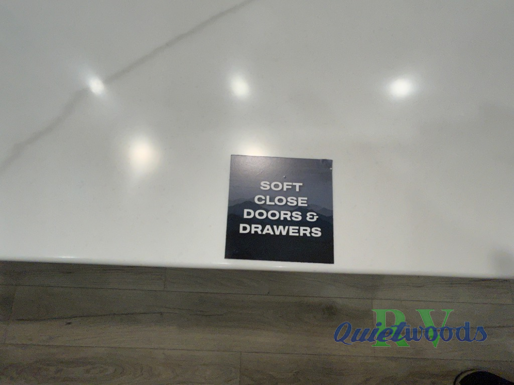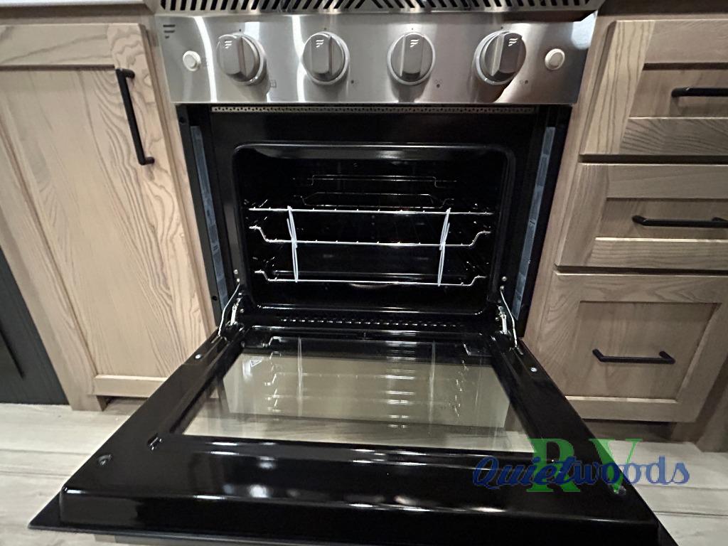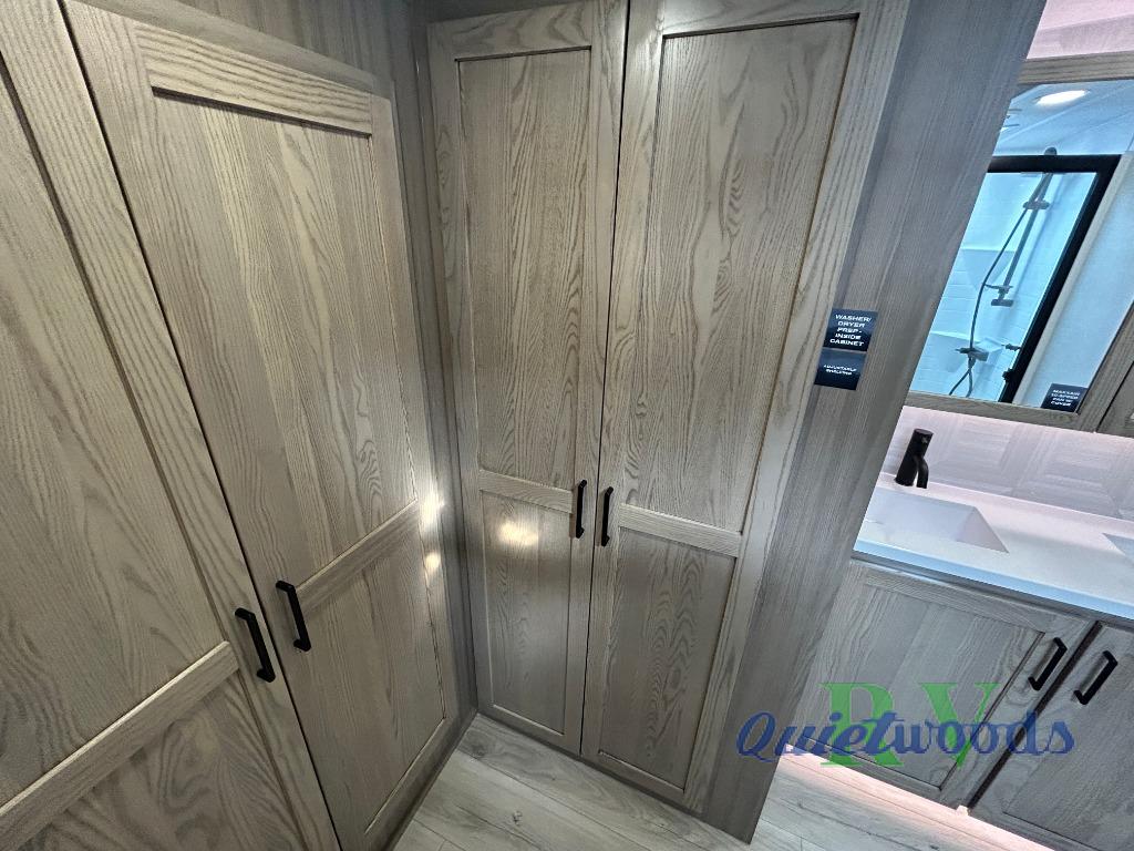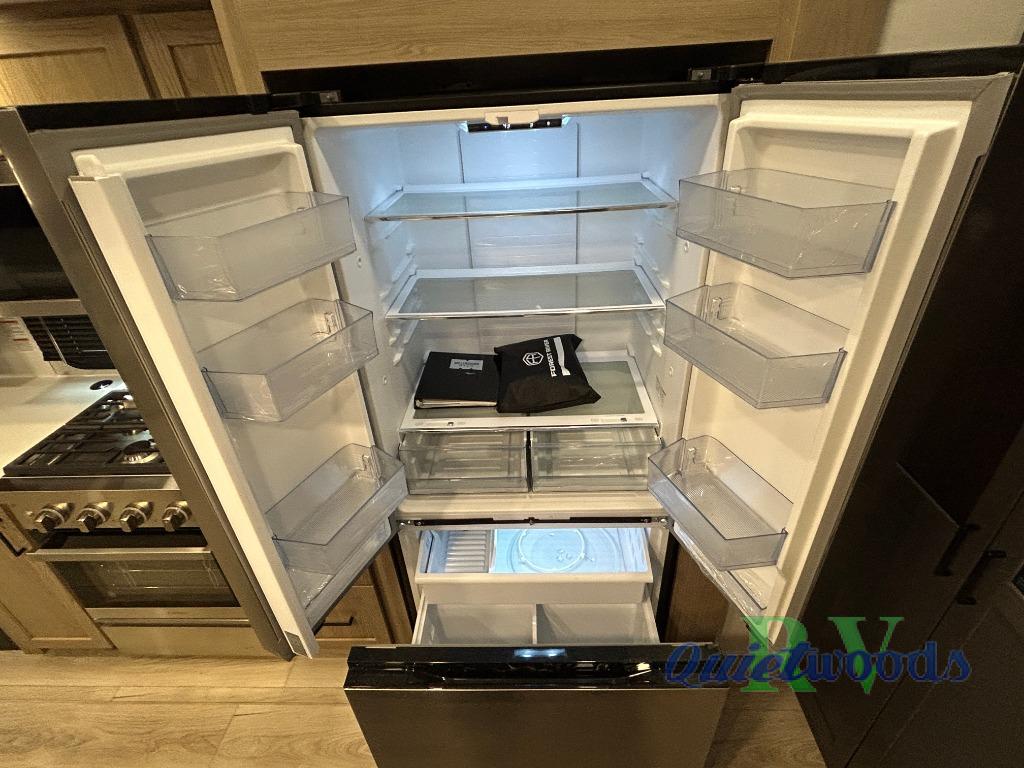 You can't go wrong when choosing this spacious fifth wheel! The master bedroom features a king bed slide out, wardrobe, and a dresser with a fireplace, and the full front bath is sure to bring comfort. There are dual bath sinks here, tons of storage, and even washer and dryer prep if you choose to add these appliances. The mid-coach half bath will come in handy if you have guests staying over on the rear hide-a-bed sofa. You'll also find a theater seat and a rotating table and chairs where you can dine and relax each day, plus there is a large kitchen island so the chef of your group has plenty of prep space. A Smart TV and fireplace will make your space feel more like home, and there is a pull-out desk here if you need to get some work done!