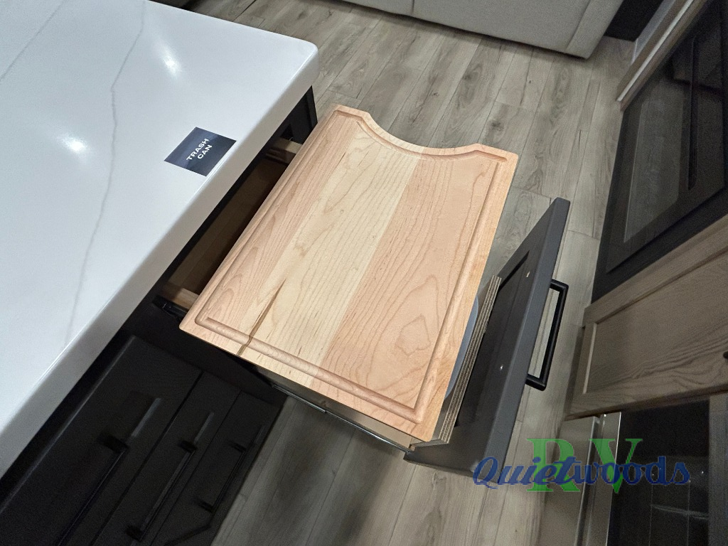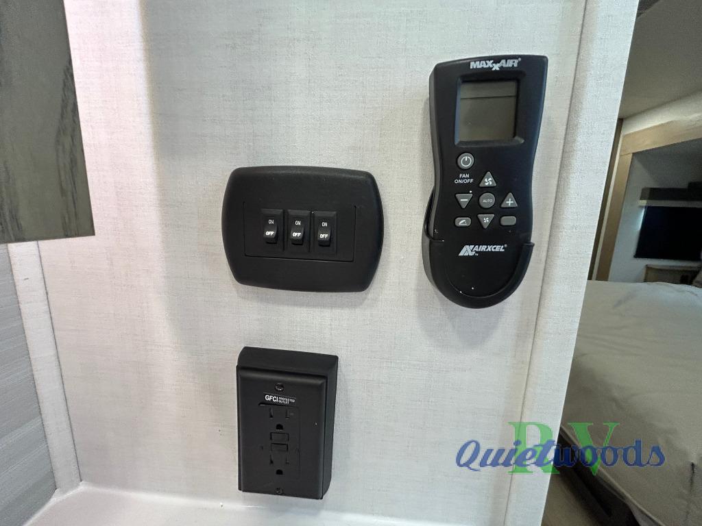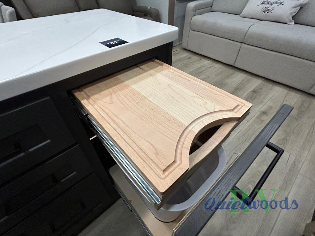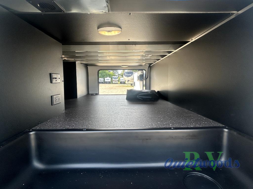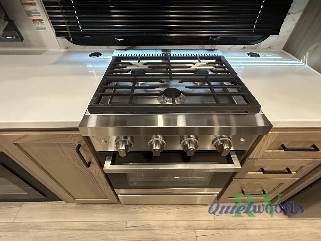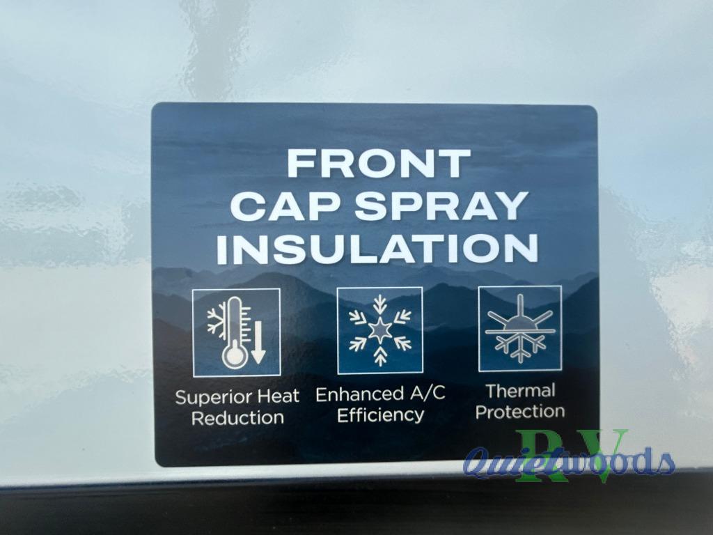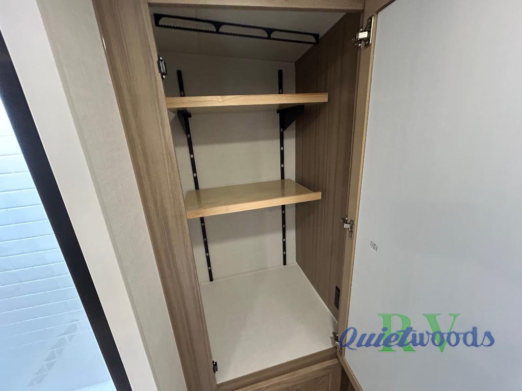 You can't go wrong when choosing this spacious fifth wheel! The master bedroom features a king bed slide out, wardrobe, and a dresser with a fireplace, and the full front bath is sure to bring comfort. There are dual bath sinks here, tons of storage, and even washer and dryer prep if you choose to add these appliances. The mid-coach half bath will come in handy if you have guests staying over on the rear hide-a-bed sofa. You'll also find a theater seat and a rotating table and chairs where you can dine and relax each day, plus there is a large kitchen island so the chef of your group has plenty of prep space. A Smart TV and fireplace will make your space feel more like home, and there is a pull-out desk here if you need to get some work done!