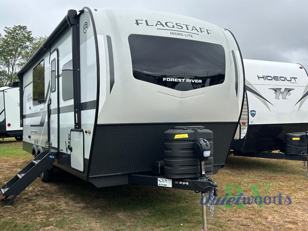 With any Flagstaff Micro Lite travel trailer by Forest River you will enjoy lightweight towing, durable construction, and added interior comforts to make each trip memorable! Each model features RoadTech tire pressure monitoring, Dexter Torflex axles, and nitrogen-filled Goodyear endurance tires for smooth towing from home to campground. The 6-sided aluminum framed construction provides a strong foundation so you can enjoy your RV for years to come, plus the radiant foil in the front cap, underbelly and slides help insulate your trailer. Additional exterior features include a 200W solar panel, back-up camera prep, frameless windows, and slam baggage doors. Each model includes the Great Expectations Package with roller shades, solid surface kitchen countertops, and hidden hinge cabinet doors. There is also an exterior hot/cold water port, outside speakers, a power tongue jack and stabilizer jacks, plus many more conveniences.