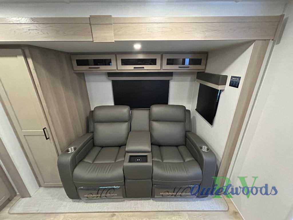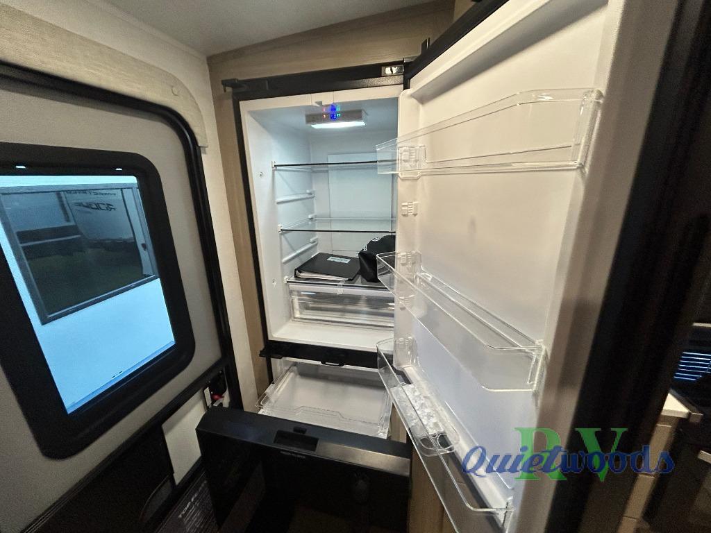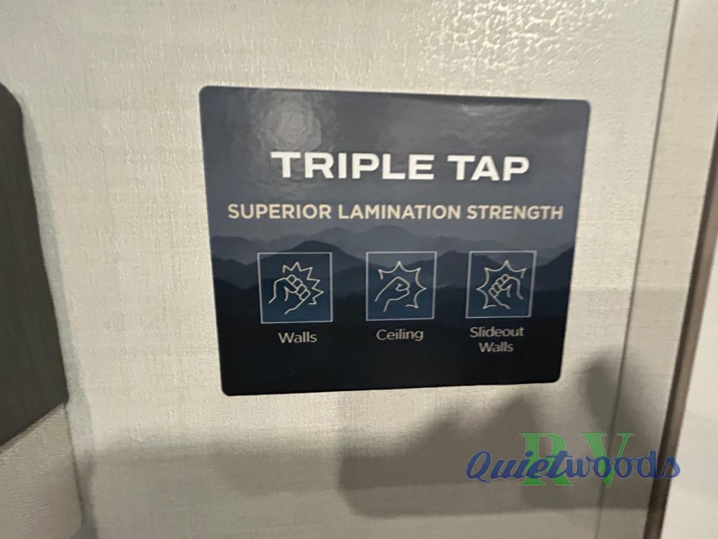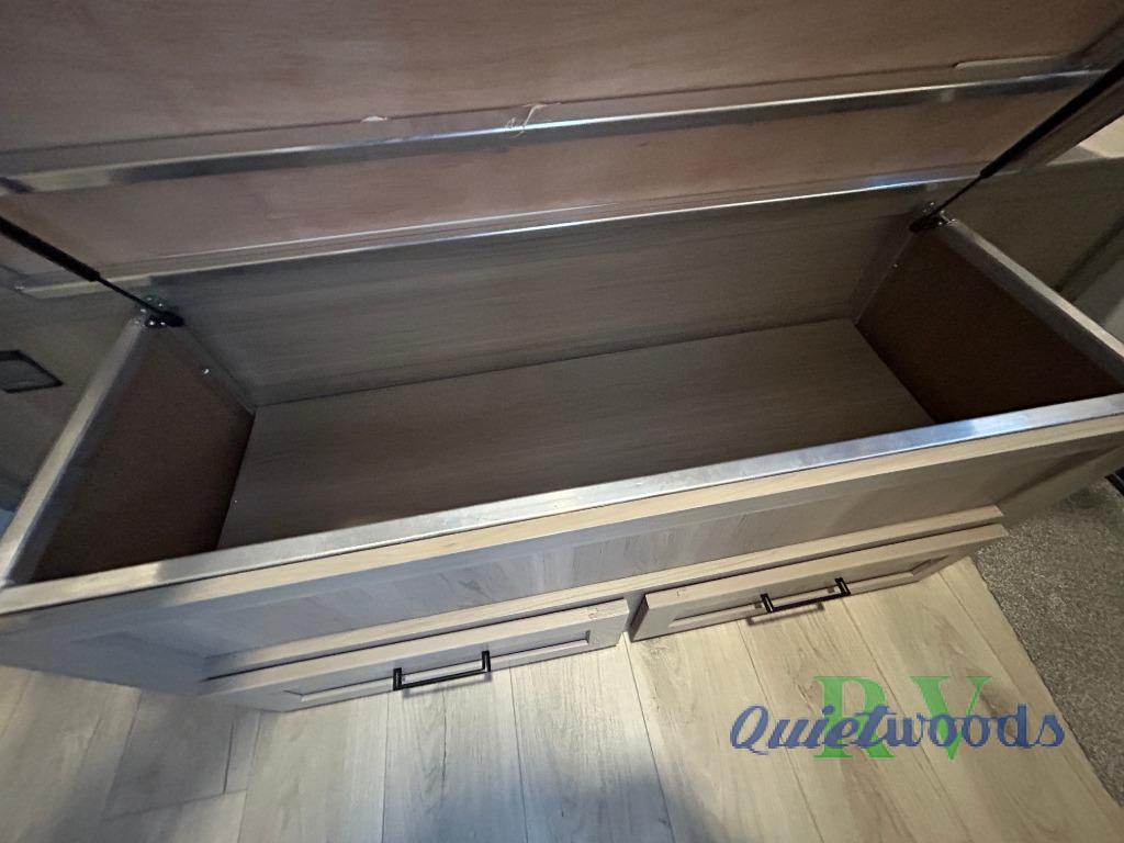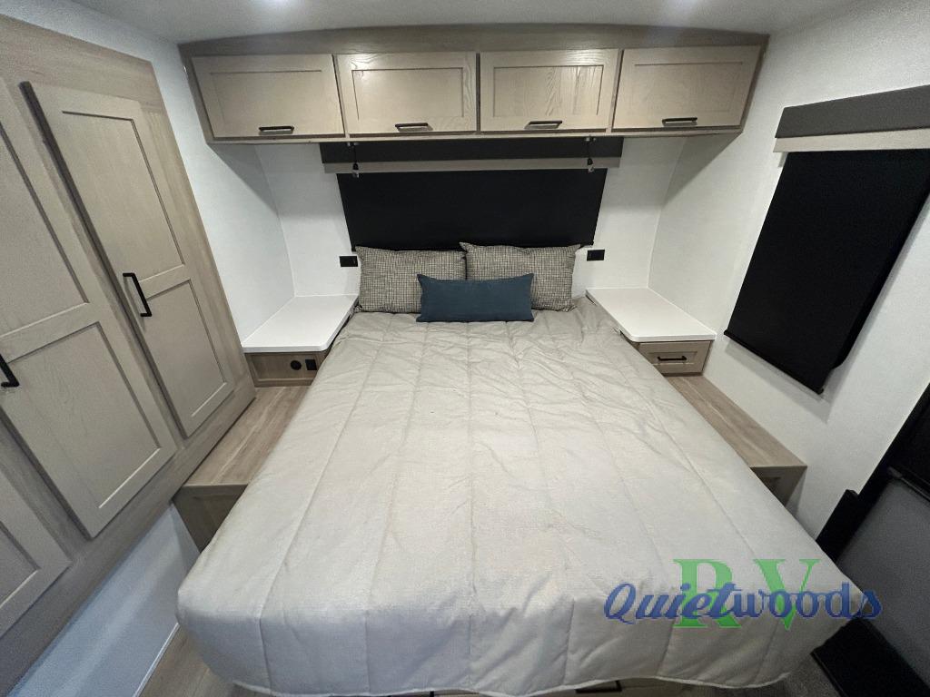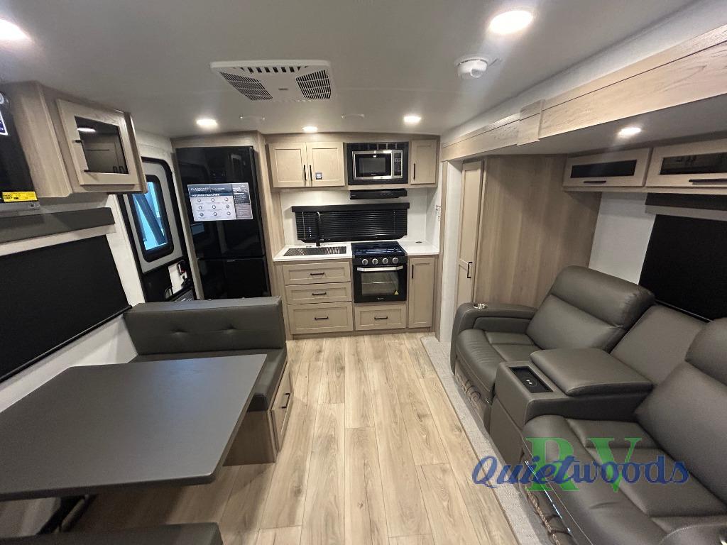 Trips to your favorite campground are made complete with this dual slide out, dual entry trailer! One entry goes straight into the front master bedroom where you'll find an RV queen bed with flip-up storage, a wardrobe slide out, and easy access into the walk-through bath. Once you're through the bath, you'll find the main living area, rear kitchen, and the second entry door at the back. Your crew can play a game at the 39" booth dinette or relax on the theater seat across from the TV. The kitchen includes everything you need to prepare meals in the morning, including a three burner cooktop and microwave oven, plus a 12V refrigerator and a pantry for food storage.