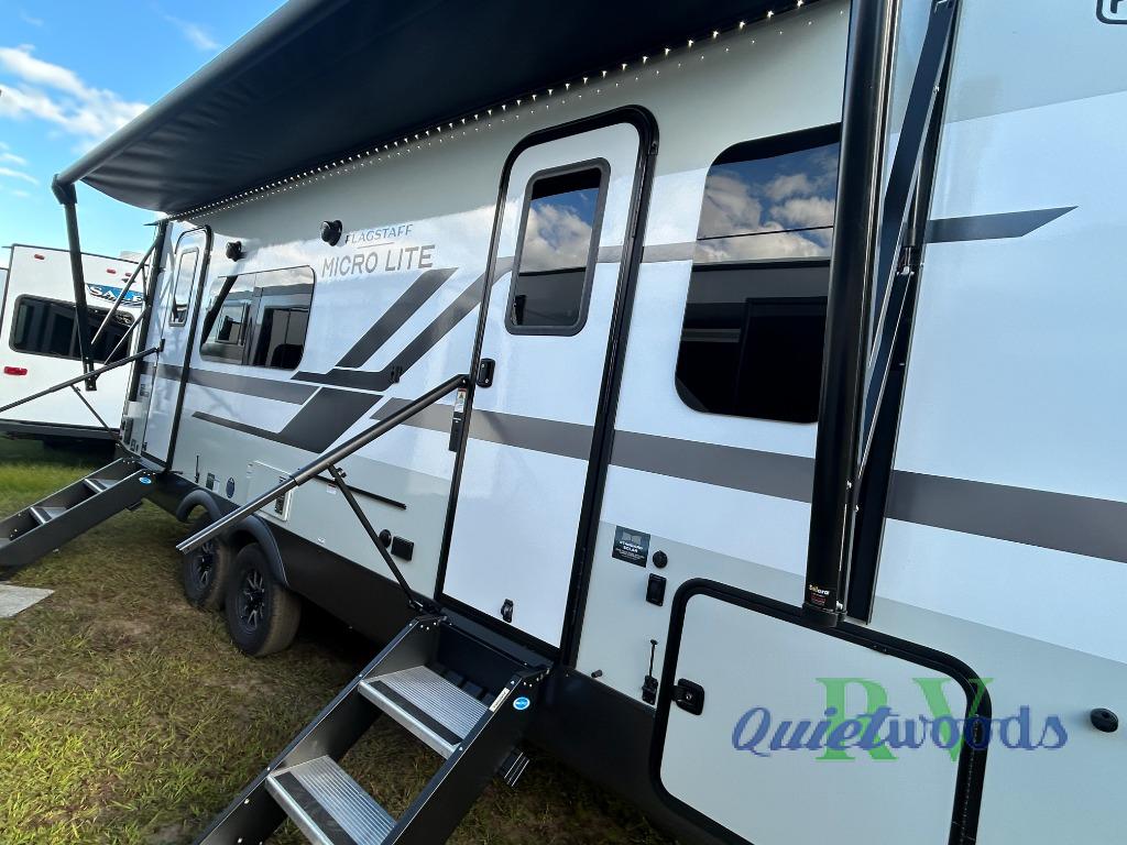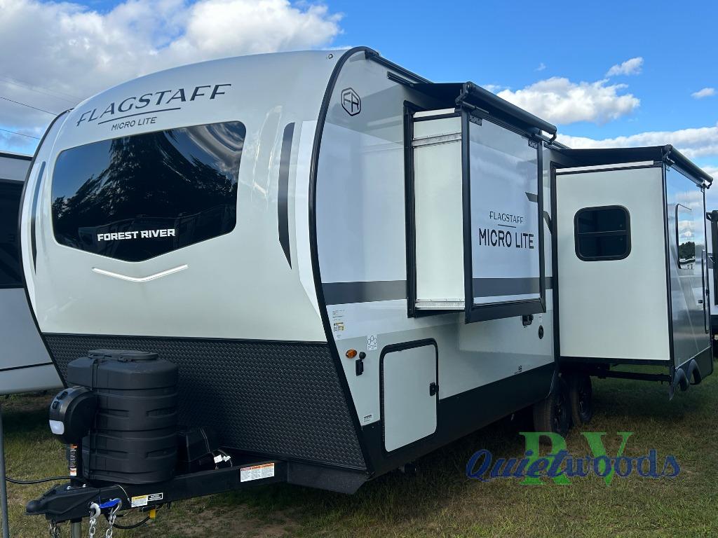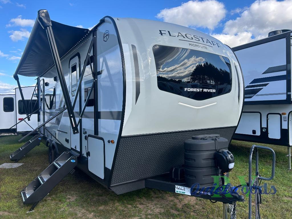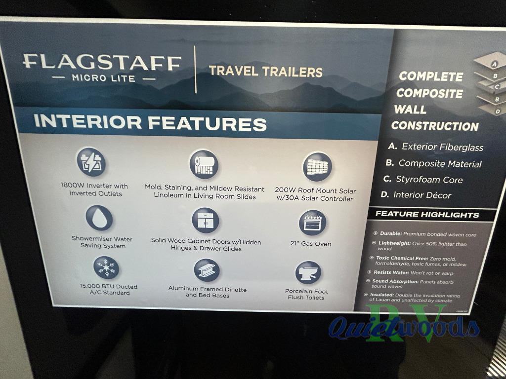 With any Flagstaff Micro Lite travel trailer by Forest River you will enjoy lightweight towing, durable construction, and added interior comforts to make each trip memorable! Each model features RoadTech tire pressure monitoring, Dexter Torflex axles, and nitrogen-filled Goodyear endurance tires for smooth towing from home to campground. The 6-sided aluminum framed construction provides a strong foundation so you can enjoy your RV for years to come, plus the radiant foil in the front cap, underbelly and slides help insulate your trailer. Additional exterior features include a 200W solar panel, back-up camera prep, frameless windows, and slam baggage doors. Each model includes the Great Expectations Package with roller shades, solid surface kitchen countertops, and hidden hinge cabinet doors. There is also an exterior hot/cold water port, outside speakers, a power tongue jack and stabilizer jacks, plus many more conveniences.