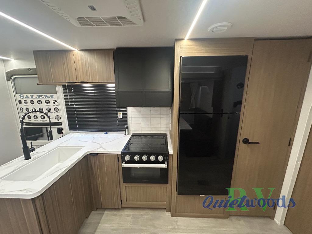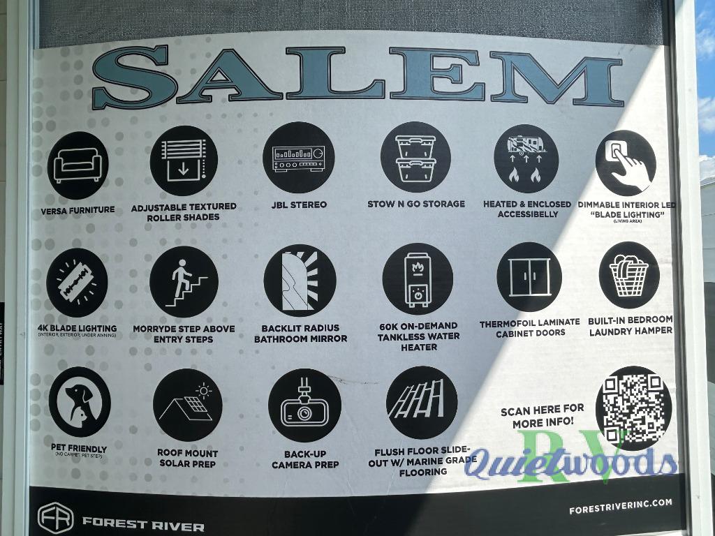 The Salem travel trailers are packed with hassle-free camping amenities! There are a variety of floorplans to choose from between three different regions. The heated and enclosed Accessibelly will help protect against the elements and debris during transport, and the exterior retro/metal redesign is sure to be eye-catching! There are stylish roller shades inside, along with updated backsplash, elegant curtain rods and curtains, plus many more interior comforts! Choose a Salem travel trailer today for quality and value!