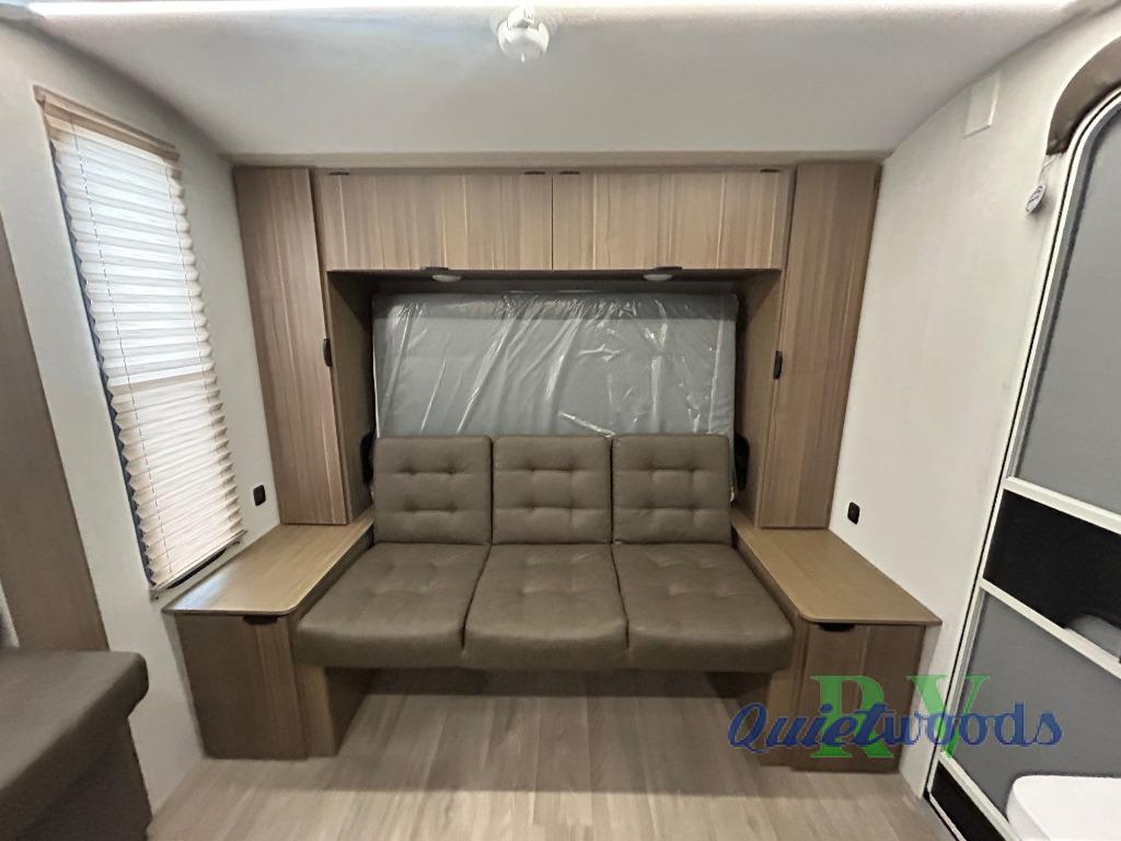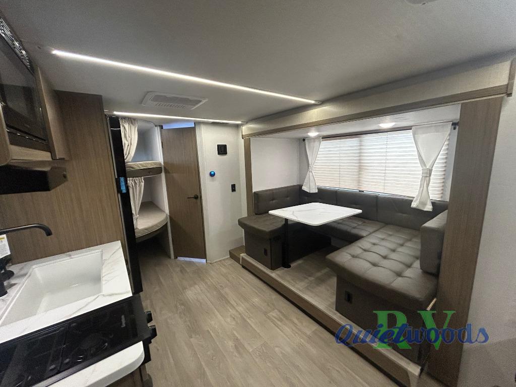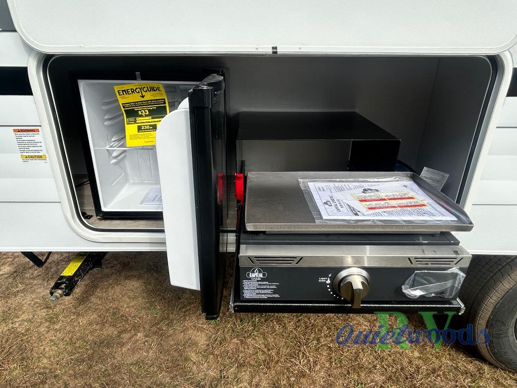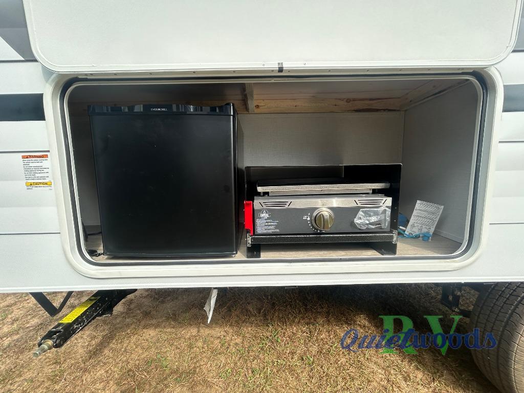 Start camping the right way in this travel trailer! It features a front Murphy bed that will double as your seating and sleeping space each day. The corner set of double-size bunk beds come with storage to keep things out of the way and are conveniently next to the rear corner bathroom with a shower with a skylight to freshen up in each morning. You can prepare your best home cooked meals indoors with the two burner cooktop or head to the outside kitchen to fry up some burgers while breathing in some fresh air. Enjoy your meals, play card games, and even sleep at the U-shaped dinette slide. You will also appreciate the outside shower and the exterior full pass-through storage for camp gear!