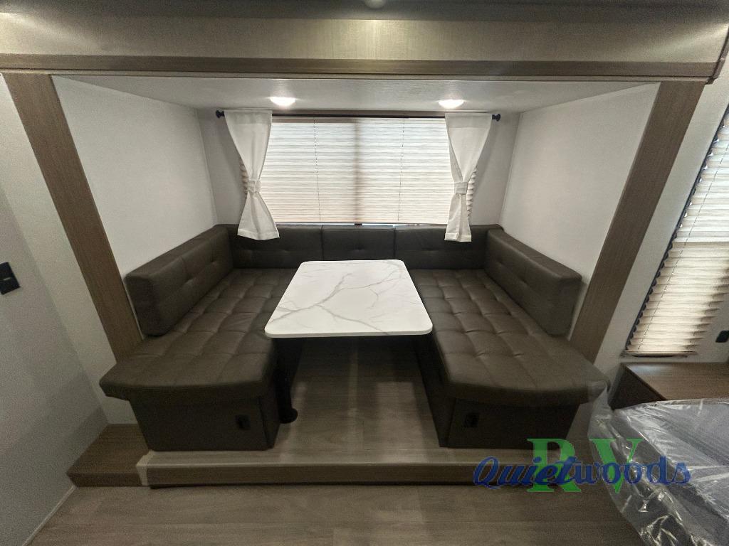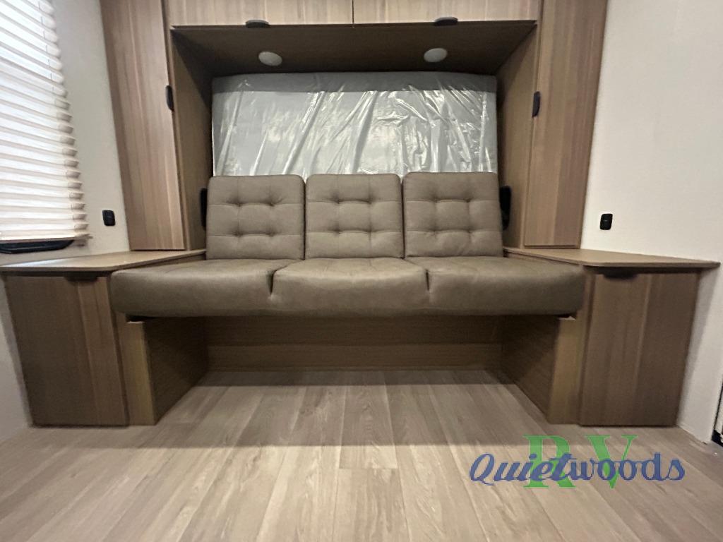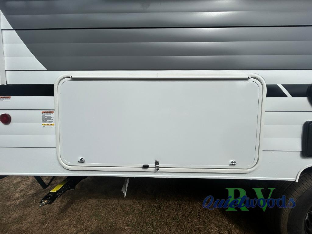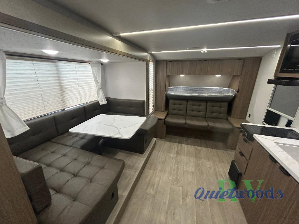 Start camping the right way in this travel trailer! It features a front Murphy bed that will double as your seating and sleeping space each day. The corner set of double-size bunk beds come with storage to keep things out of the way and are conveniently next to the rear corner bathroom with a shower with a skylight to freshen up in each morning. You can prepare your best home cooked meals indoors with the two burner cooktop or head to the outside kitchen to fry up some burgers while breathing in some fresh air. Enjoy your meals, play card games, and even sleep at the U-shaped dinette slide. You will also appreciate the outside shower and the exterior full pass-through storage for camp gear!
