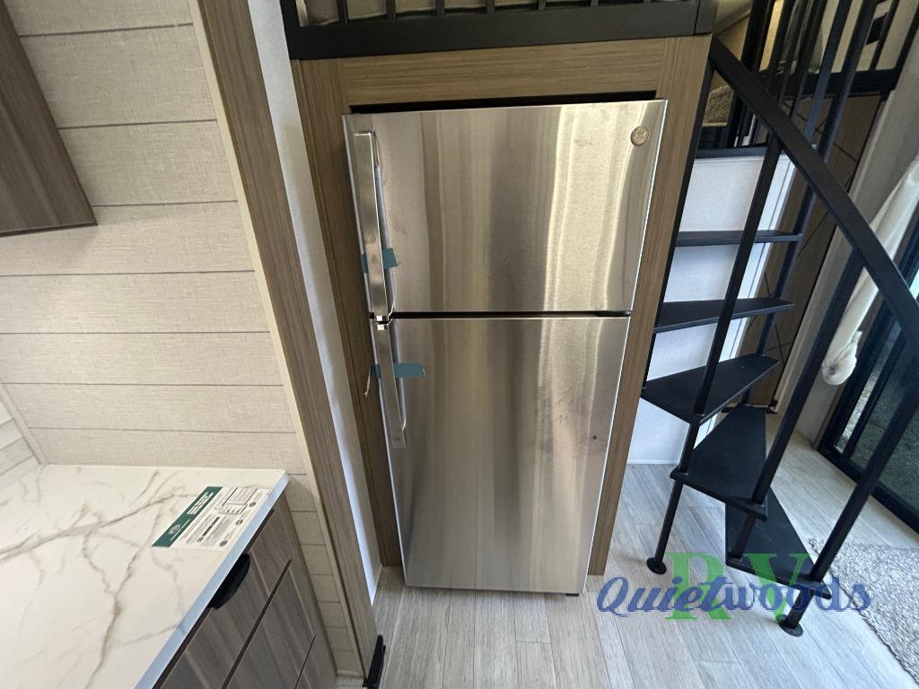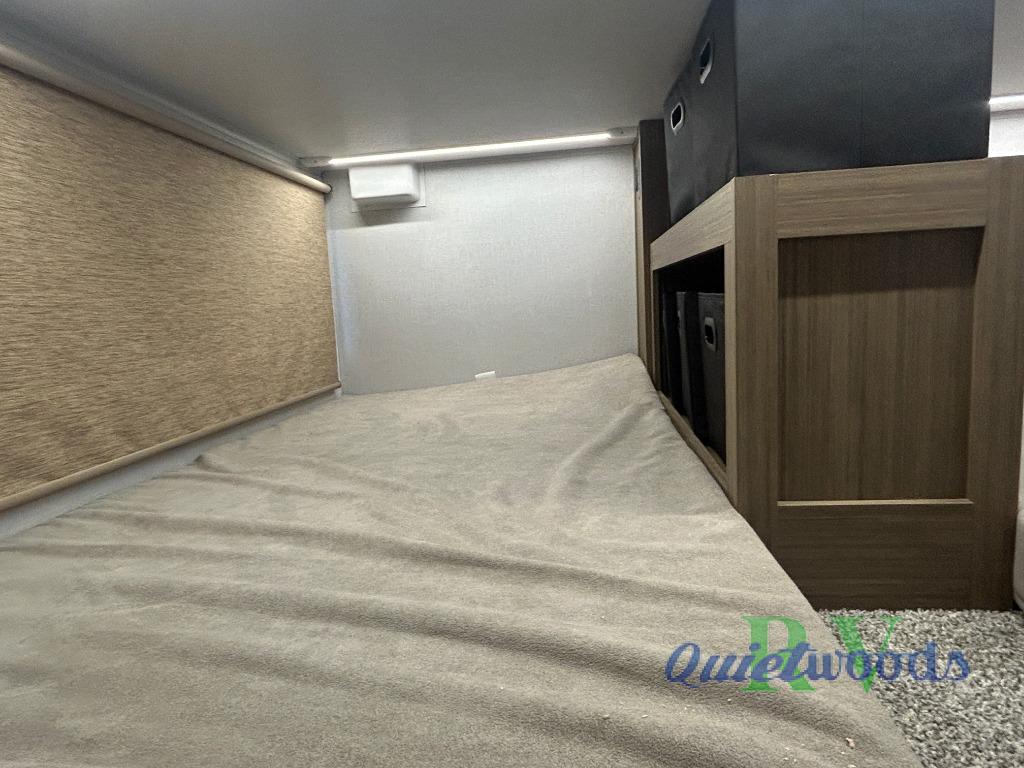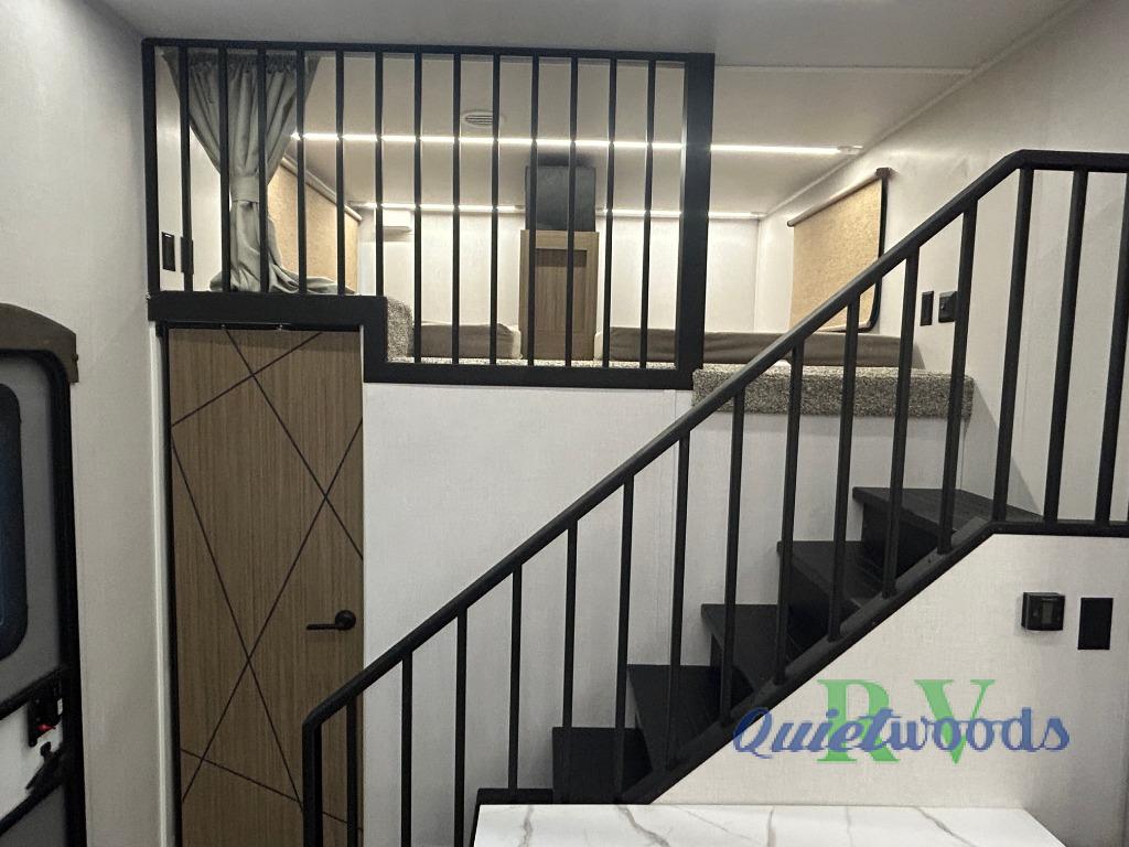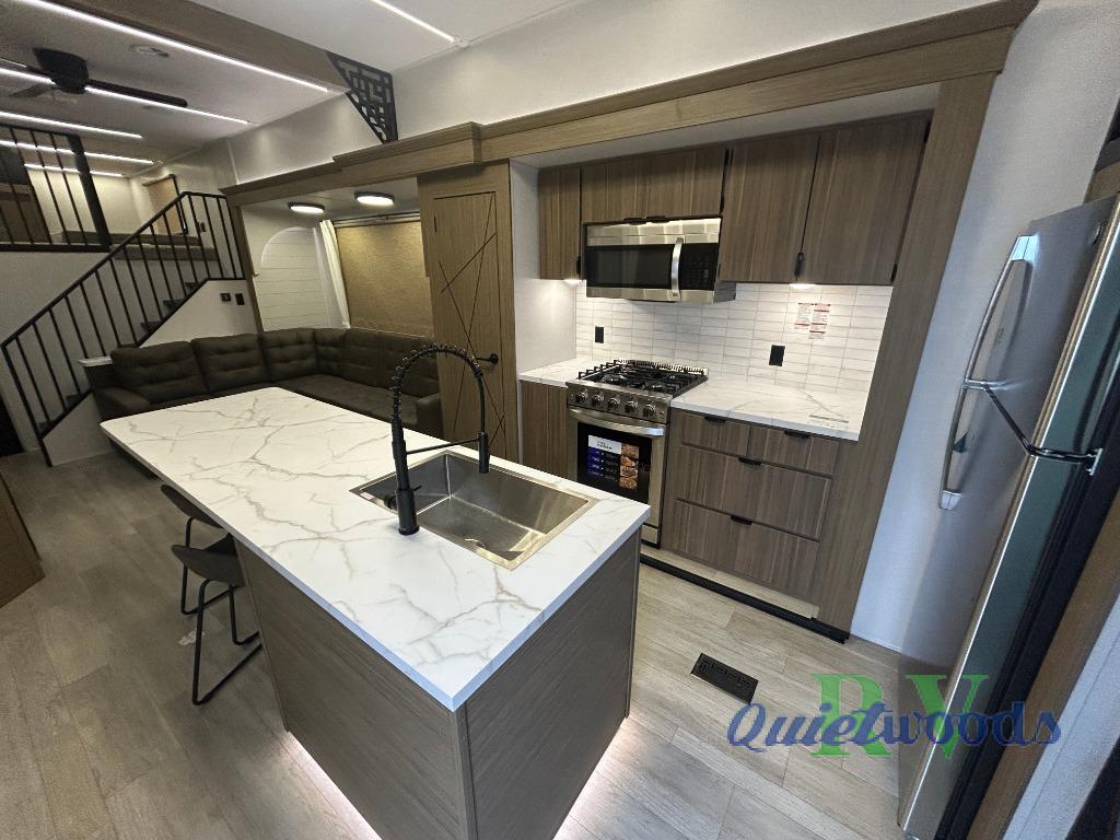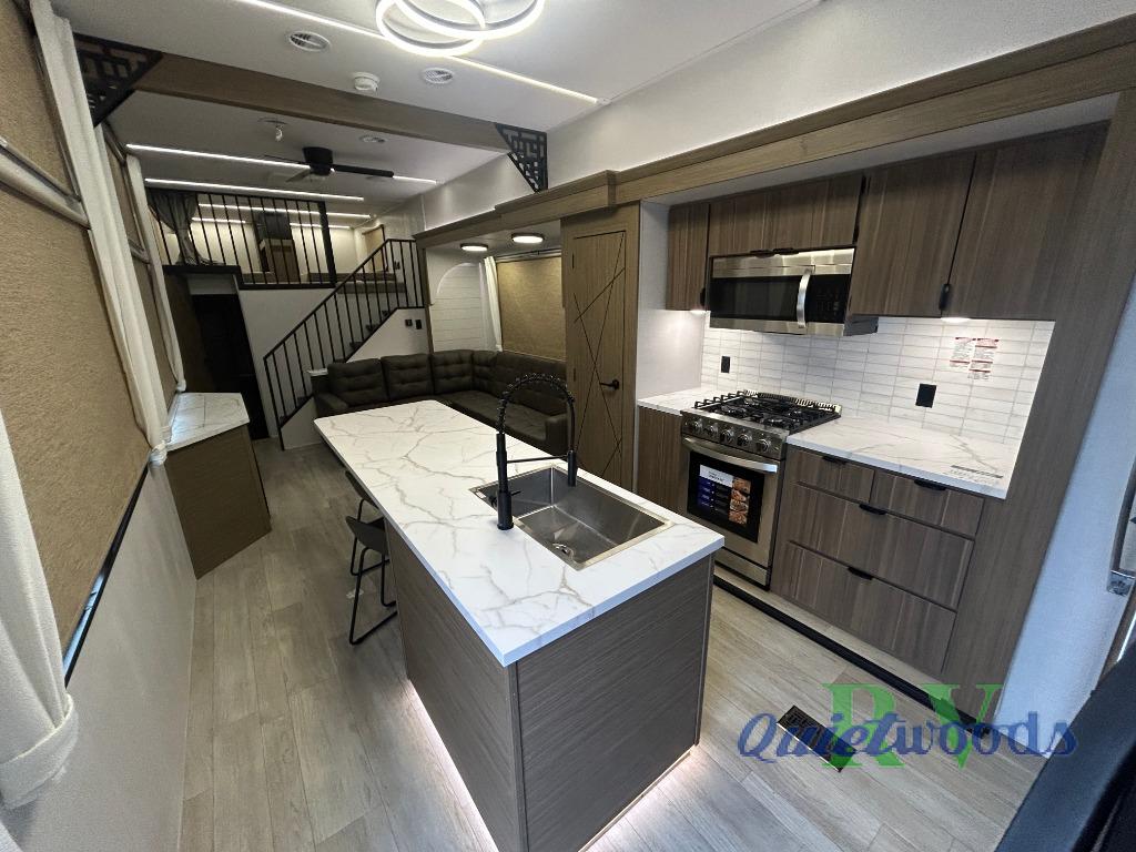 You will feel right at home in this destination trailer! It has not only has one loft in the rear with two 42" x 74" bunk mats, but also a second loft in the front with spiral steps leading up to two bunk mats. The front private bedroom features a king bed slide with Versa-Tilt to lay your head on at night with front windows to let in lots of natural lighting and sunshine in the morning. Relax in true comfort at night on the L-shaped sectional sofa across from the entertainment center with a fireplace. The kitchen island provides extra space to prepare delicious meals and comes with four bar stools to enjoy your breakfast each morning. Everyone will stay fresh and clean with a walk-in shower in the rear private bedroom, plus there is washer and dryer prep if you choose to add those appliances. Head outside through either the patio door or the second entry/exit door each day!