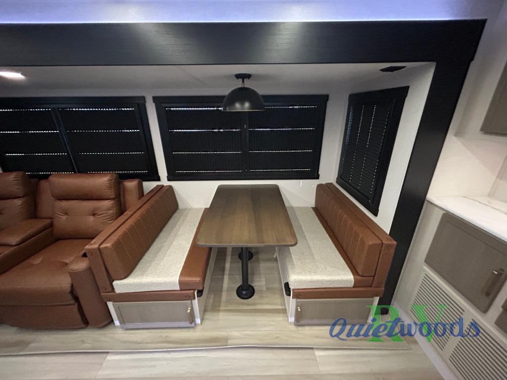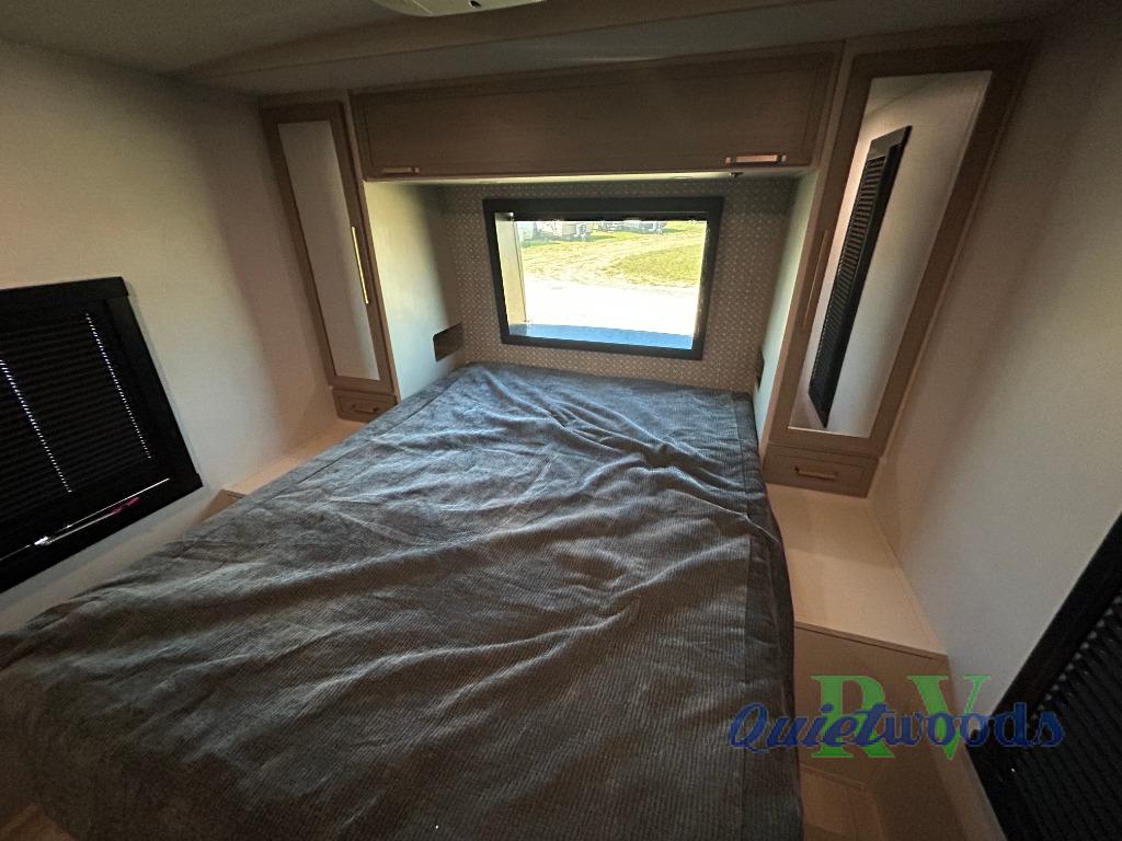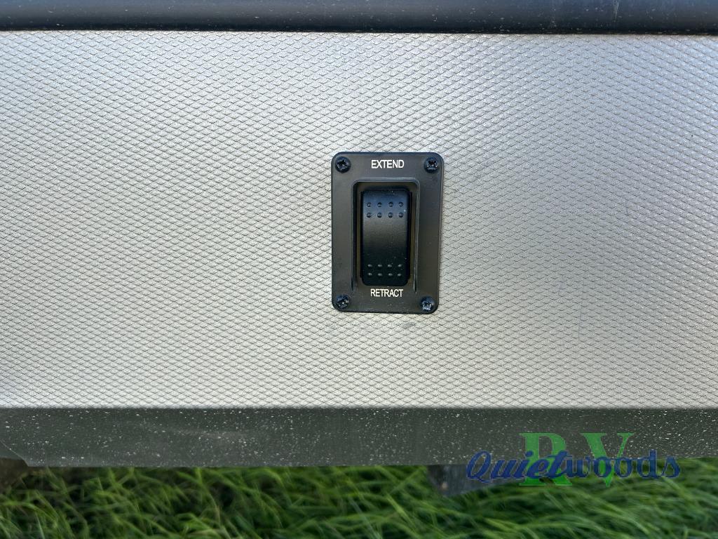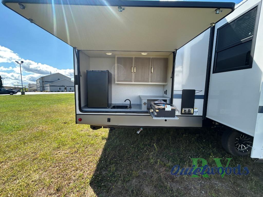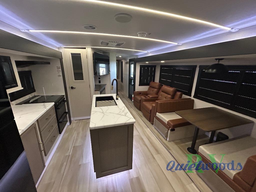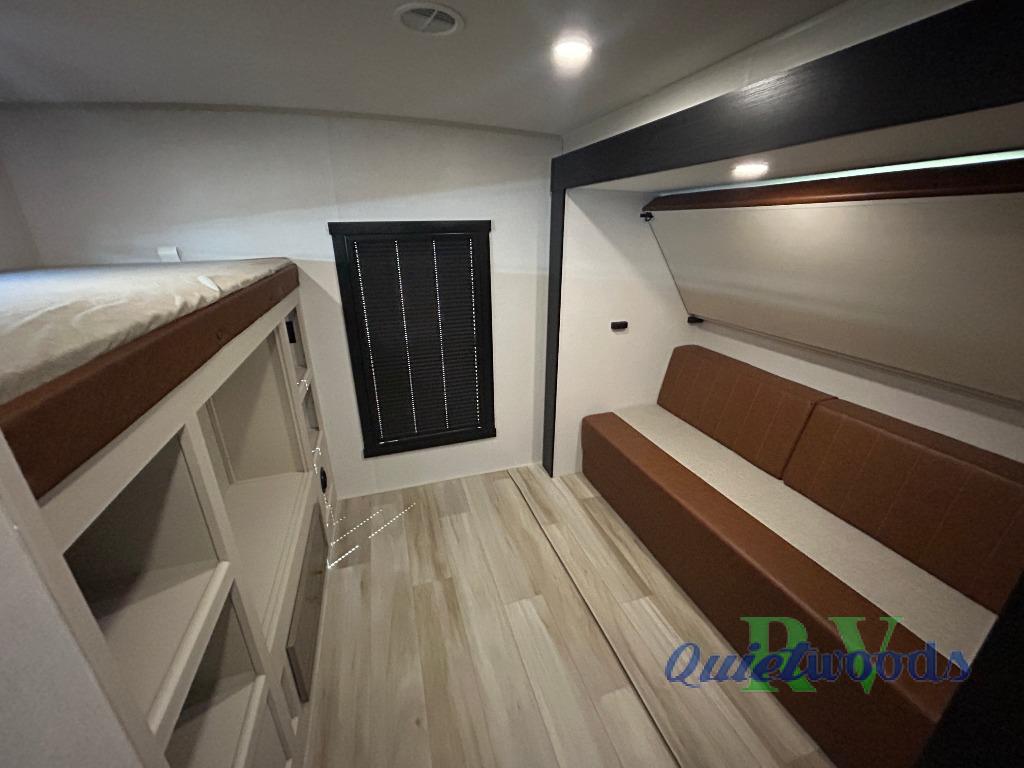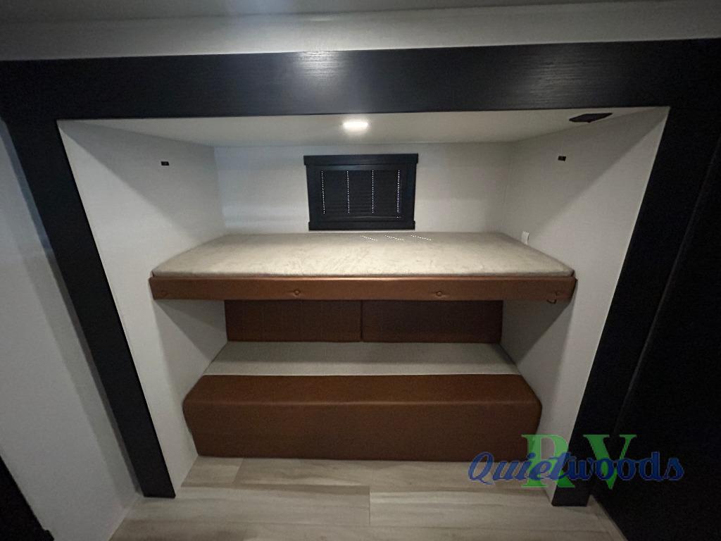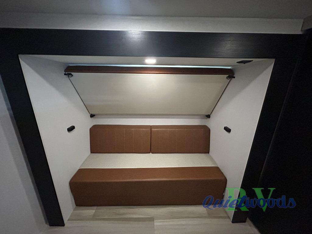 Your kids or friends are going to love camping in this travel trailer! It features a rear private bunkhouse with a bunk above a Versa queen convertible bed/sofa plus an additional bunk above an entertainment center with storage below. Just outside the bunkhouse is the kitchen with a 10 cu. ft. 12V black refrigerator, a microwave, a kitchen island, and a chef-sized walk-in pantry big enough to store everyone's favorite snacks. The booth dinette and the theatre seating are right next to panoramic windows so you can enjoy looking out at your beautiful scenery. You will also love taking a hot, steamy shower in the 30" x 36" shower with skylights and get a good night's rest on the queen bed with Versa Tilt in the front private bedroom!