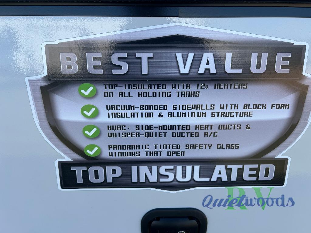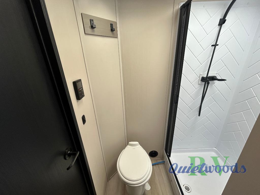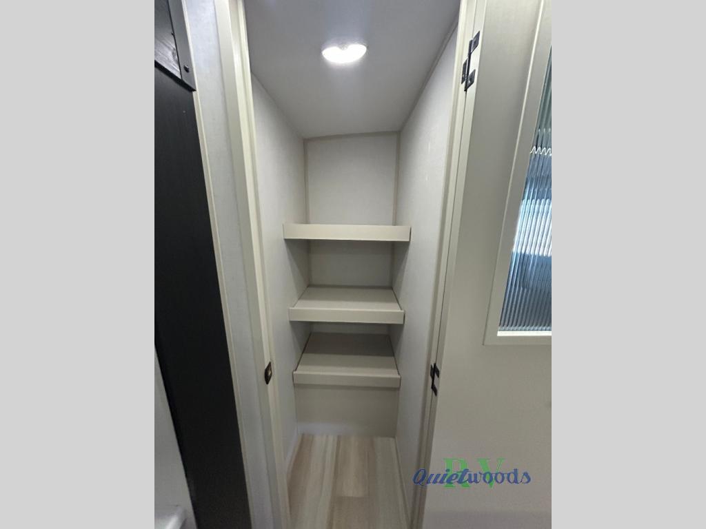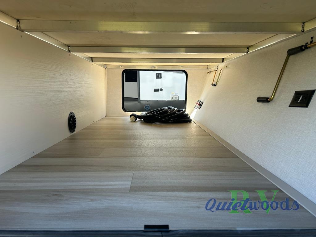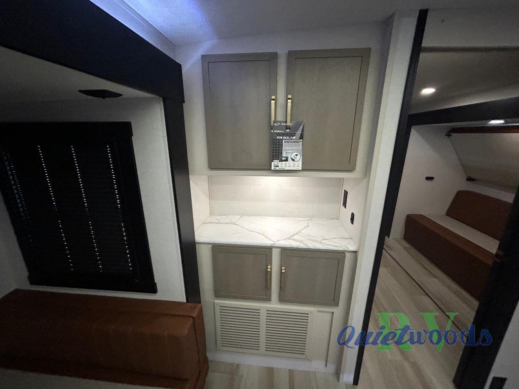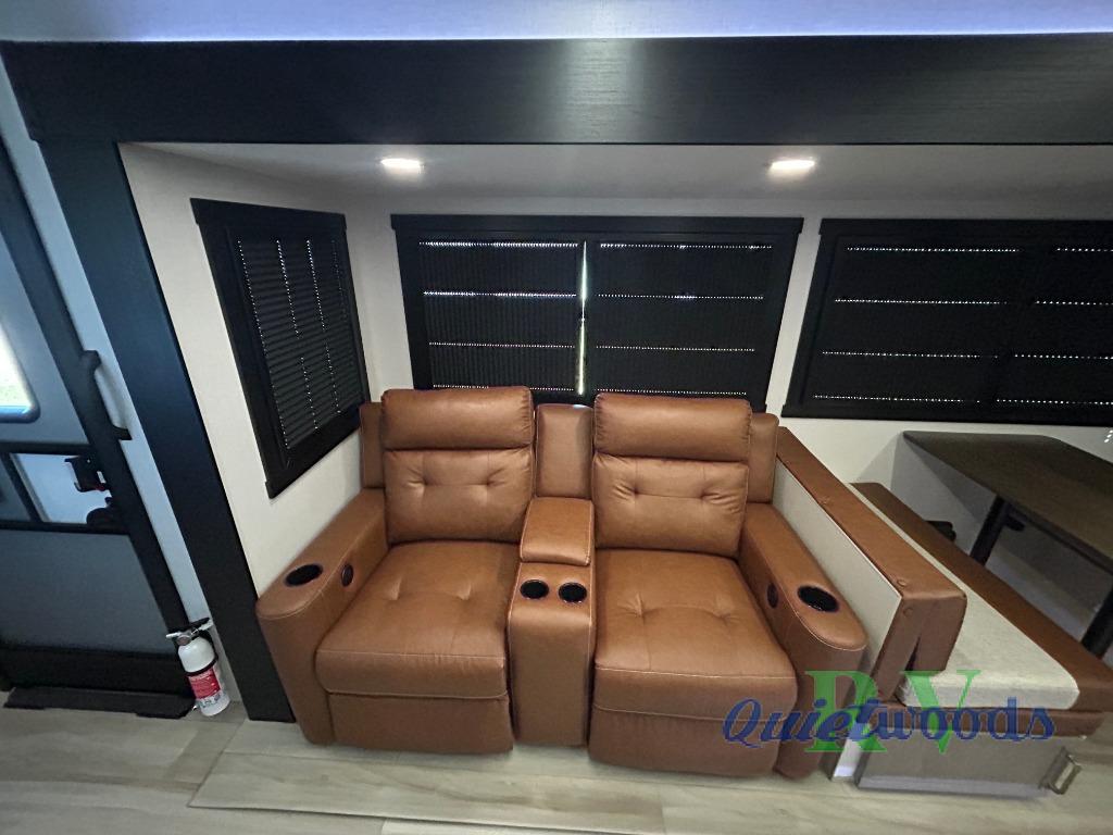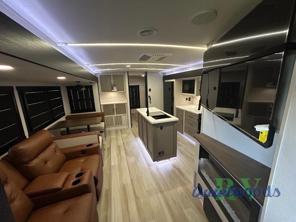 Your kids or friends are going to love camping in this travel trailer! It features a rear private bunkhouse with a bunk above a Versa queen convertible bed/sofa plus an additional bunk above an entertainment center with storage below. Just outside the bunkhouse is the kitchen with a 10 cu. ft. 12V black refrigerator, a microwave, a kitchen island, and a chef-sized walk-in pantry big enough to store everyone's favorite snacks. The booth dinette and the theatre seating are right next to panoramic windows so you can enjoy looking out at your beautiful scenery. You will also love taking a hot, steamy shower in the 30" x 36" shower with skylights and get a good night's rest on the queen bed with Versa Tilt in the front private bedroom!