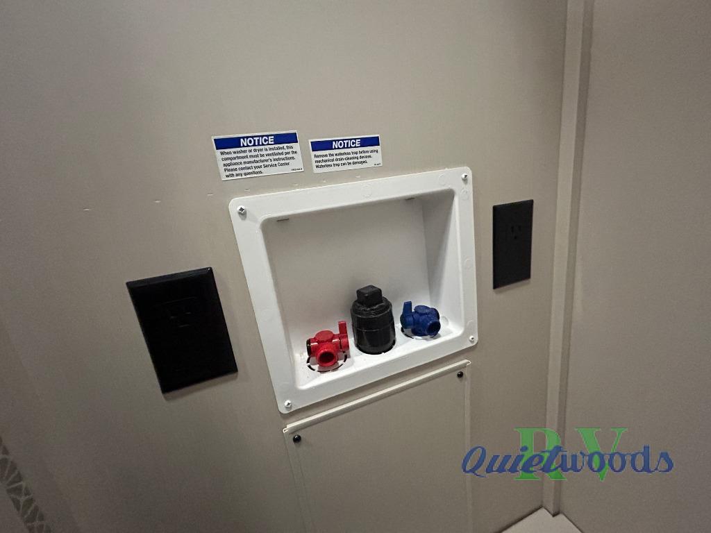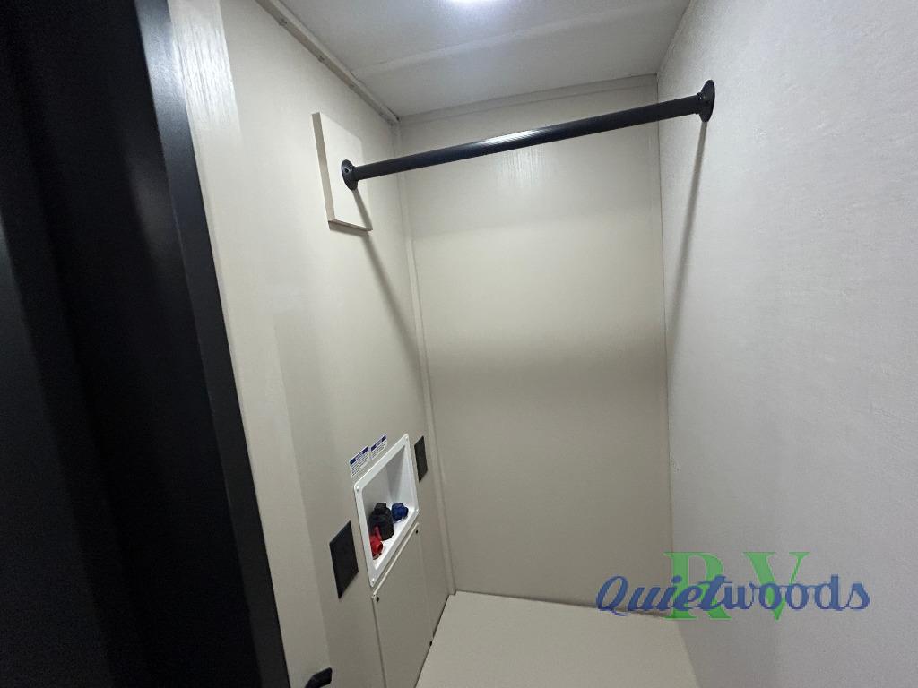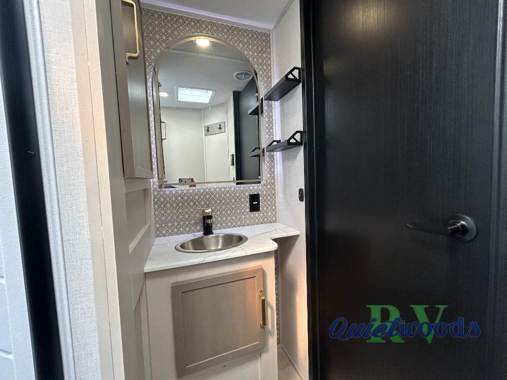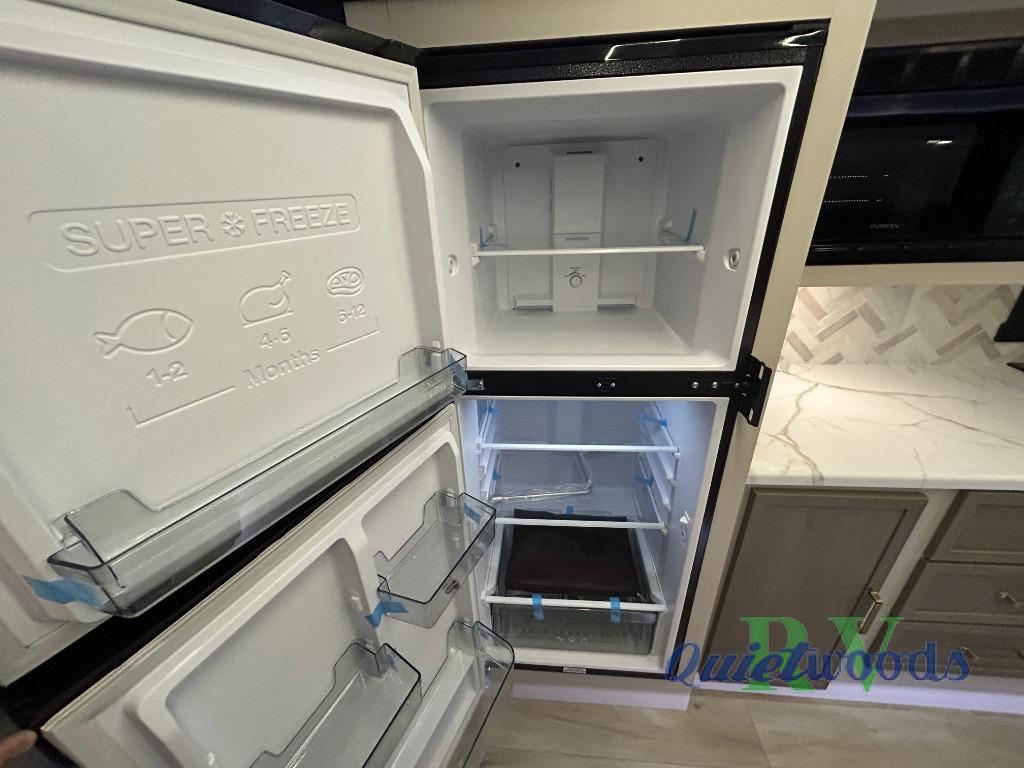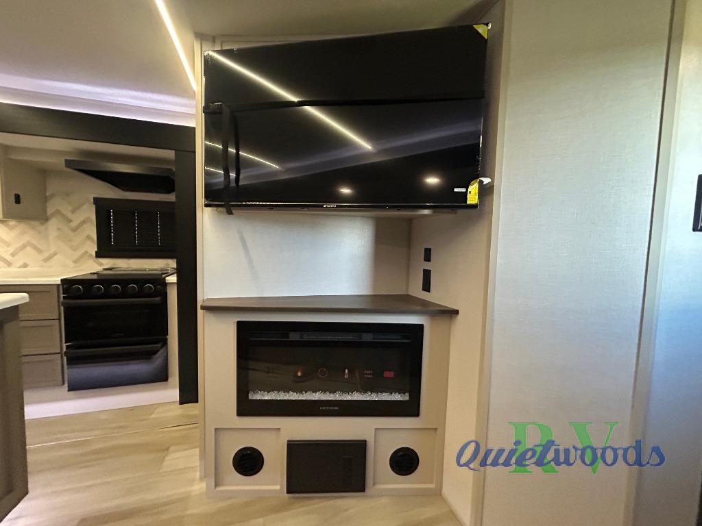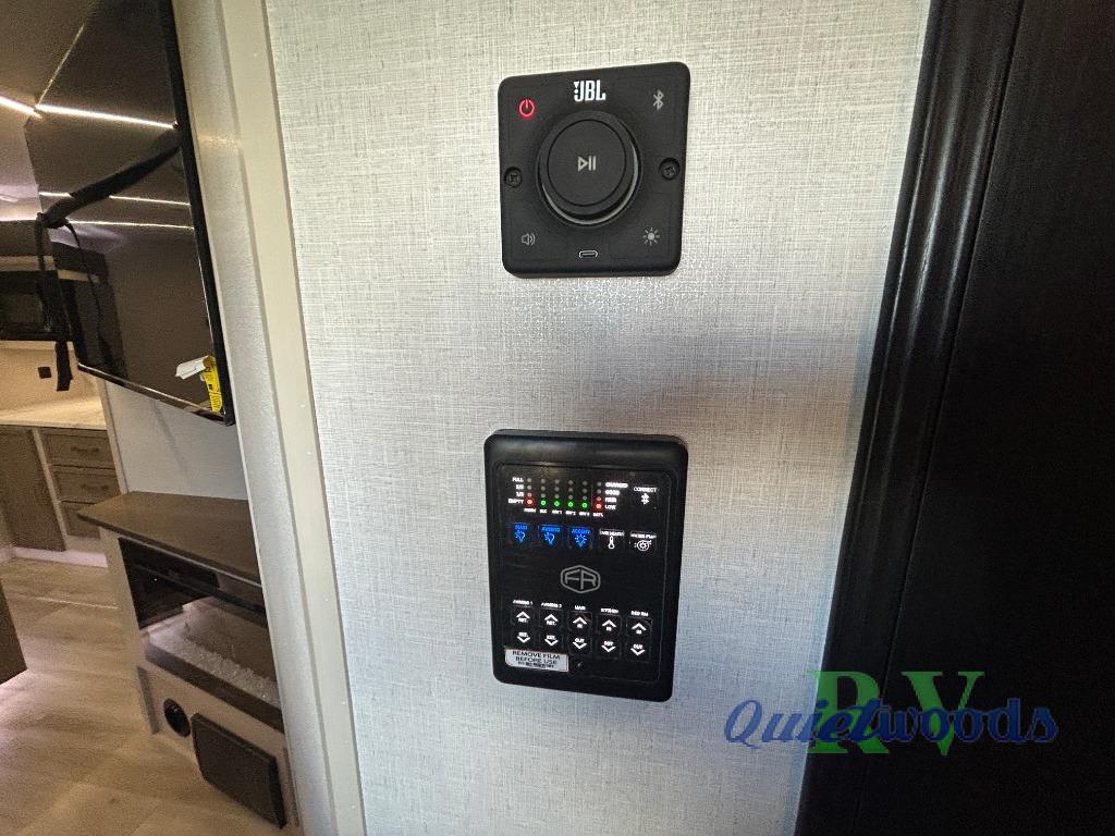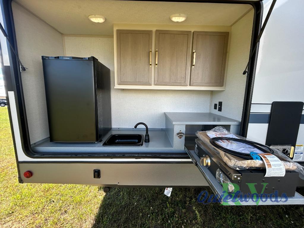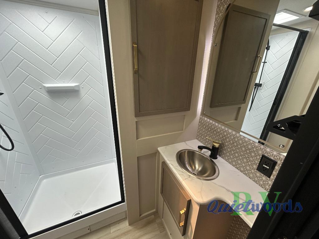 Your kids or friends are going to love camping in this travel trailer! It features a rear private bunkhouse with a bunk above a Versa queen convertible bed/sofa plus an additional bunk above an entertainment center with storage below. Just outside the bunkhouse is the kitchen with a 10 cu. ft. 12V black refrigerator, a microwave, a kitchen island, and a chef-sized walk-in pantry big enough to store everyone's favorite snacks. The booth dinette and the theatre seating are right next to panoramic windows so you can enjoy looking out at your beautiful scenery. You will also love taking a hot, steamy shower in the 30" x 36" shower with skylights and get a good night's rest on the queen bed with Versa Tilt in the front private bedroom!