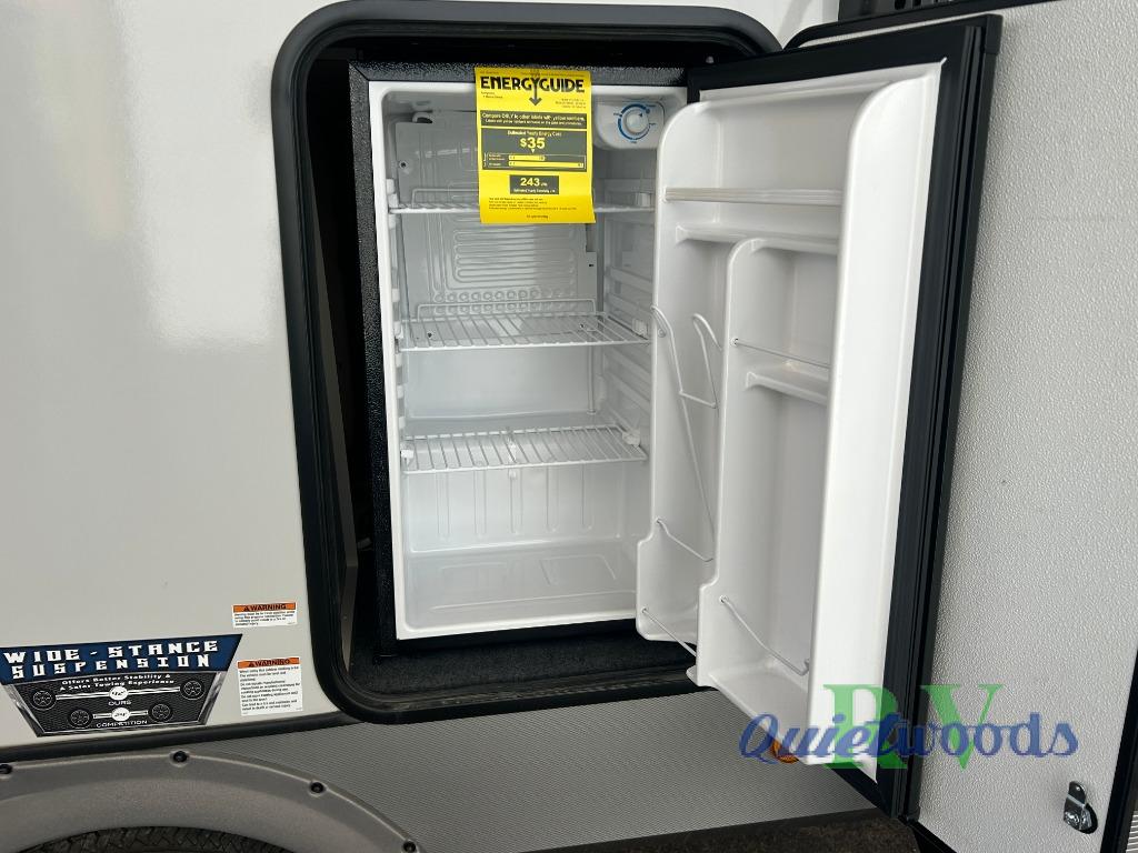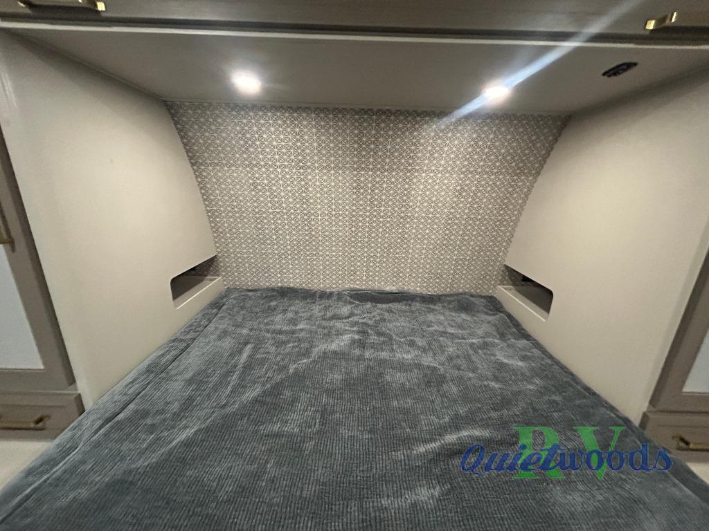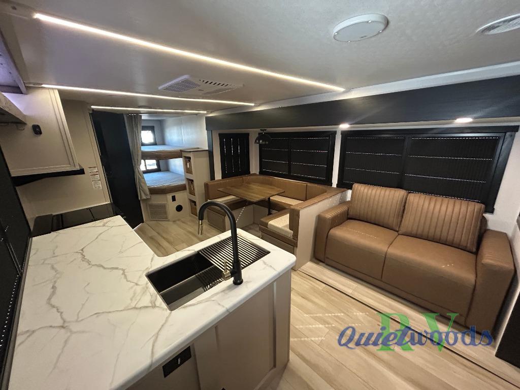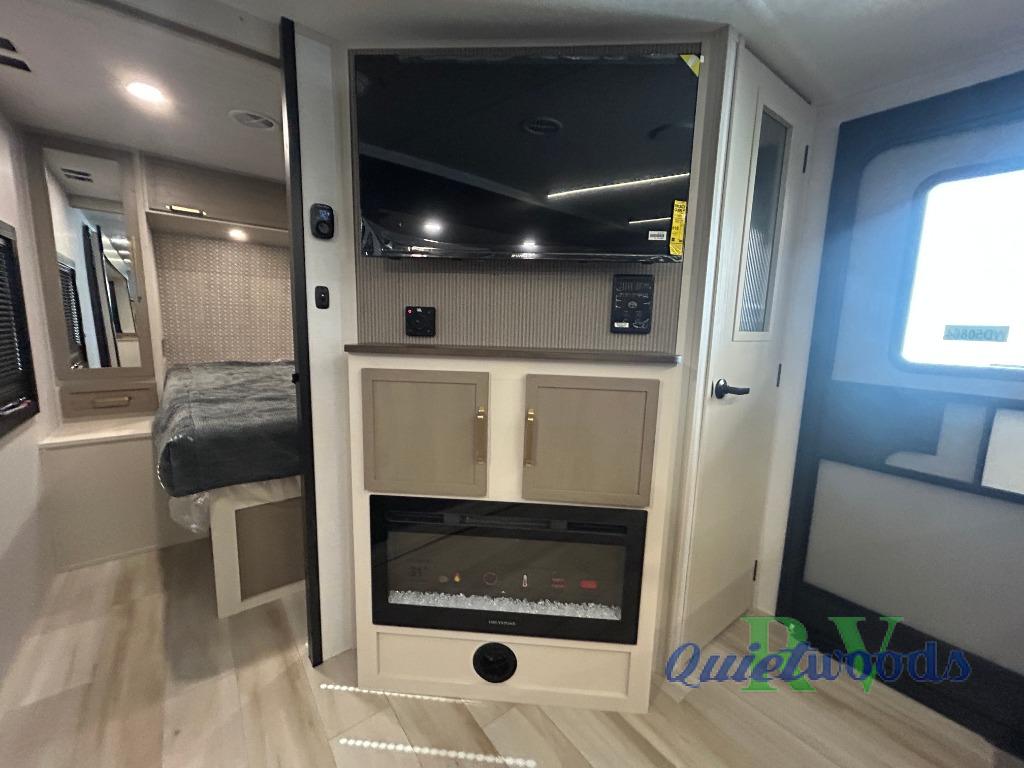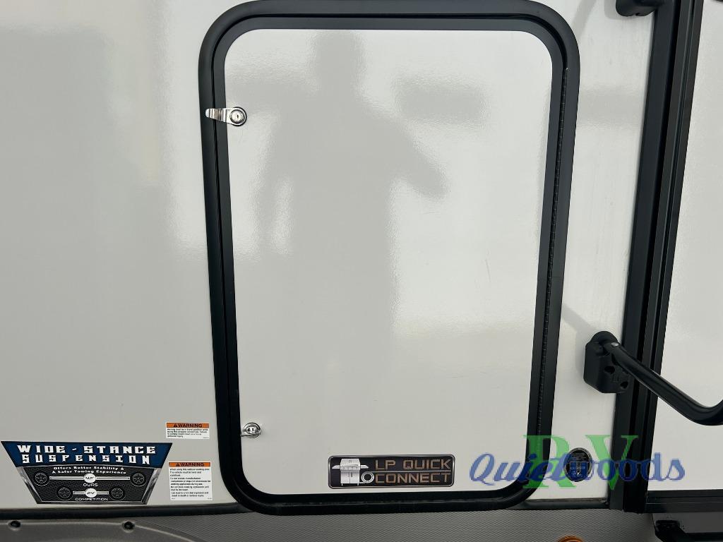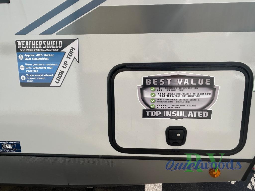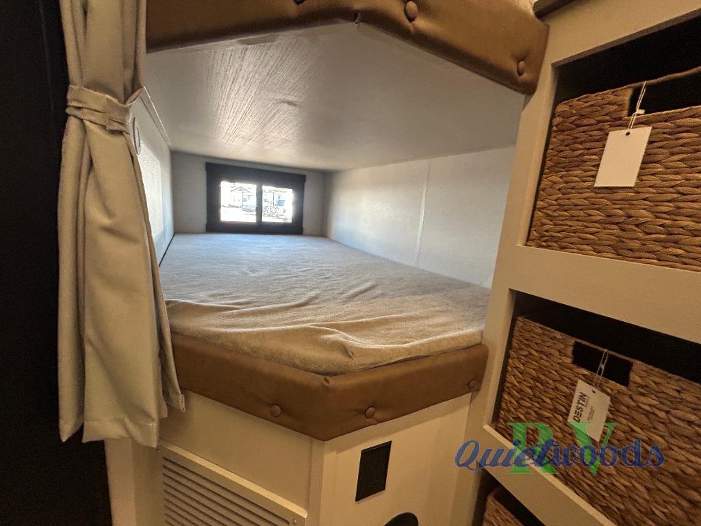 The whole gang will love camping in this bunkhouse model! Since the double-size bunks are right beside the full bath, the little ones can easily use it at night, plus you'll find the second entry door here for added convenience! The combined kitchen and living area includes a U-shaped dinette and tri-fold sofa in great view of the entertainment center with a TV and fireplace. A front private bedroom will provide you with your own space at night, and you're sure to sleep great on the queen bed with Versa Tilt. Head outdoors to enjoy the 20' awning with LED lights and the camp kitchen!