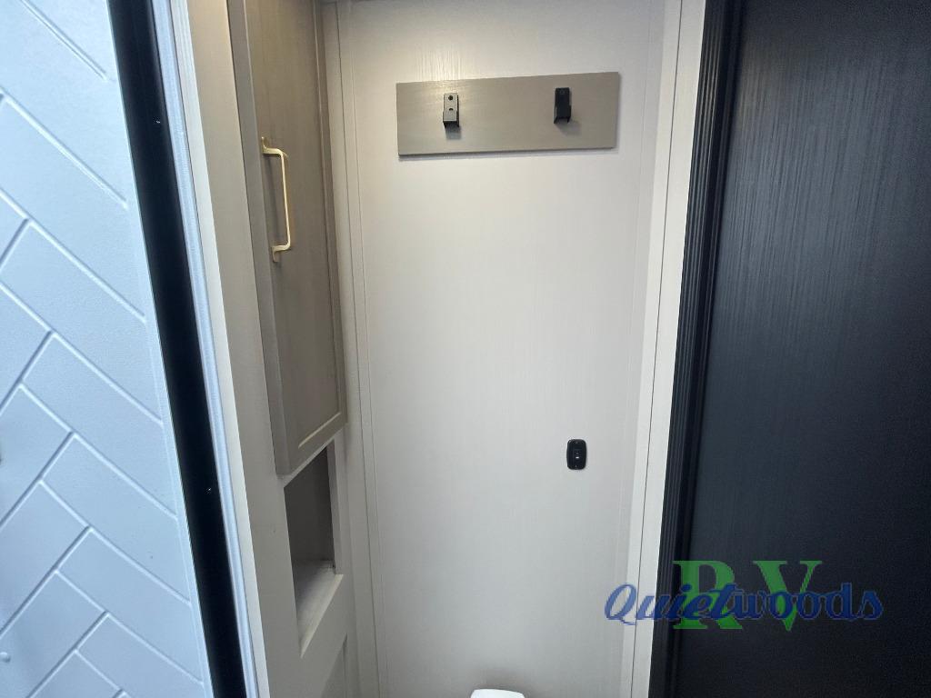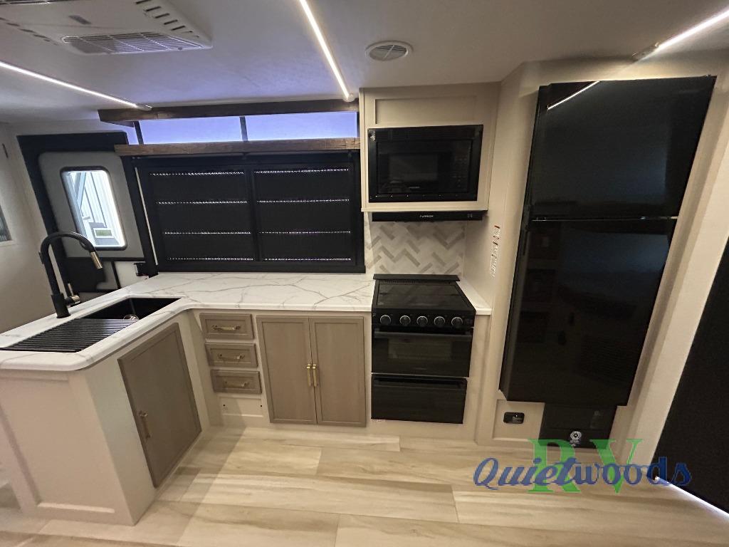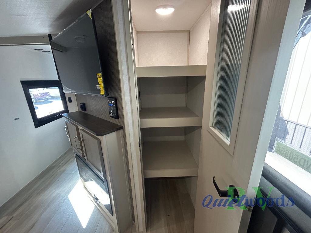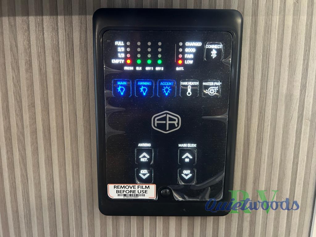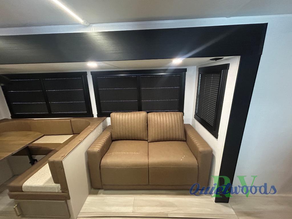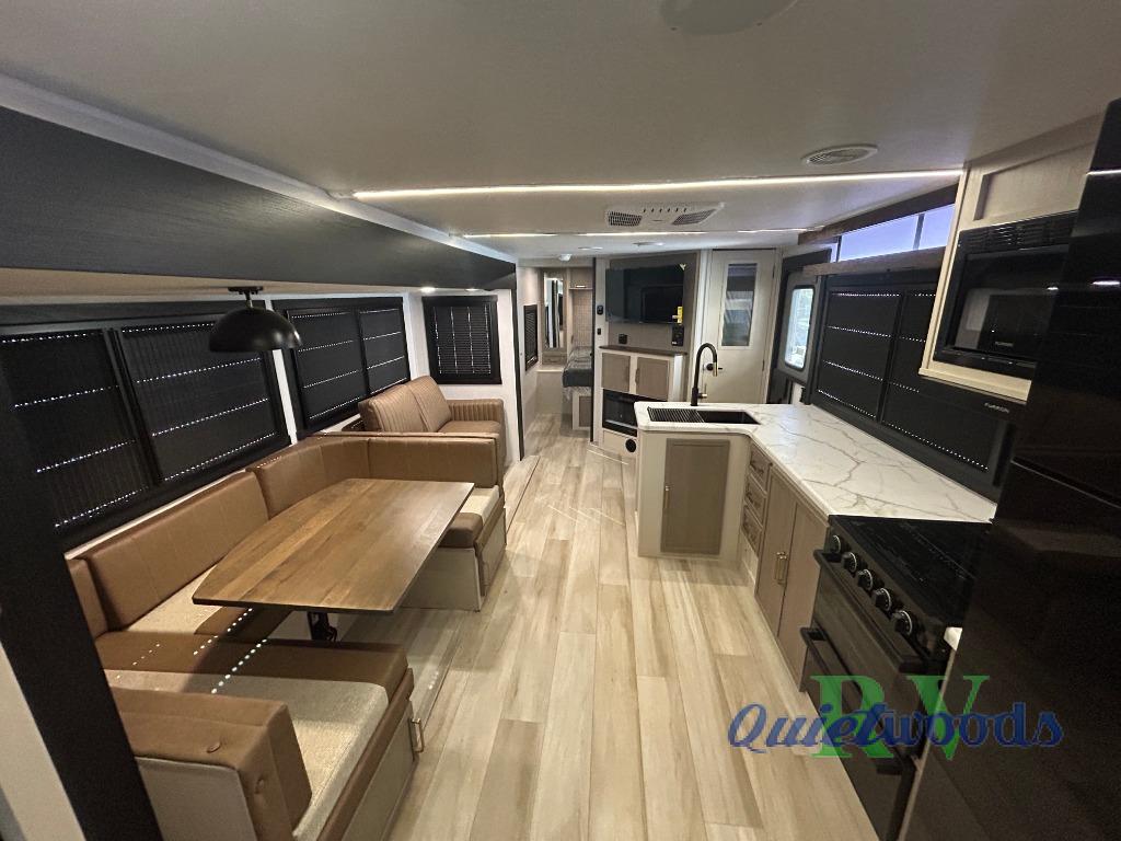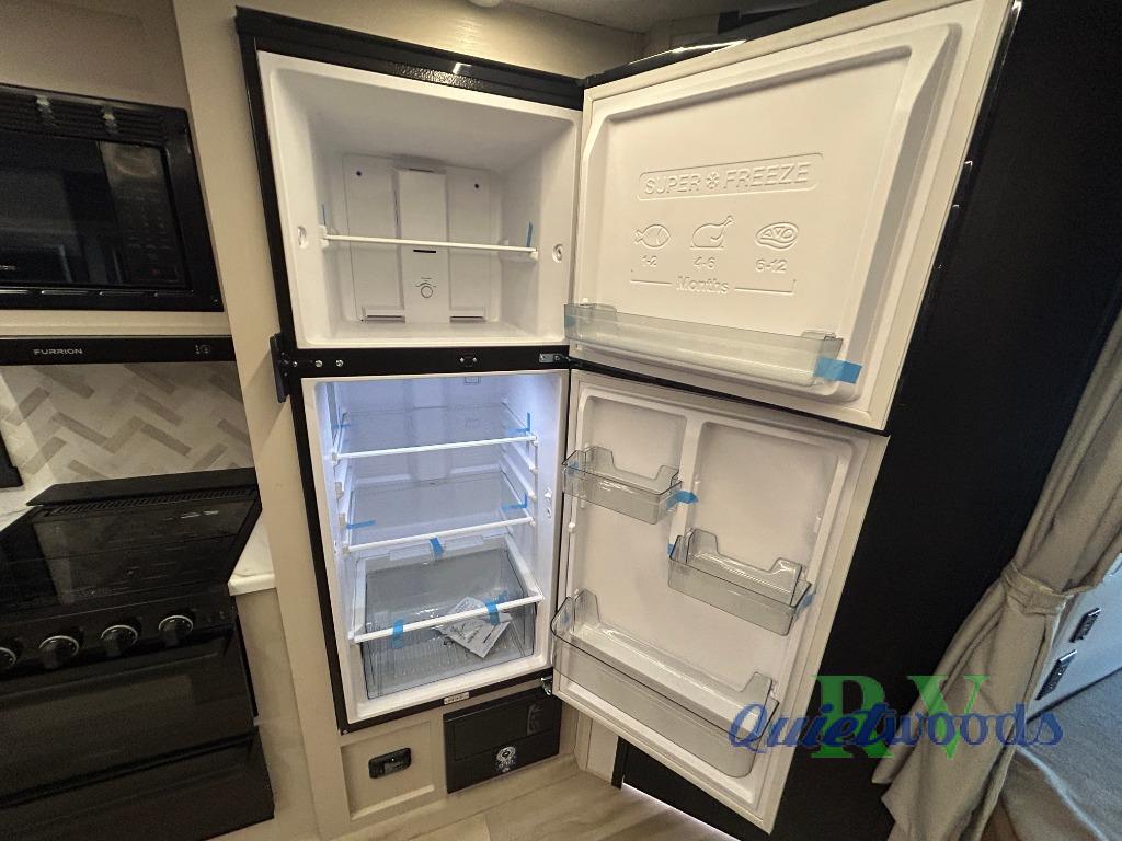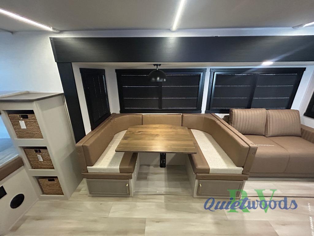 The whole gang will love camping in this bunkhouse model! Since the double-size bunks are right beside the full bath, the little ones can easily use it at night, plus you'll find the second entry door here for added convenience! The combined kitchen and living area includes a U-shaped dinette and tri-fold sofa in great view of the entertainment center with a TV and fireplace. A front private bedroom will provide you with your own space at night, and you're sure to sleep great on the queen bed with Versa Tilt. Head outdoors to enjoy the 20' awning with LED lights and the camp kitchen!