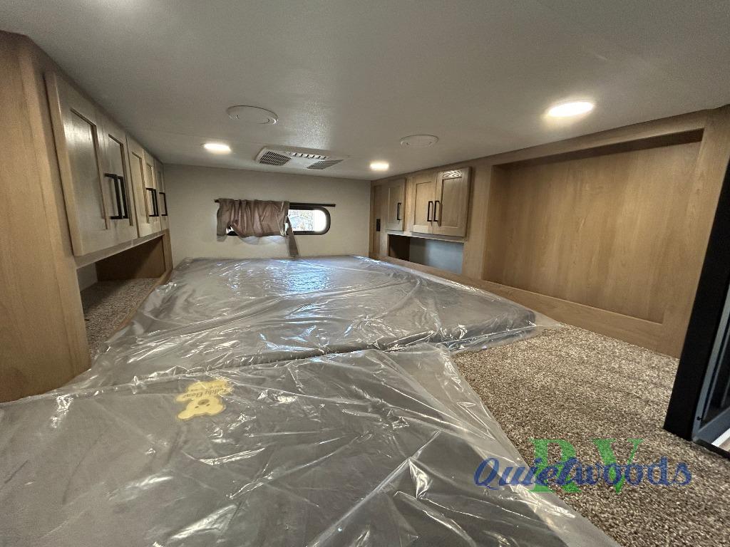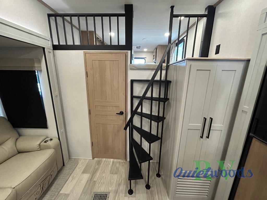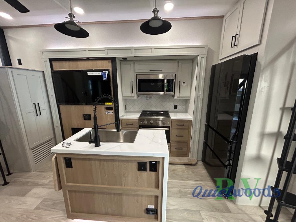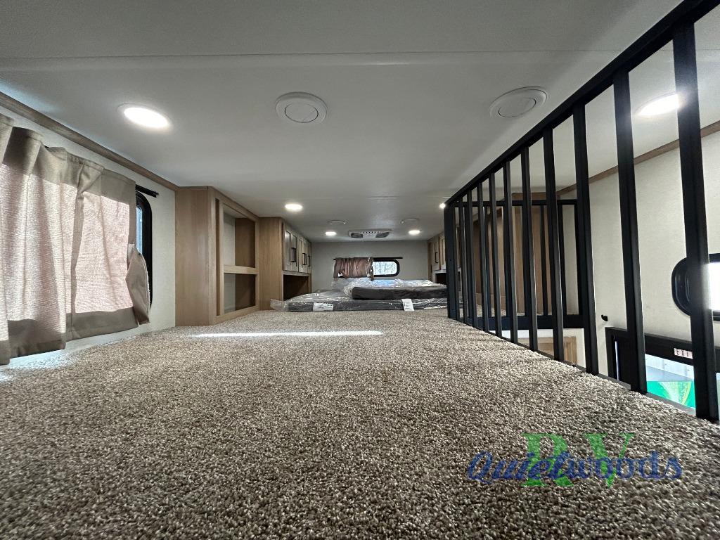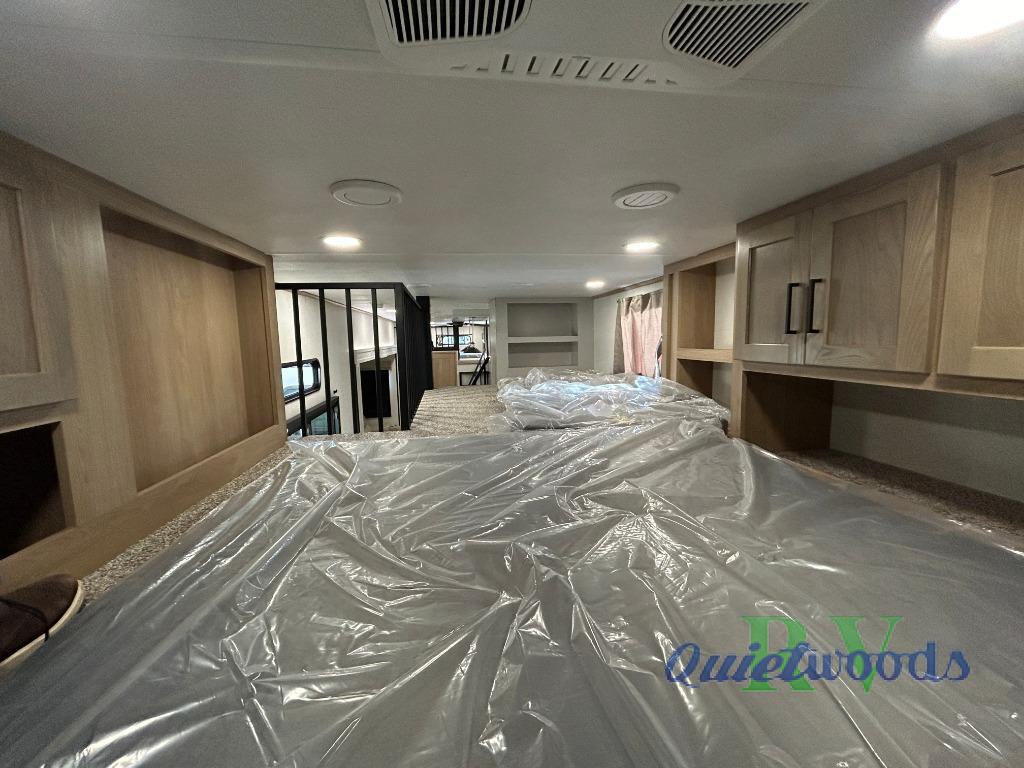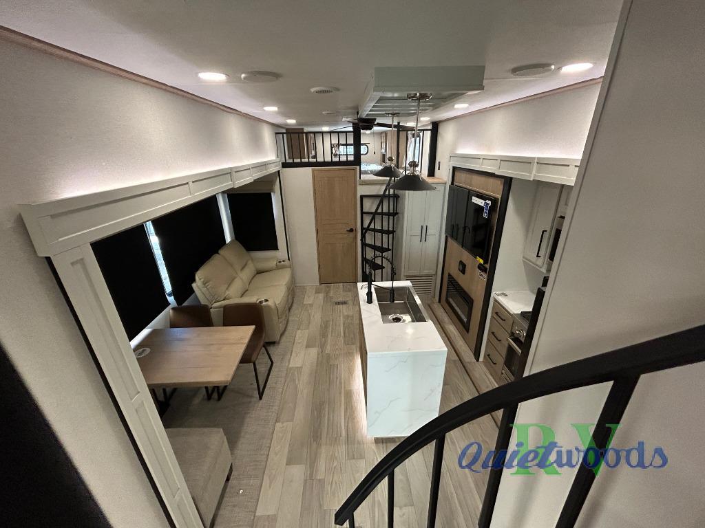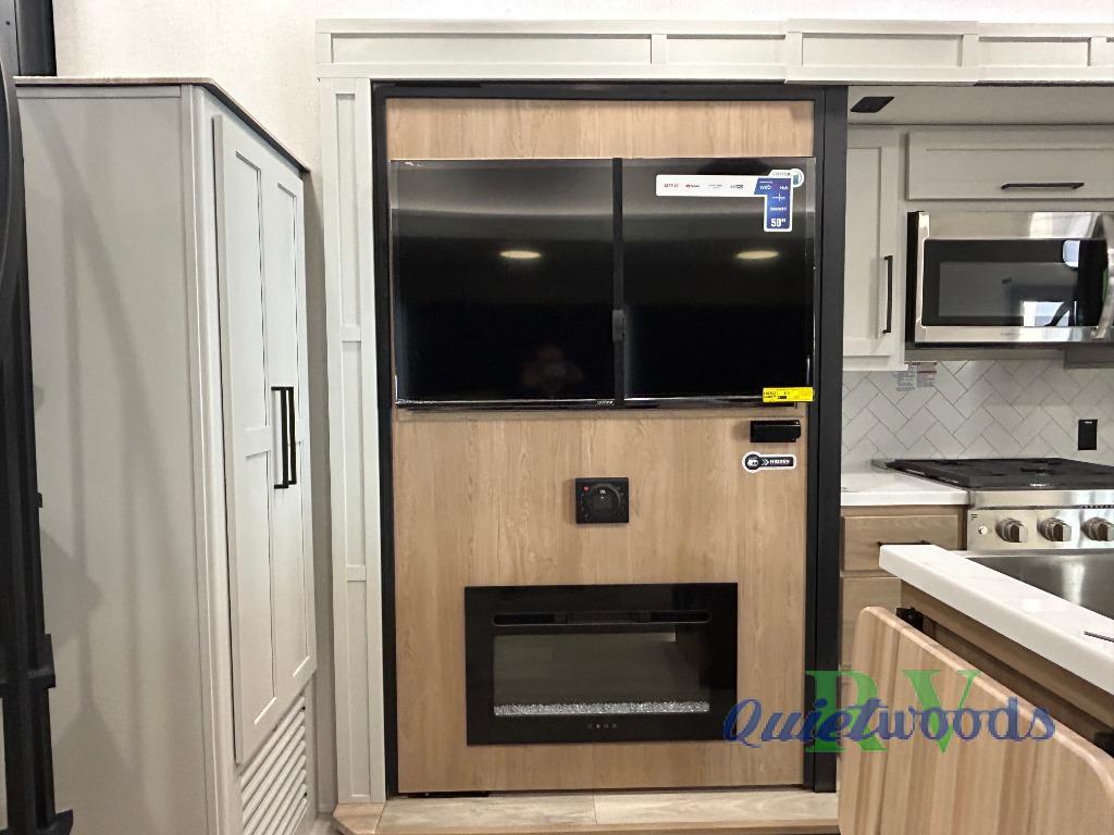 You won't believe the comfort and convenience found in this destination trailer. There are two private bedrooms; one up front with a queen bed slide out and storage space, and one in back with a queen bed slide out and a half bath! There is even washer and dryer prep here if you want to add those appliances and the second entry door is also found in this location so you can easily slip out in the morning. Above each of these rooms is a loft providing three total bunk mats for sleeping, storage cabinets, and TV prep if you want to add entertainment. Everyone can meet in the combined kitchen and living room that includes dual opposing slides, a 60" theater seating across from a 50" flat screen TV and fireplace, plus a free-standing table with chairs and a bench to dine at. The chef of your group will love the large kitchen island, Chef Collection three burner range, and a 16.2 cu. ft. refrigerator for food storage.