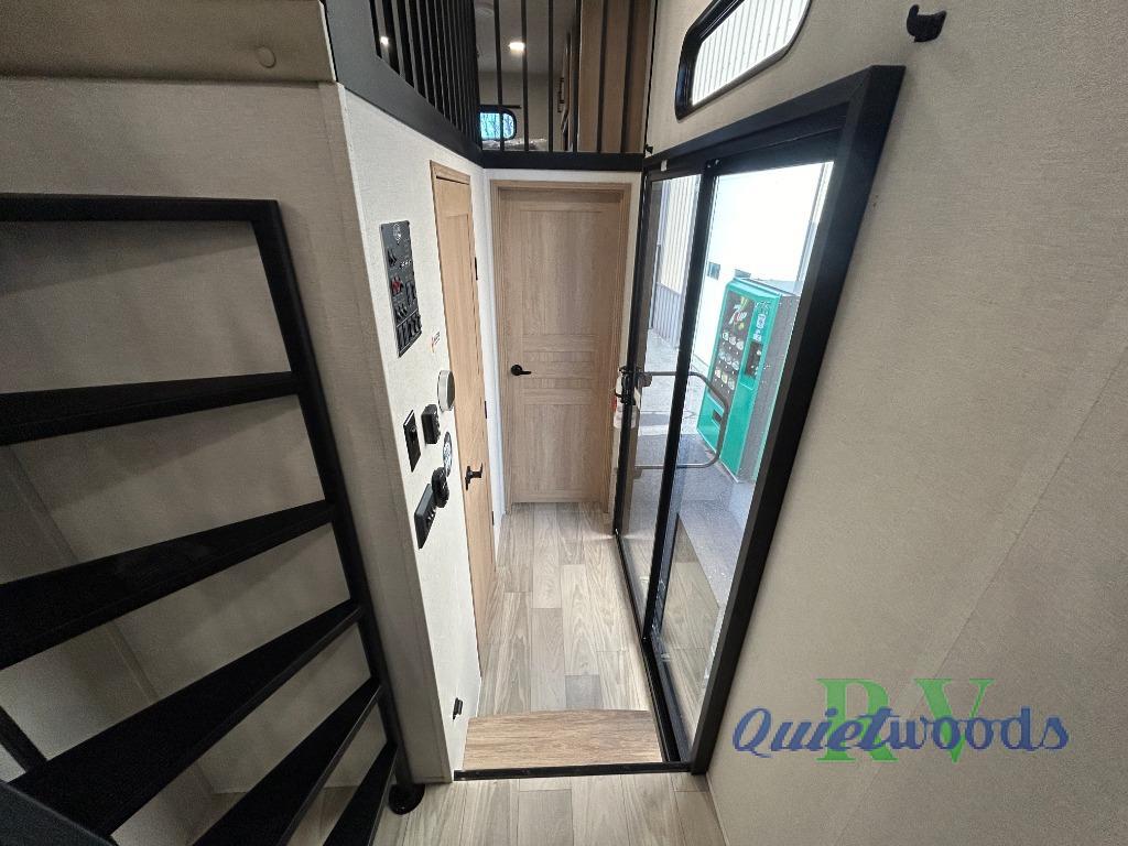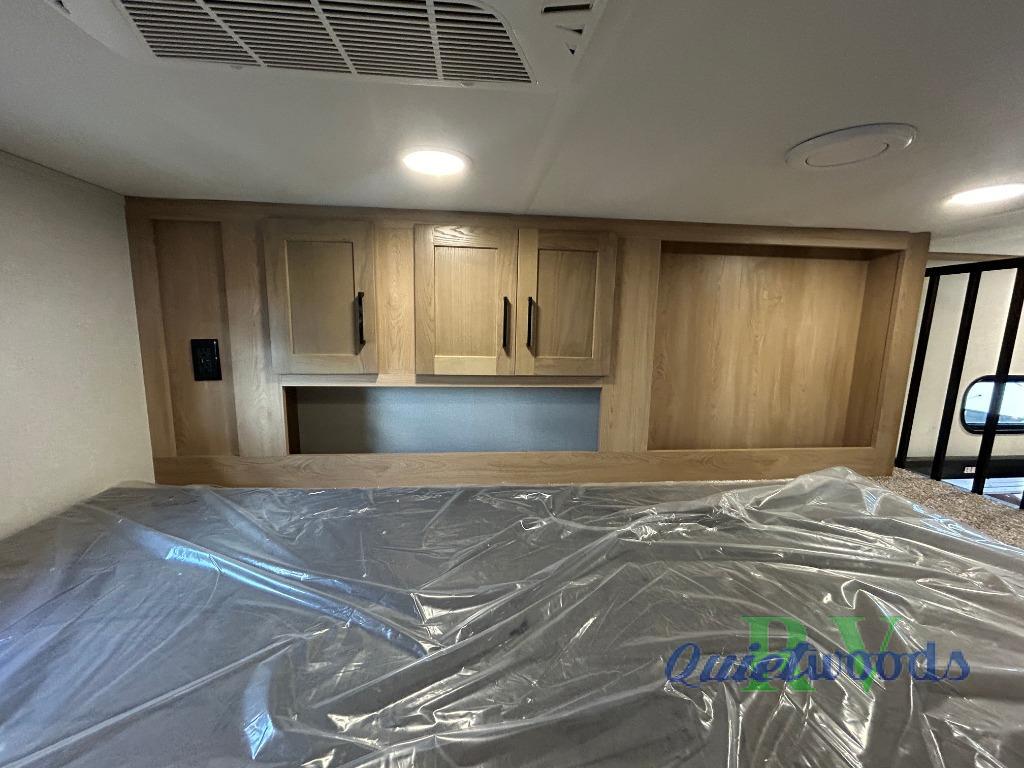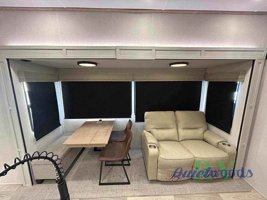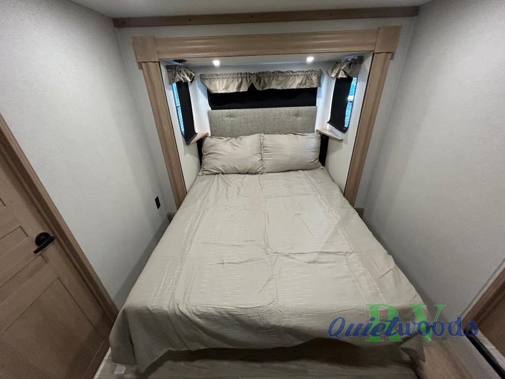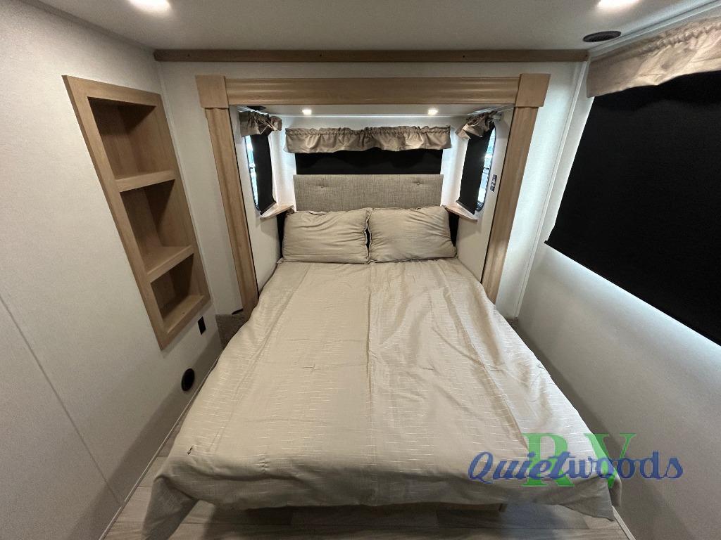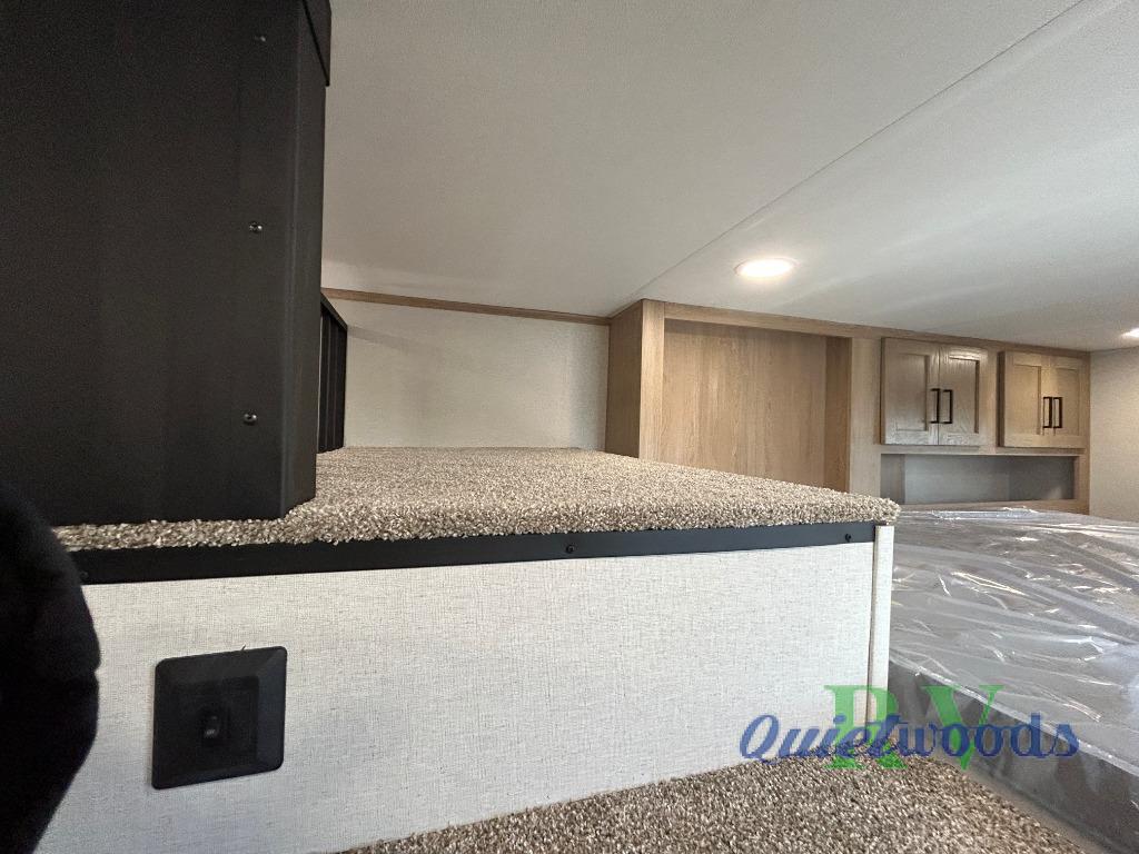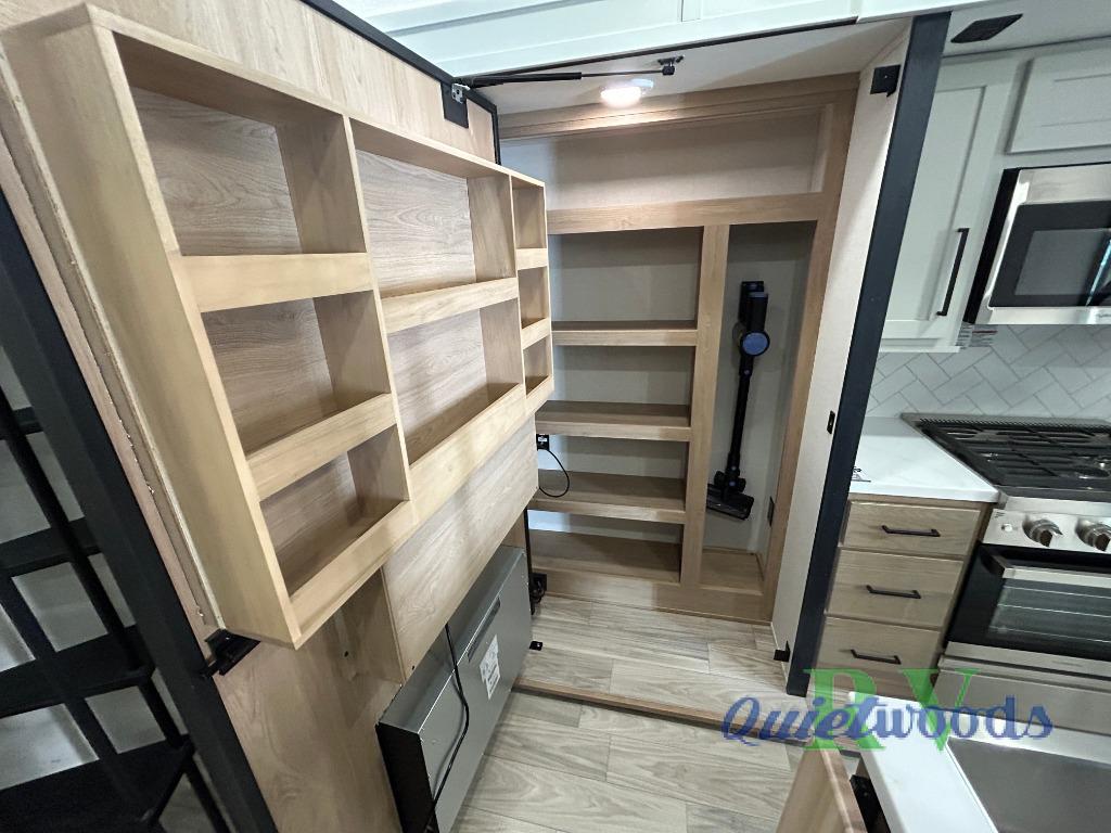 You won't believe the comfort and convenience found in this destination trailer. There are two private bedrooms; one up front with a queen bed slide out and storage space, and one in back with a queen bed slide out and a half bath! There is even washer and dryer prep here if you want to add those appliances and the second entry door is also found in this location so you can easily slip out in the morning. Above each of these rooms is a loft providing three total bunk mats for sleeping, storage cabinets, and TV prep if you want to add entertainment. Everyone can meet in the combined kitchen and living room that includes dual opposing slides, a 60" theater seating across from a 50" flat screen TV and fireplace, plus a free-standing table with chairs and a bench to dine at. The chef of your group will love the large kitchen island, Chef Collection three burner range, and a 16.2 cu. ft. refrigerator for food storage.