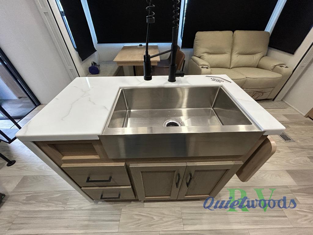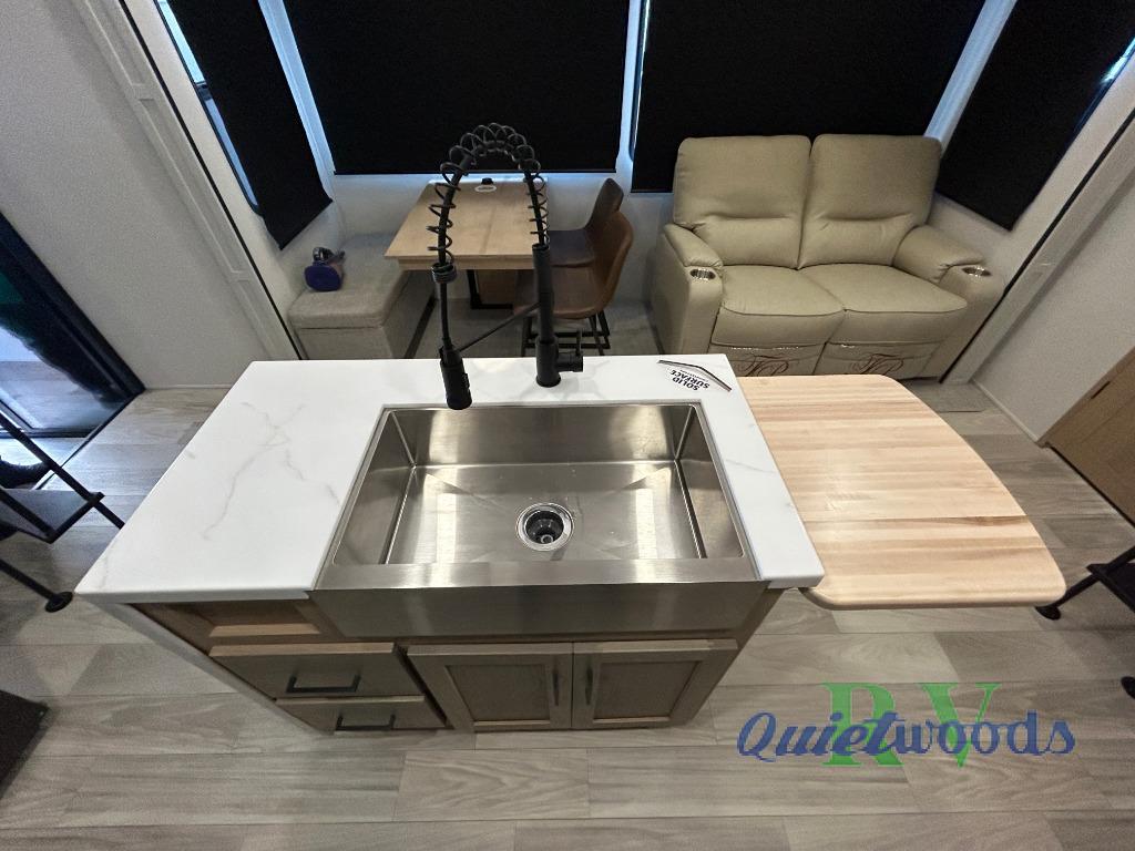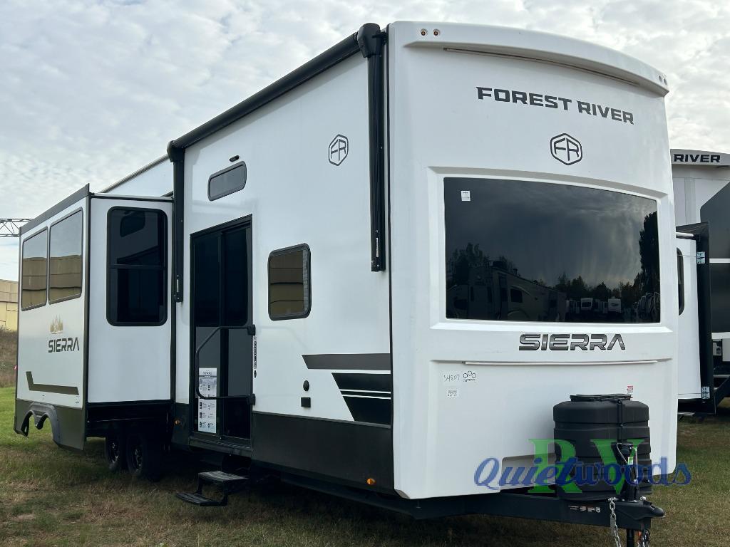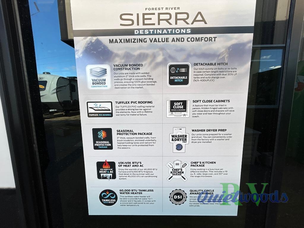 With each Sierra Destination Trailer by Forest River you will enjoy many luxurious features, such as crown molding over the kitchen cabinets, solid surface kitchen countertops, a memory foam mattress, plus so much more. The extra large picture windows throughout let natural light in and provide beautiful outdoor views, and each model includes three or more slides for added interior space. You'll find many exterior conveniences, like the porch light with an interior switch, the rain gutters with extra long drip spouts to prevent black streaking, and an electric awning with LED light strip, plus more! You will stay comfortable year around with dual 15,000 A/C units plus each model is constructed with an Underbelly Armor for better protection and insulation!