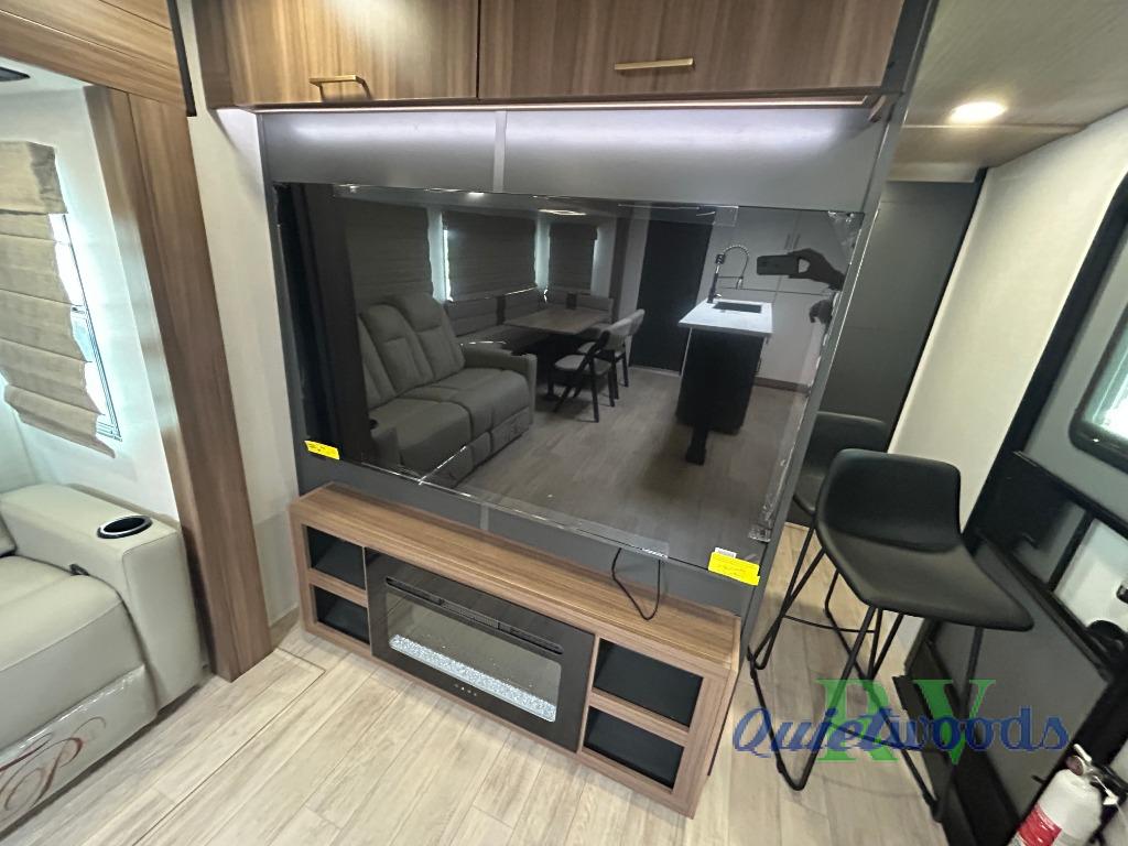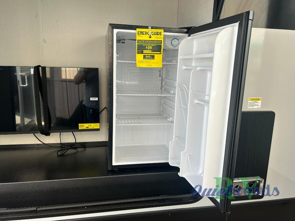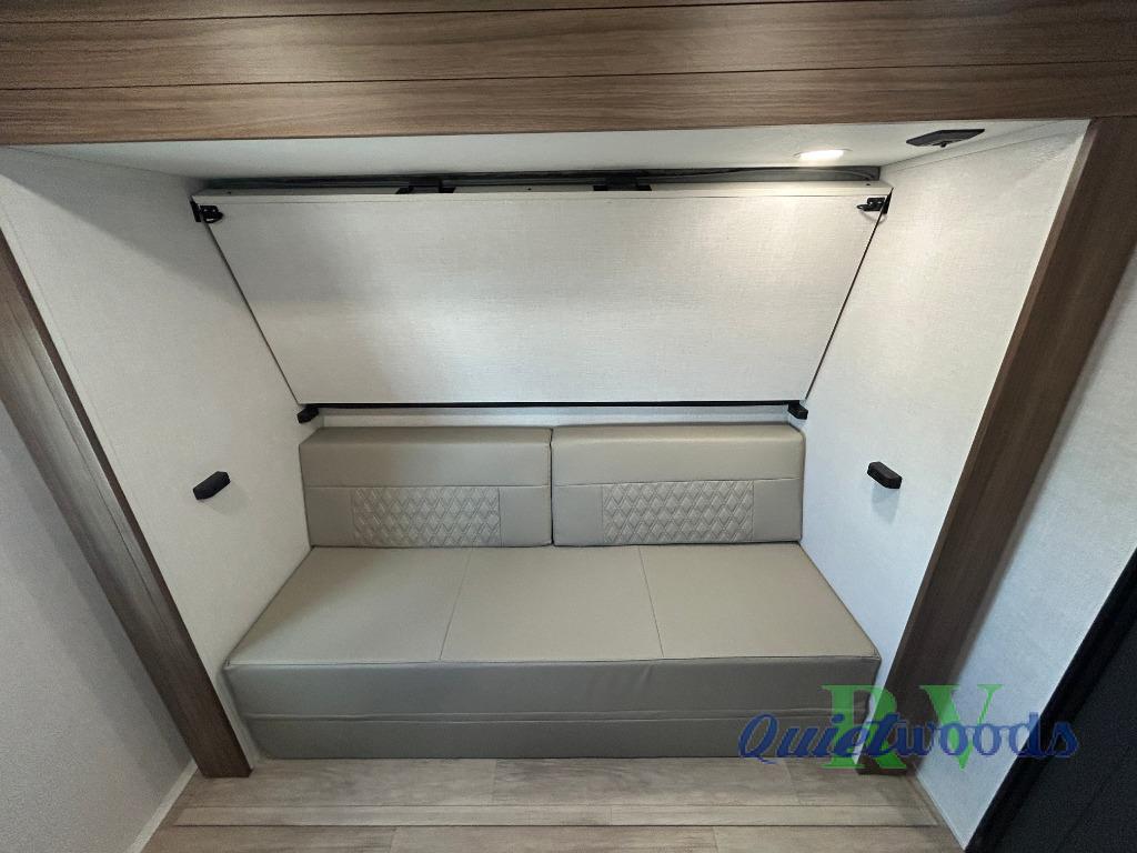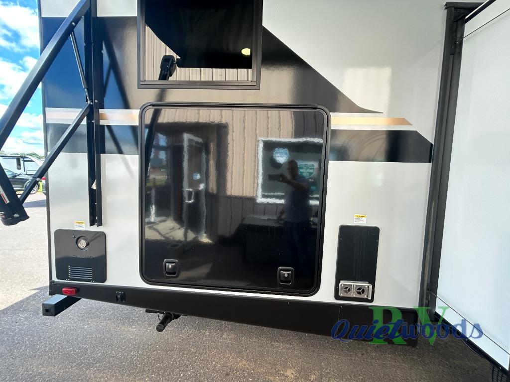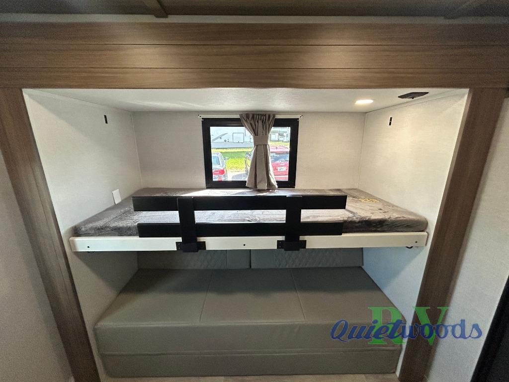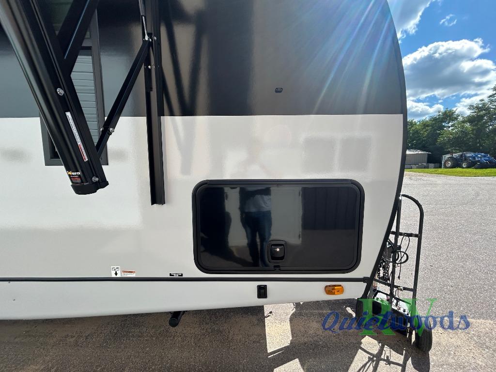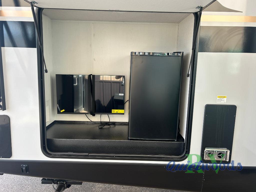 Whether you enjoy spending time outdoors or indoors, there is something for everyone in this travel trailer. The large pass-through storage can store your fishing poles, and the 20' electric awning with LED lights will create an outdoor living space. There is even an outdoor refrigerator with an outside storage cabinet and 32" TV! You will love all the interior space thanks to the dual opposing slides in the main living area, which will give the chef space to work around the kitchen island. Your crew can visit on the tri-fold sofa, theater seating and 5-person dinette while the fireplace is going, but you'll probably find the kids spending most of their time in the private bunkhouse! What more could you want in a travel trailer?!