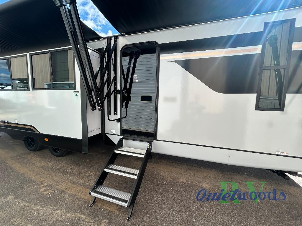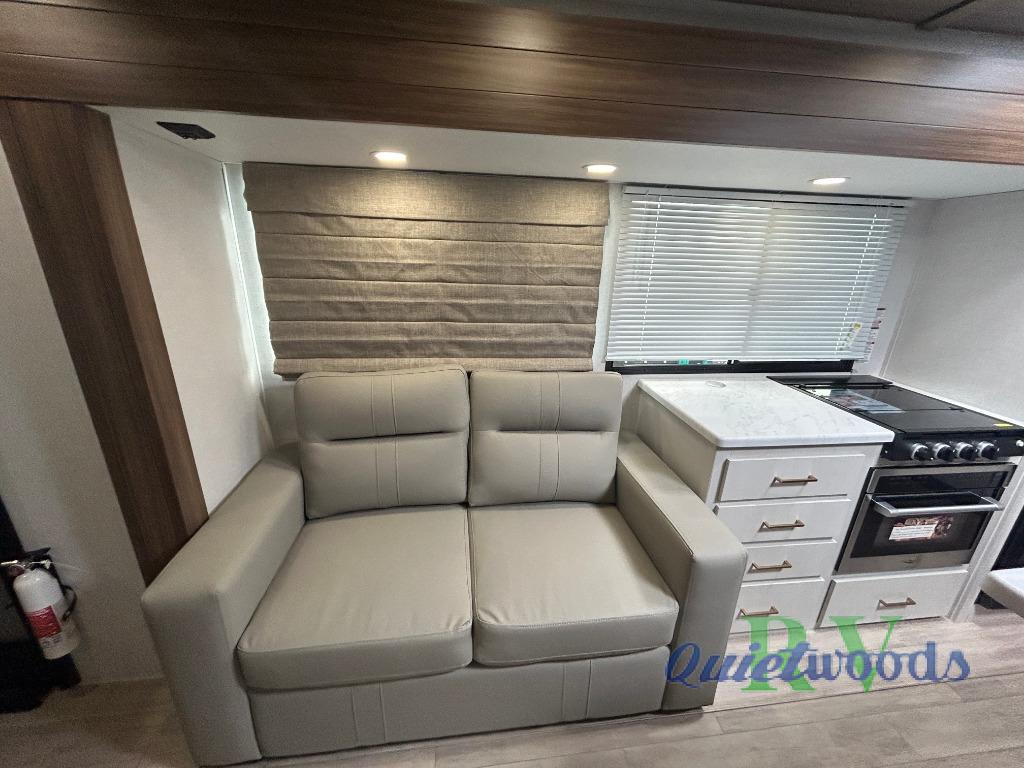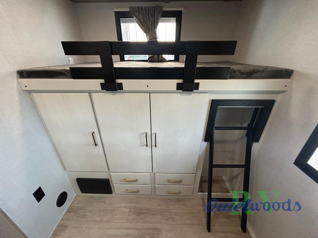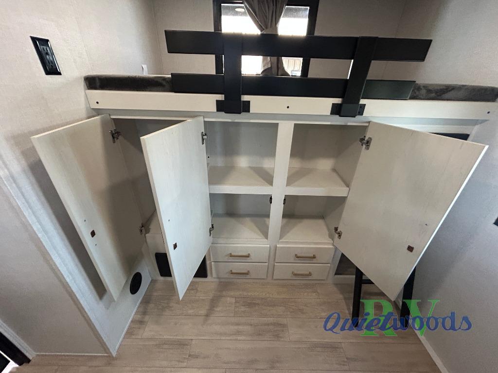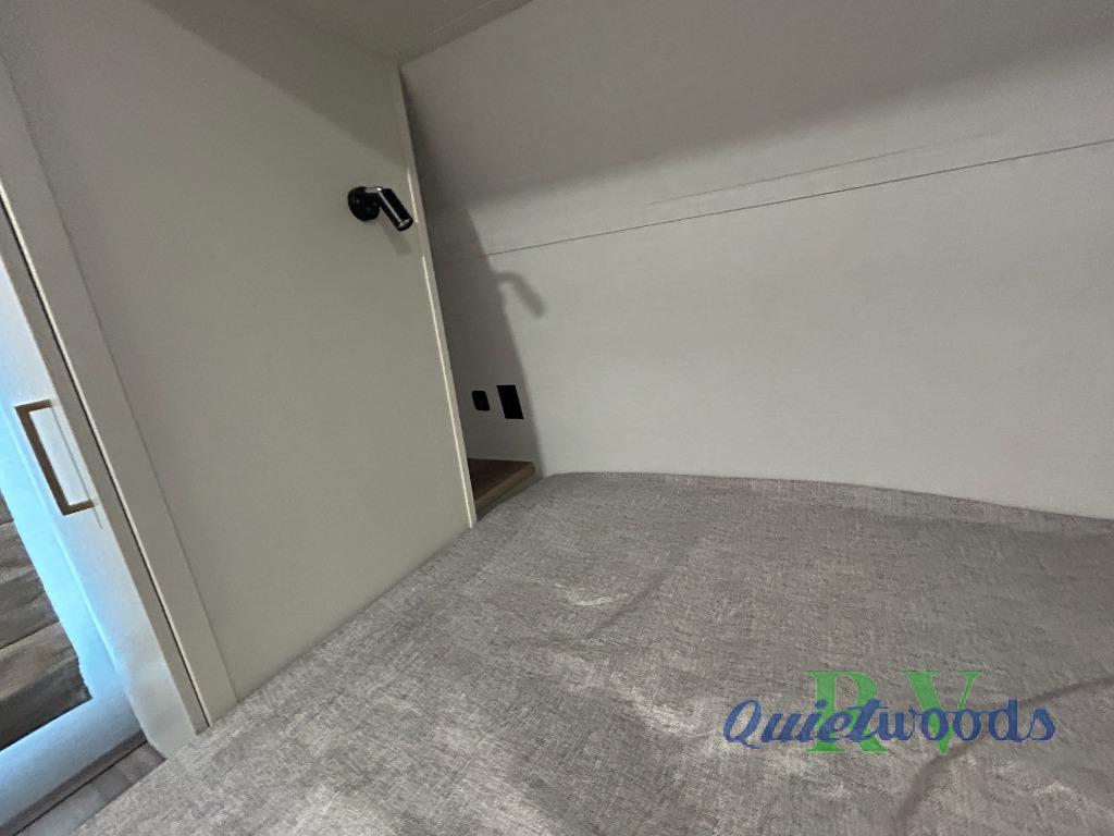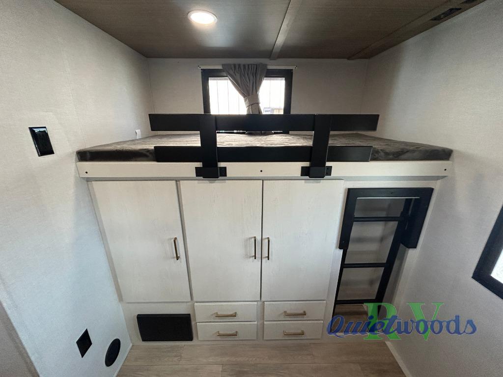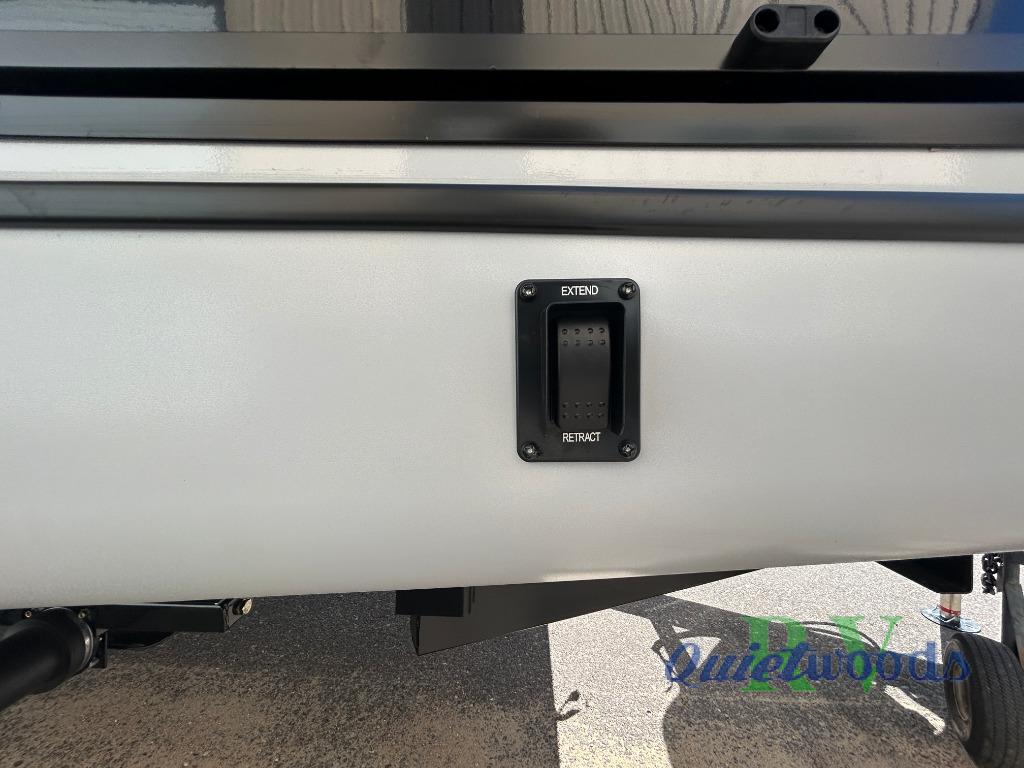 Whether you enjoy spending time outdoors or indoors, there is something for everyone in this travel trailer. The large pass-through storage can store your fishing poles, and the 20' electric awning with LED lights will create an outdoor living space. There is even an outdoor refrigerator with an outside storage cabinet and 32" TV! You will love all the interior space thanks to the dual opposing slides in the main living area, which will give the chef space to work around the kitchen island. Your crew can visit on the tri-fold sofa, theater seating and 5-person dinette while the fireplace is going, but you'll probably find the kids spending most of their time in the private bunkhouse! What more could you want in a travel trailer?!