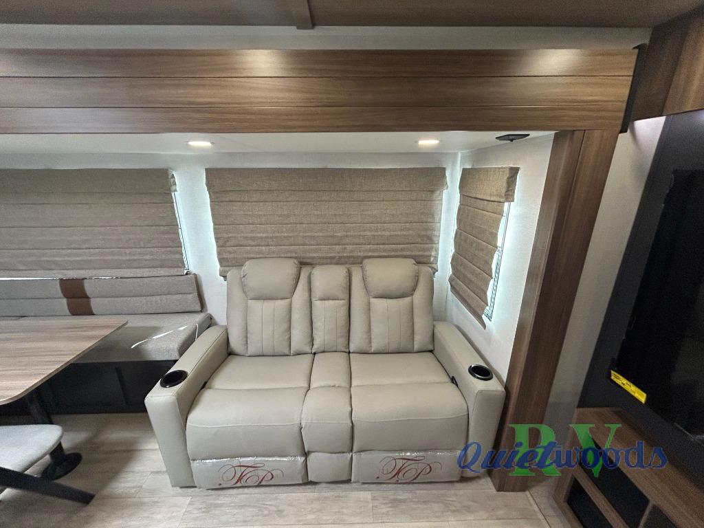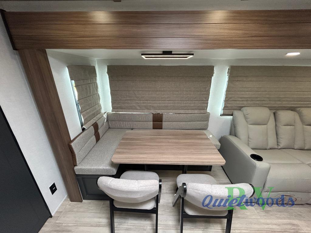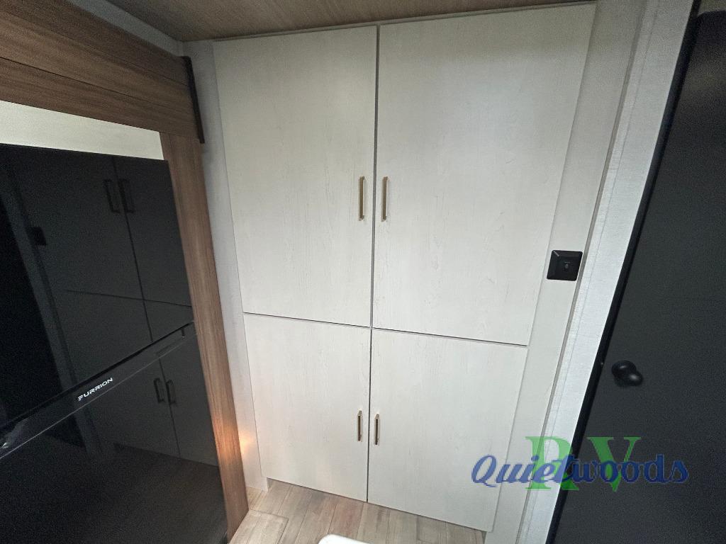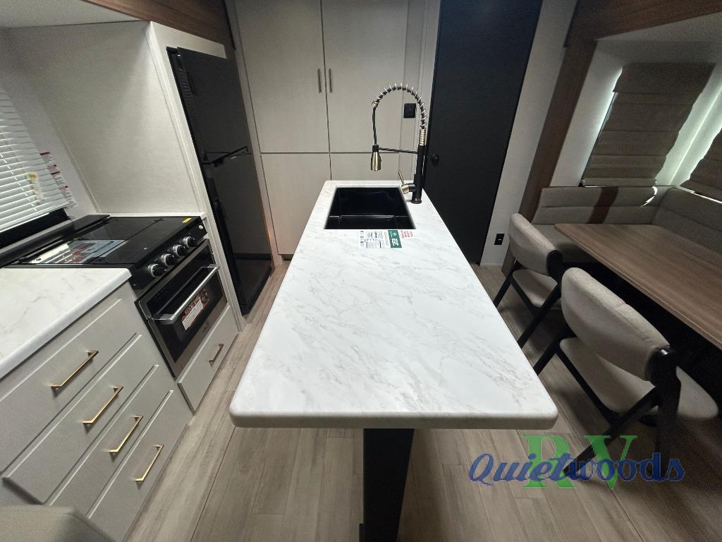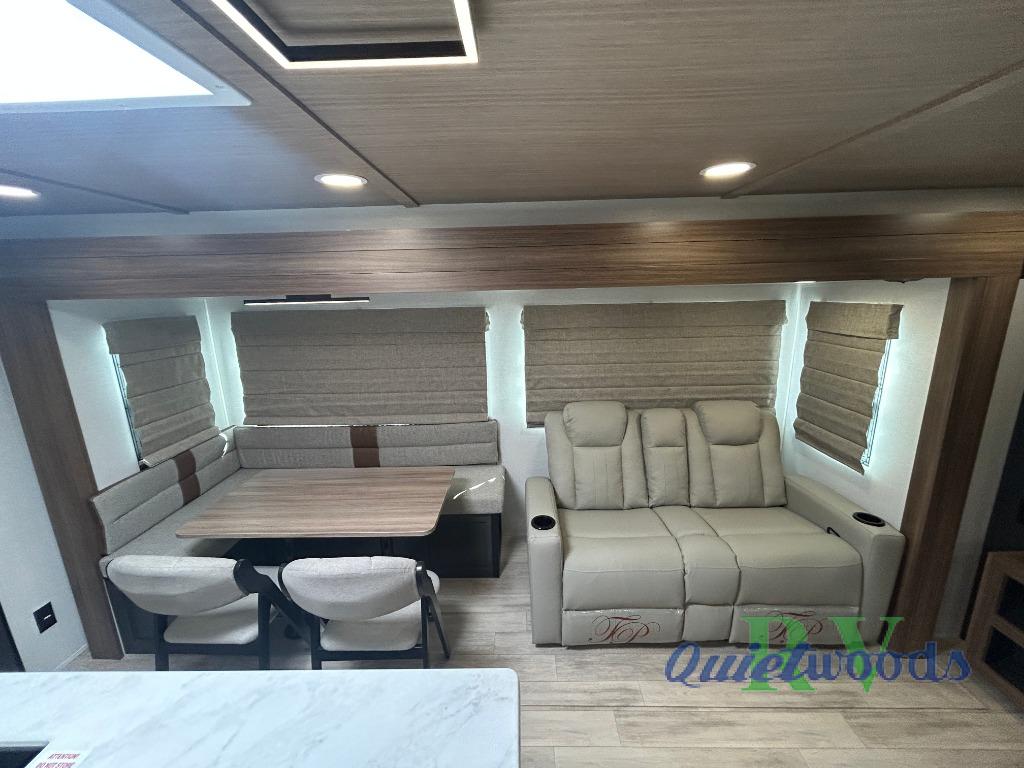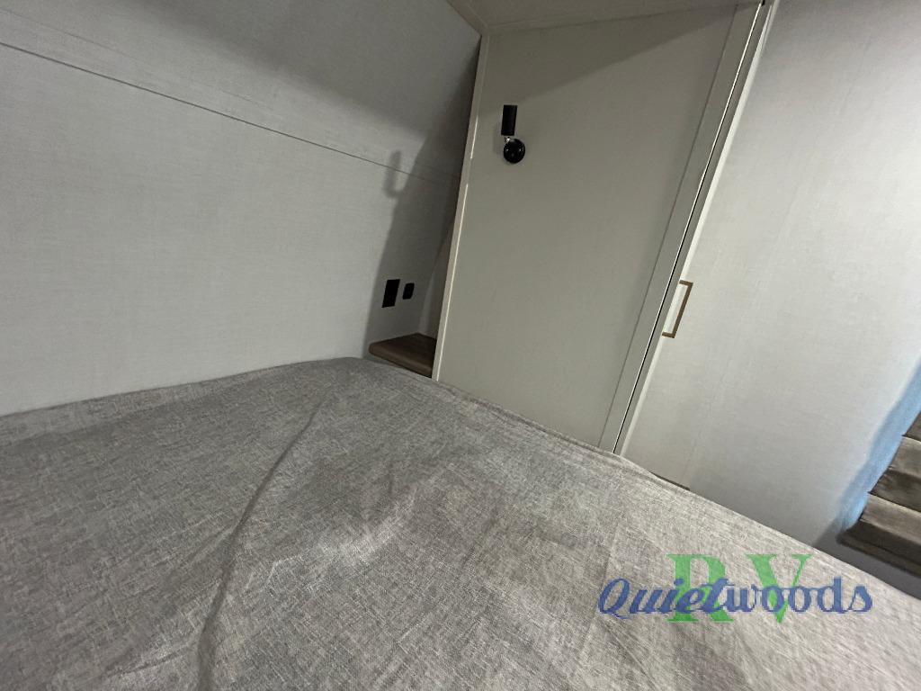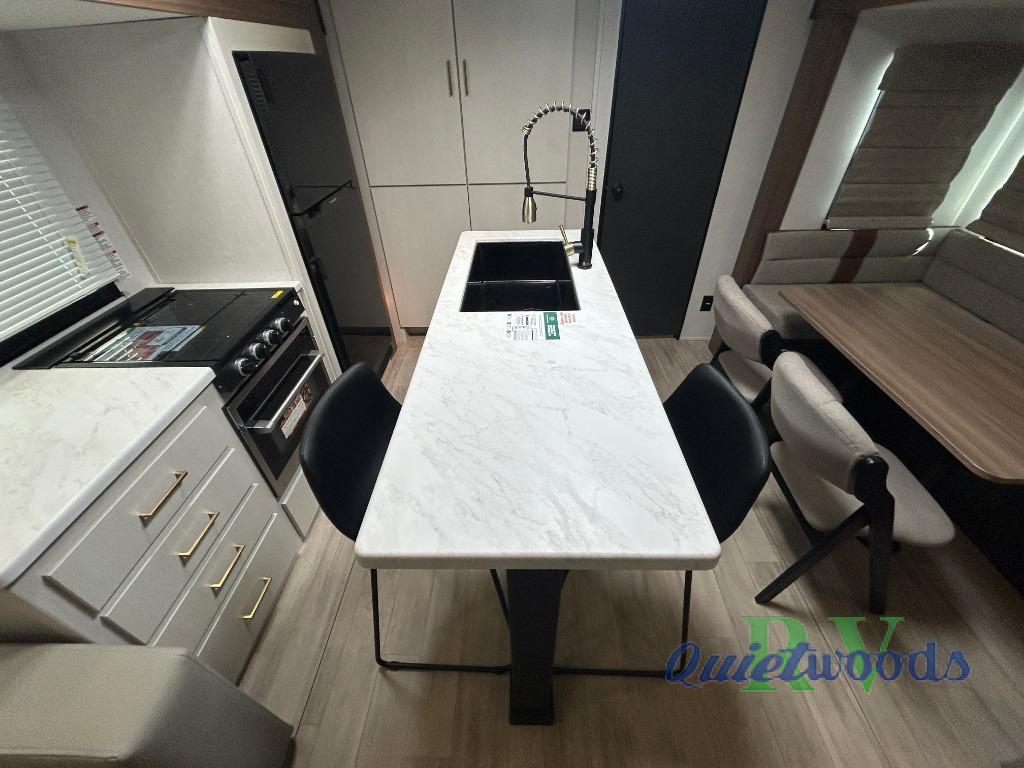 Whether you enjoy spending time outdoors or indoors, there is something for everyone in this travel trailer. The large pass-through storage can store your fishing poles, and the 20' electric awning with LED lights will create an outdoor living space. There is even an outdoor refrigerator with an outside storage cabinet and 32" TV! You will love all the interior space thanks to the dual opposing slides in the main living area, which will give the chef space to work around the kitchen island. Your crew can visit on the tri-fold sofa, theater seating and 5-person dinette while the fireplace is going, but you'll probably find the kids spending most of their time in the private bunkhouse! What more could you want in a travel trailer?!