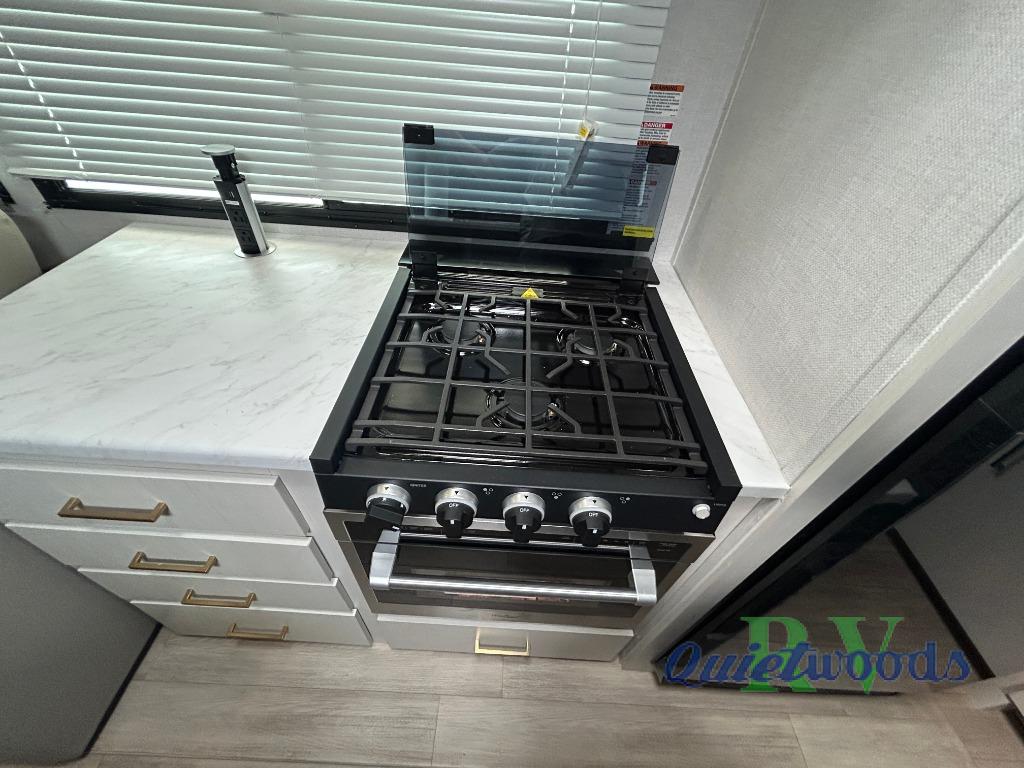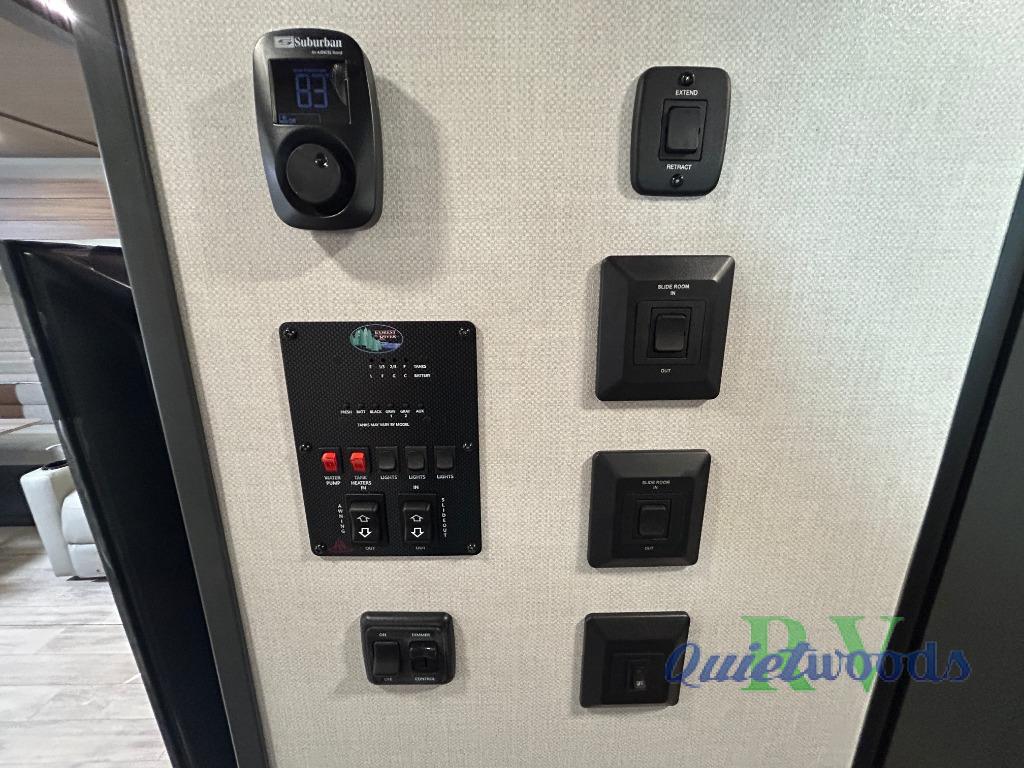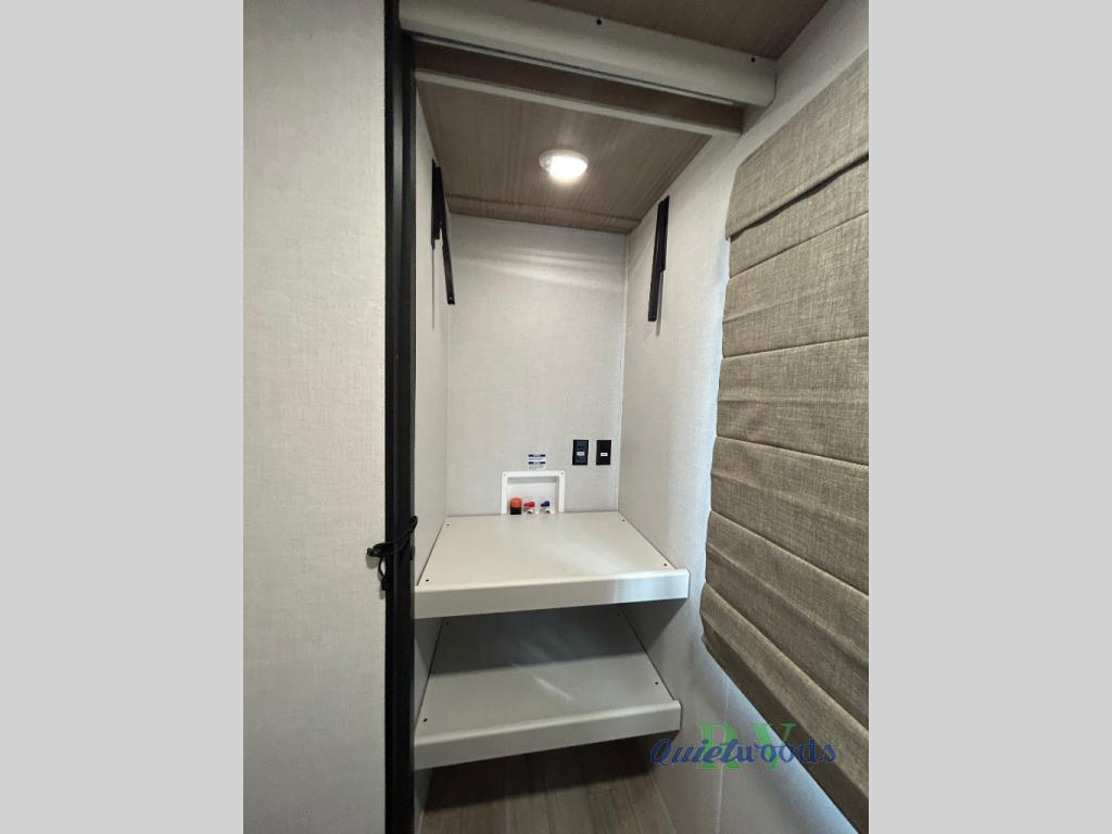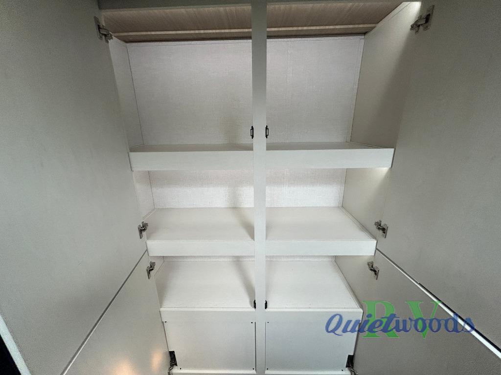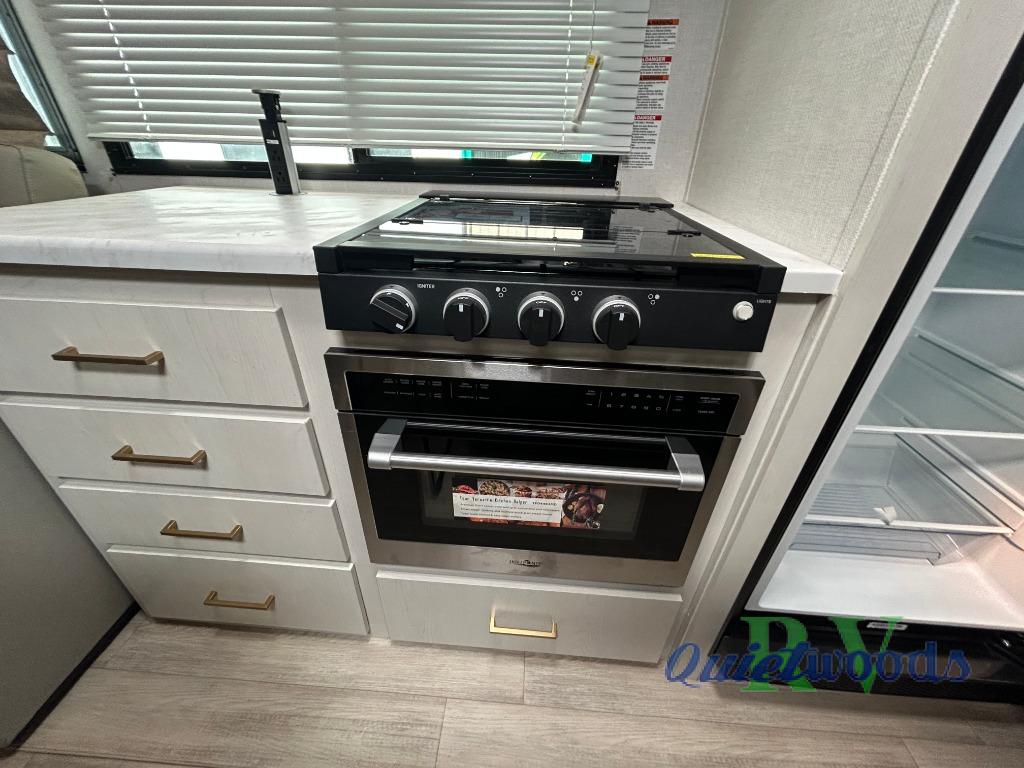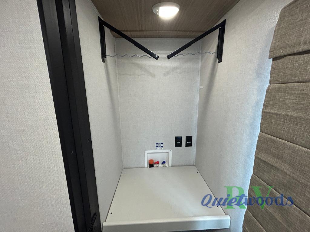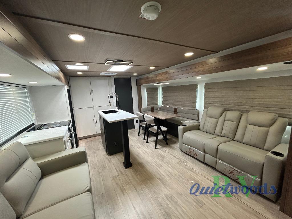 Whether you enjoy spending time outdoors or indoors, there is something for everyone in this travel trailer. The large pass-through storage can store your fishing poles, and the 20' electric awning with LED lights will create an outdoor living space. There is even an outdoor refrigerator with an outside storage cabinet and 32" TV! You will love all the interior space thanks to the dual opposing slides in the main living area, which will give the chef space to work around the kitchen island. Your crew can visit on the tri-fold sofa, theater seating and 5-person dinette while the fireplace is going, but you'll probably find the kids spending most of their time in the private bunkhouse! What more could you want in a travel trailer?!
