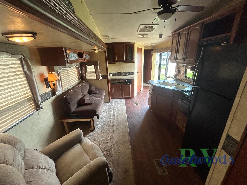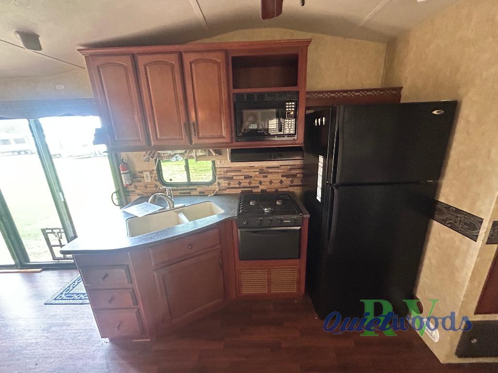 As you enter the trailer, to the left there is a double kitchen sink, three burner range, microwave, and refrigerator. The opposite side of the trailer has a slide with a u-shaped dinette and a sofa. Next to the sofa you will find an entertainment center.