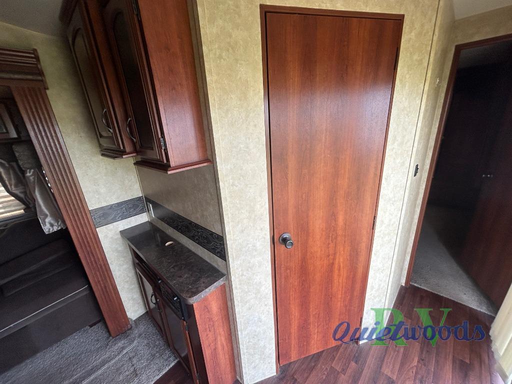 In the front bedroom you will find a queen bed slide, front wall wardrobe, dresser and shelves. There is also a private entrance leading outside from the bedroom.