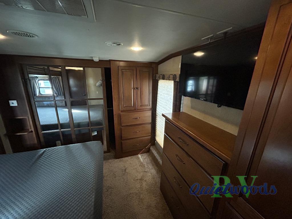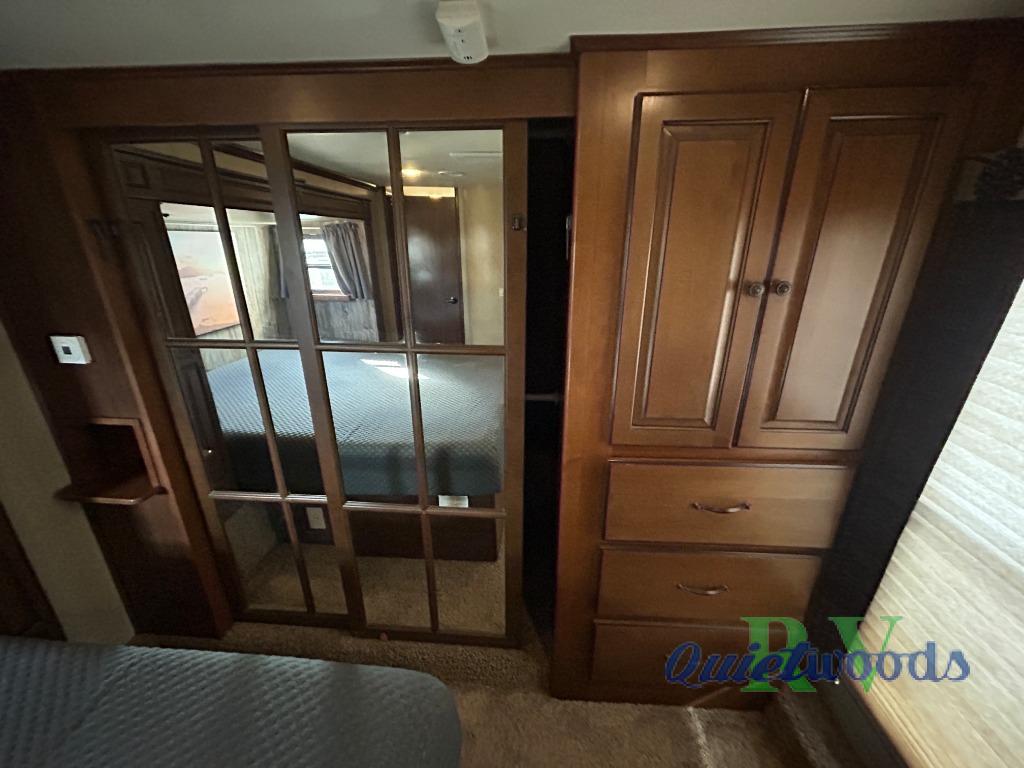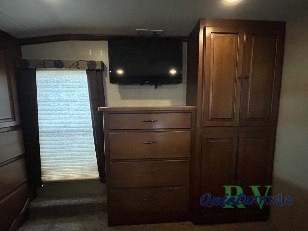 The front king bed provides a relaxing retreat to rest up after a fun filled day of adventure. There is a comfortable king size bed slide-out, a dresser, and additional storage cabinet opposite the bed, plus a front wall wardrobe with closet organizer, large corner cabinet, and so much more!