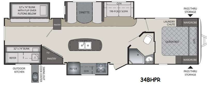 There is a pass-through storage compartment in the front for all of your exterior camping gear. There is also an exterior kitchen that includes a swing out cook top with two burners, a refrigerator, sink, and storage space, plus so much more!
