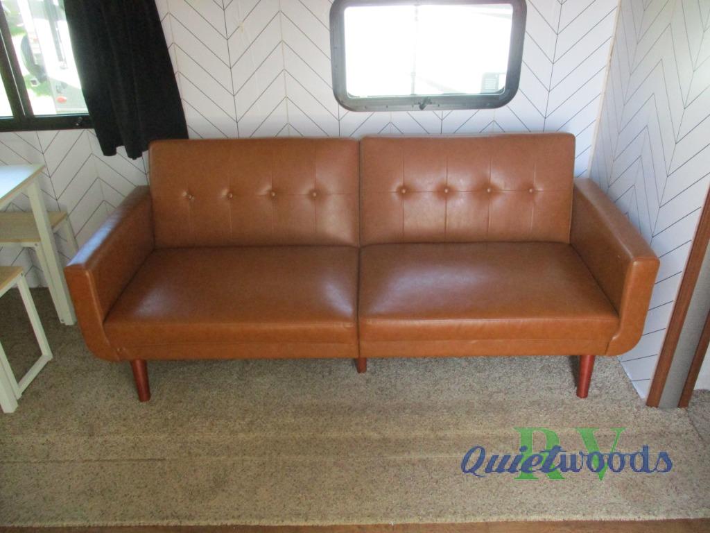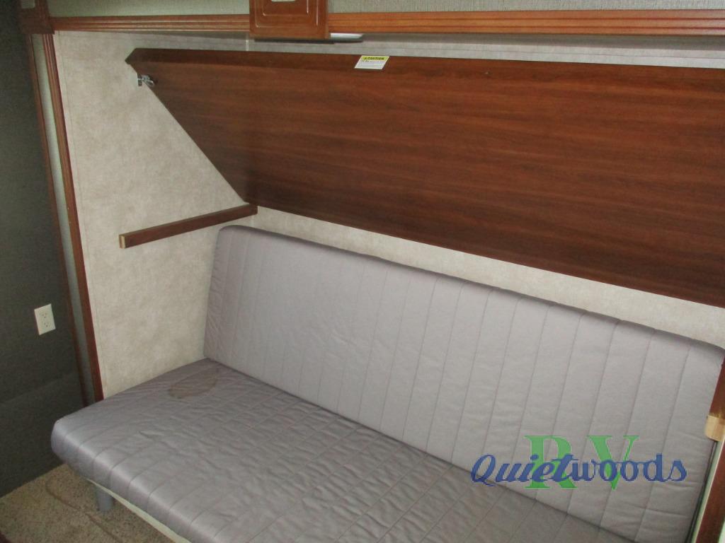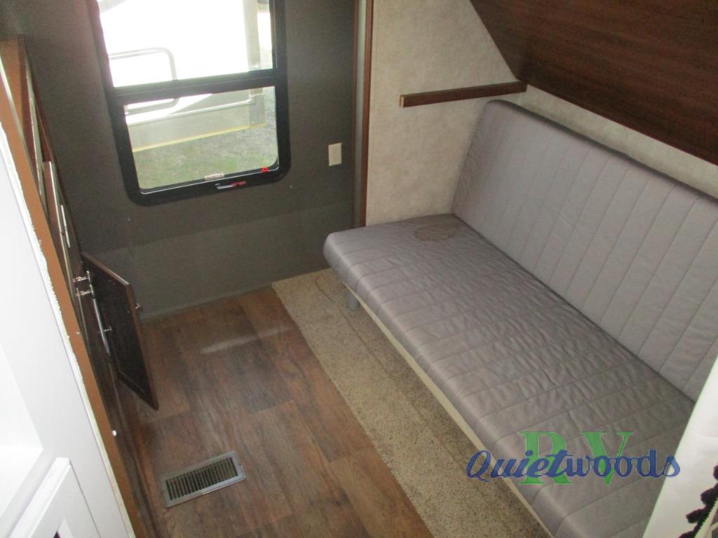 The rear bunkhouse will be a favorite for the kids, or the perfect space for extra guest to have a private retreat of their own. There is a futon slide with 32" x 74" flip bunk above on one side, and a 32" x 74" bunk above a wardrobe opposite with entertainment center and ladder too.