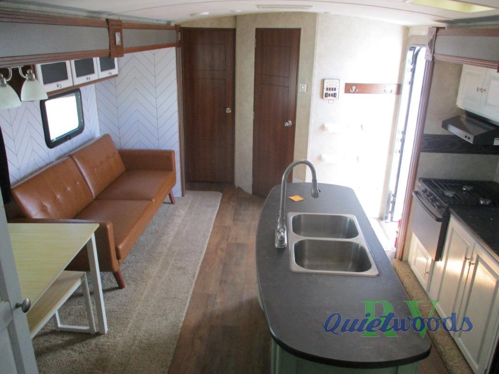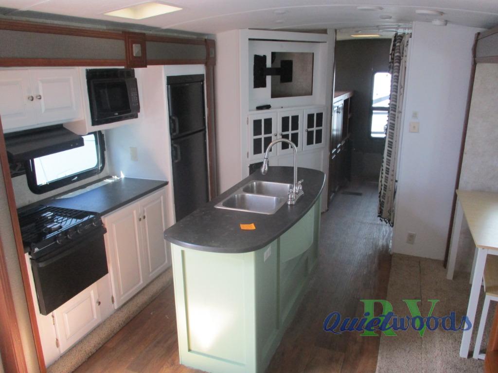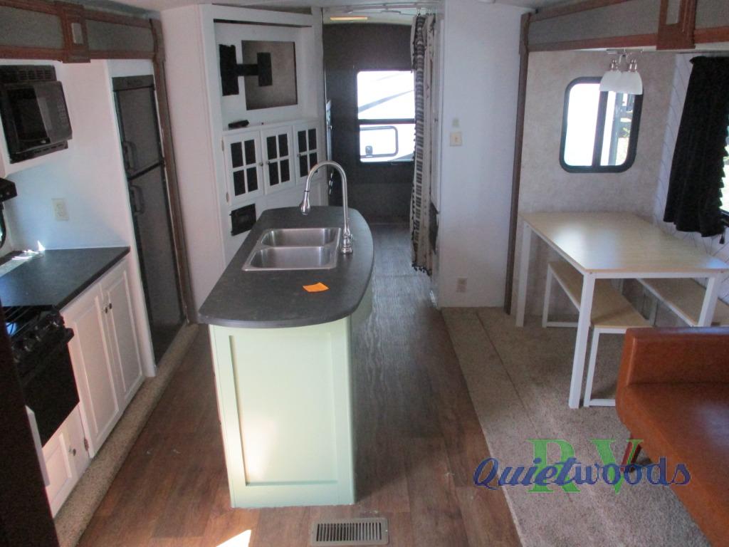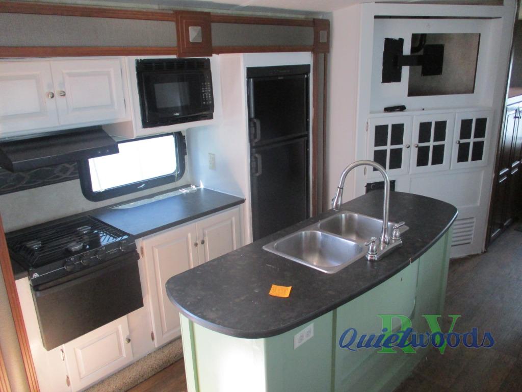 Step inside and be greeted by a spacious home like atmosphere including triple slide outs that really open up the space. The kitchen and living area are combined and features slides opposite one another. There is a center island with dual kitchen sinks for your convenience.