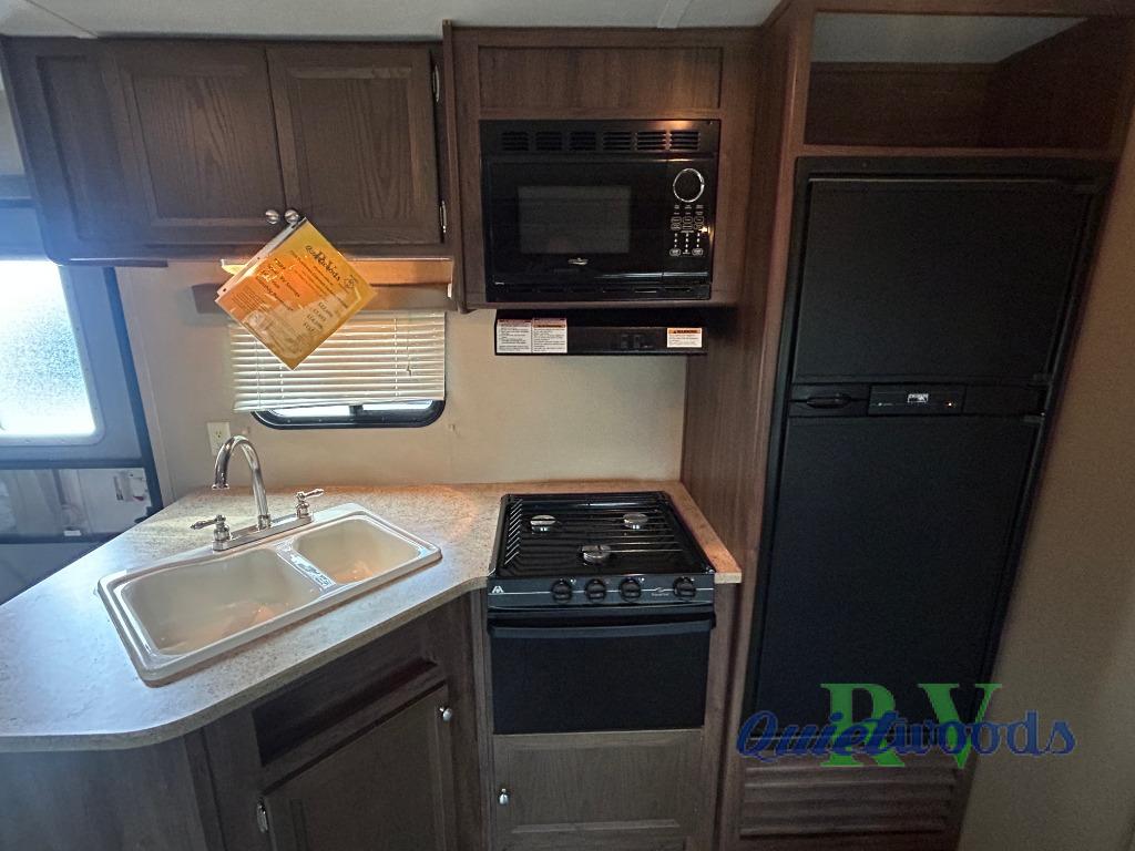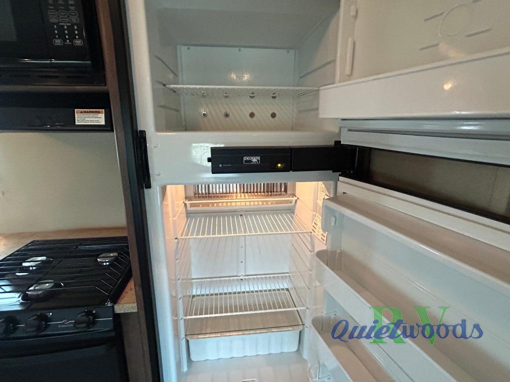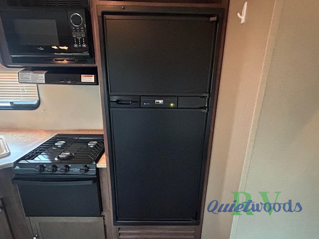 Cook all of your favorite meals and snacks in this Lantern Series kitchen which provides a double sink, a three burner range with overhead microwave oven, a refrigerator for all of your perishables, and plenty of overhead storage for dishes and things. There is also a pantry just off the dinette slide for food storage needs as well.
