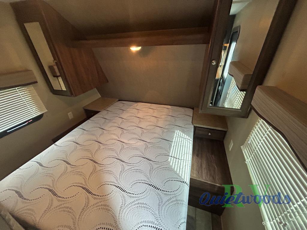 Enter model 295QBS and notice the front bedroom with queen size bed to your right. There are shirt closets and nightstands on either side of the bed, along with an overhead shelf for your things. The living room entertainment center is just off the foot of the bed and there are curtains on either side of it to create more privacy at night.