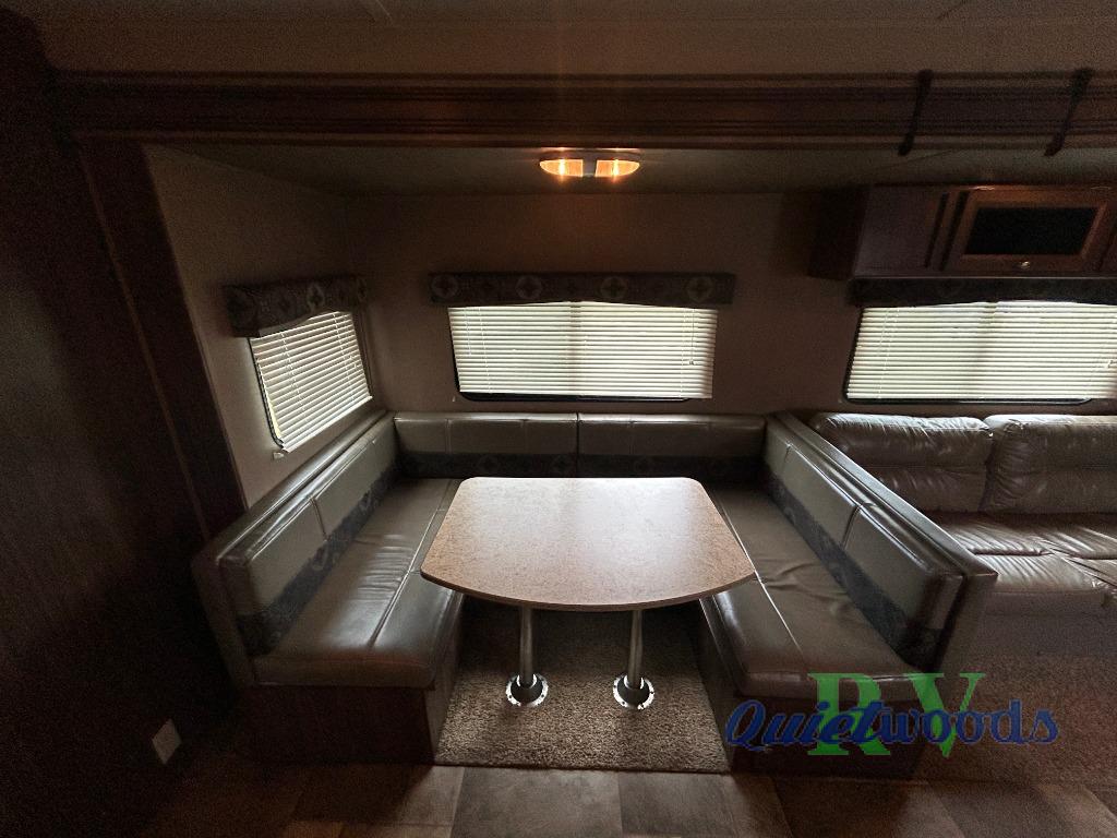 The slide out sofa and u-shaped dinette offer much seating in the living area. The sofa features storage above, and both can be made into sleeping space at night easily.