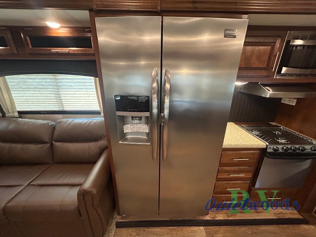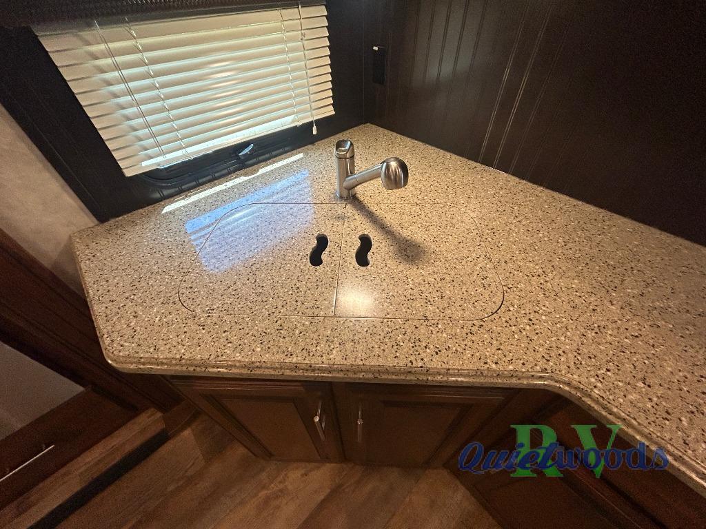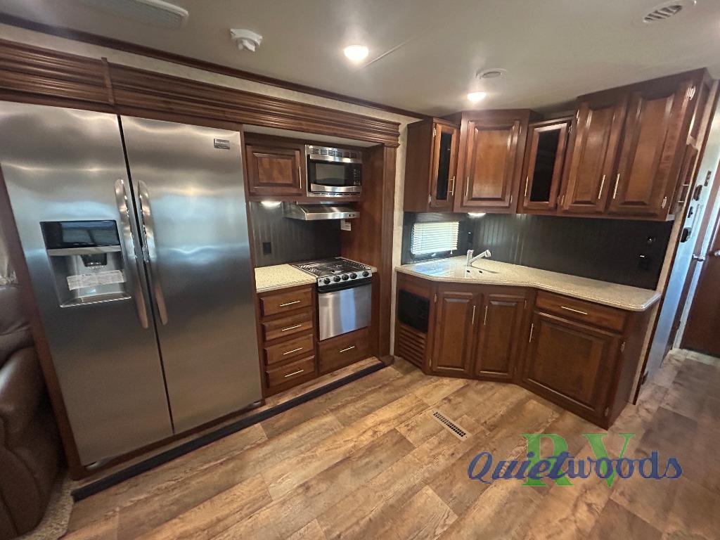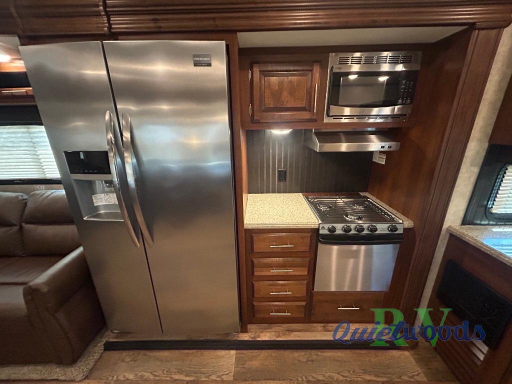 Along the rear wall there is an entertainment center with a fireplace. There is an additional slide out with a tri-fold sofa, pantry, refrigerator, microwave, and three burner range along the road side. Along the interior wall in the kitchen area you will find a counter which provides extra counter space, overhead cabinets, and a double kitchen sink. Enjoy the extra counter space of the optional rolling island, plus the convenience of moving it around to the best spot for you.