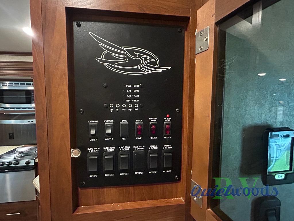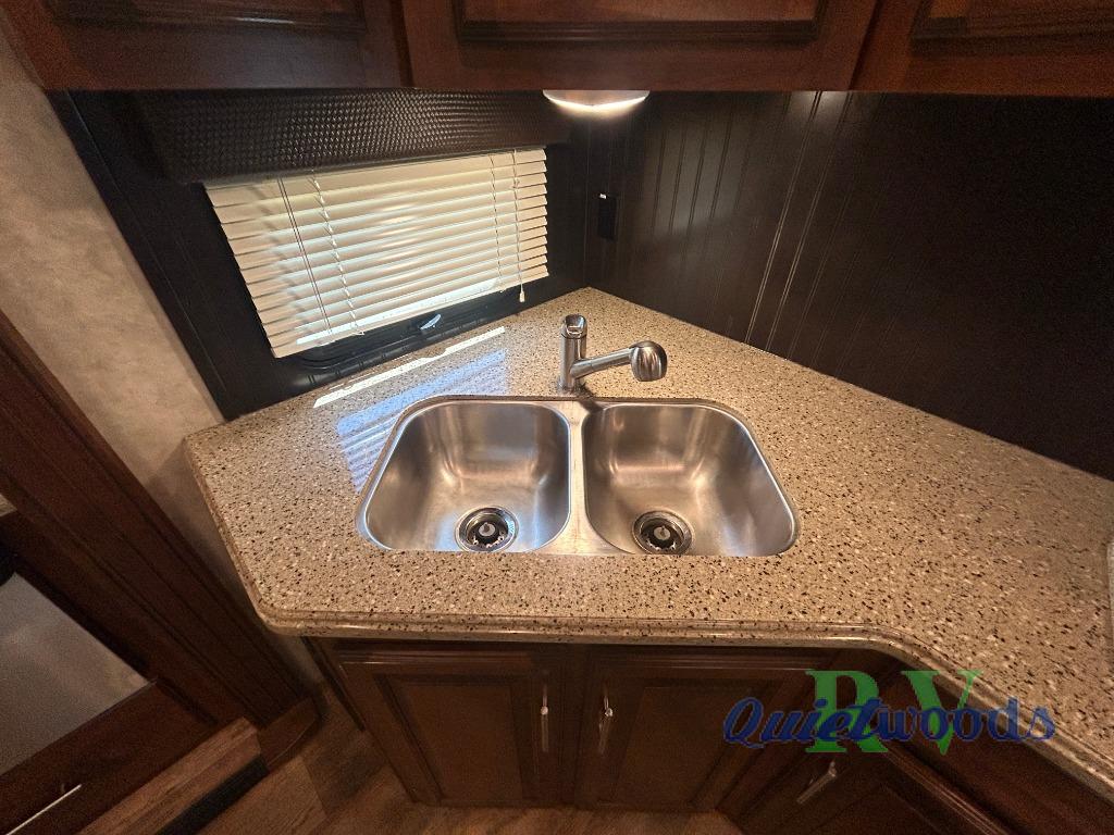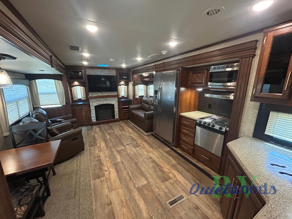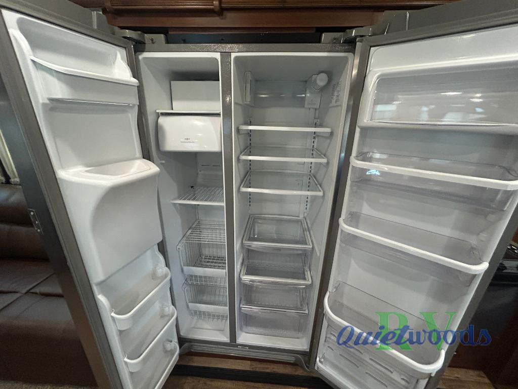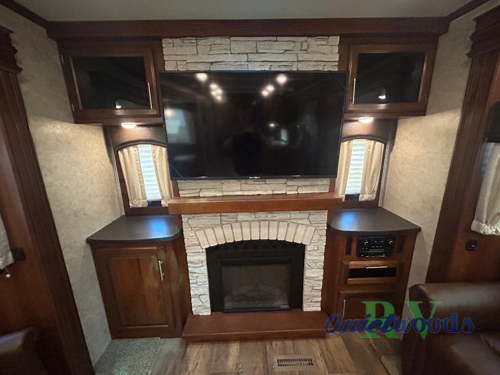 Along the rear wall there is an entertainment center with a fireplace. There is an additional slide out with a tri-fold sofa, pantry, refrigerator, microwave, and three burner range along the road side. Along the interior wall in the kitchen area you will find a counter which provides extra counter space, overhead cabinets, and a double kitchen sink. Enjoy the extra counter space of the optional rolling island, plus the convenience of moving it around to the best spot for you.