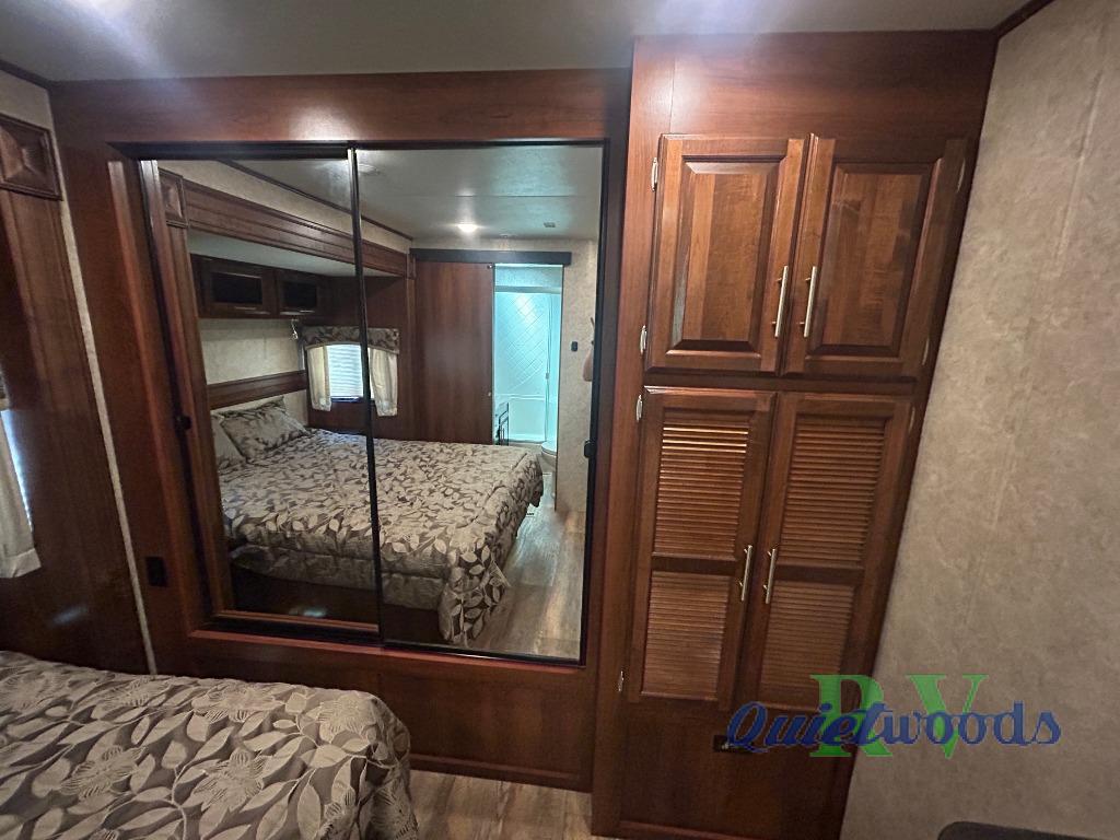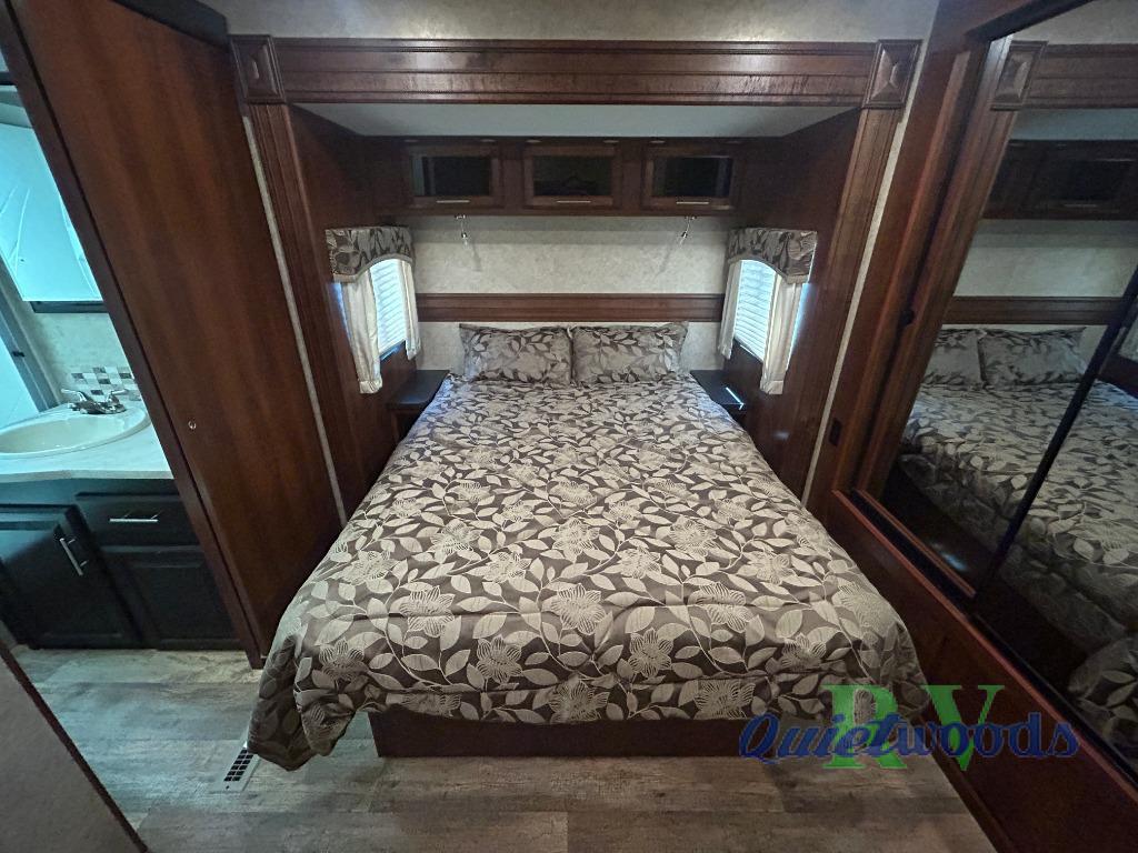 The front bedroom offers a comfortable queen bed slide out with shelves, a large wardrobe, storage area that has been washer and dryer prepped, and a dresser with optional TV. You may even choose an optional king bed in place of the queen.