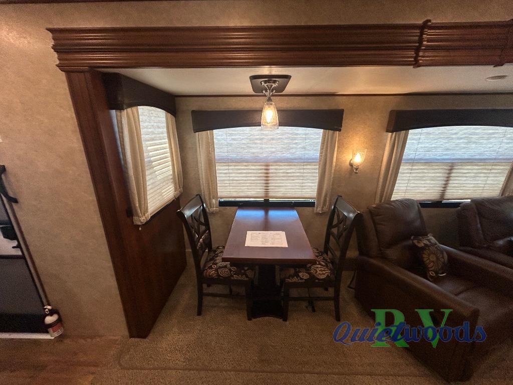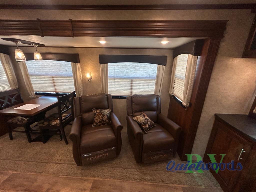 As you enter the travel trailer, to the left there is a slide out with a booth dinette and two recliners. You can choose an optional table with chairs in place of the dinette, and a hide-a-bed sofa in place of the recliners.