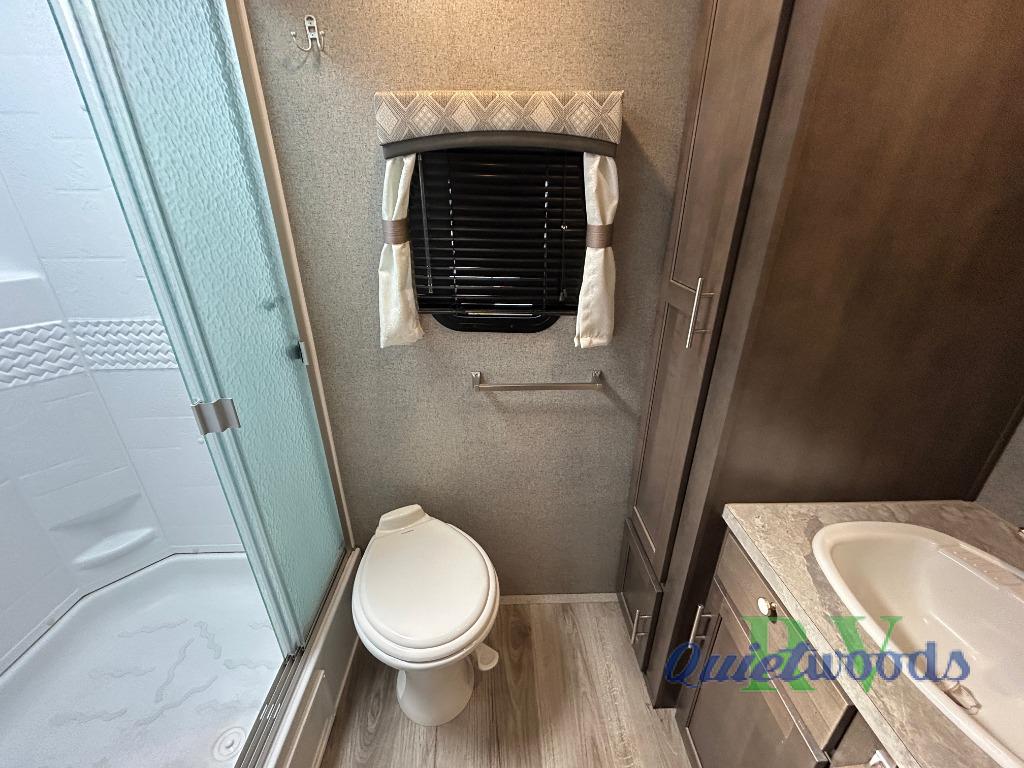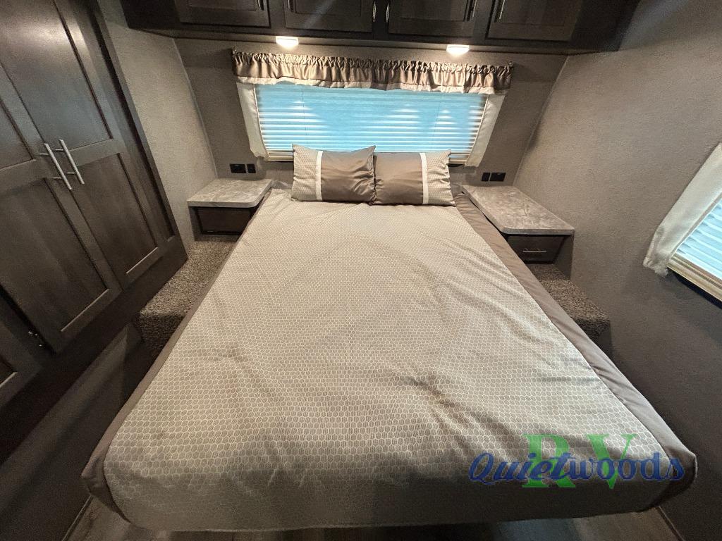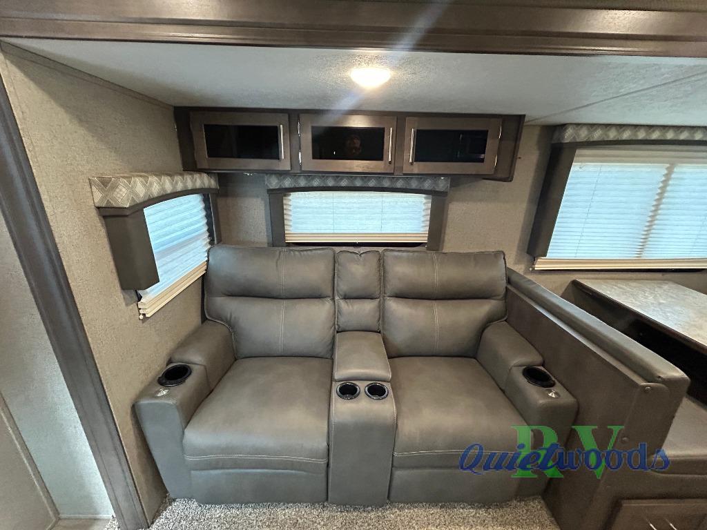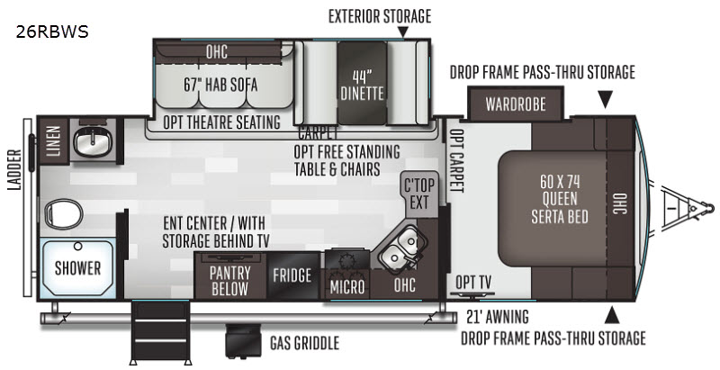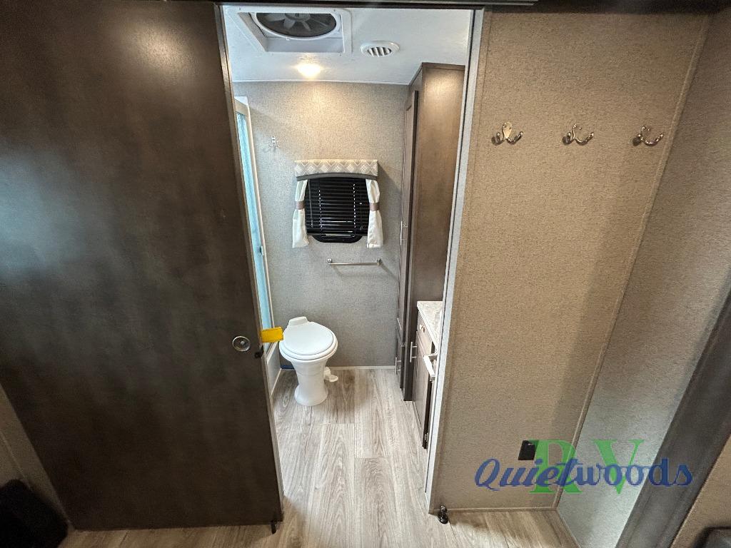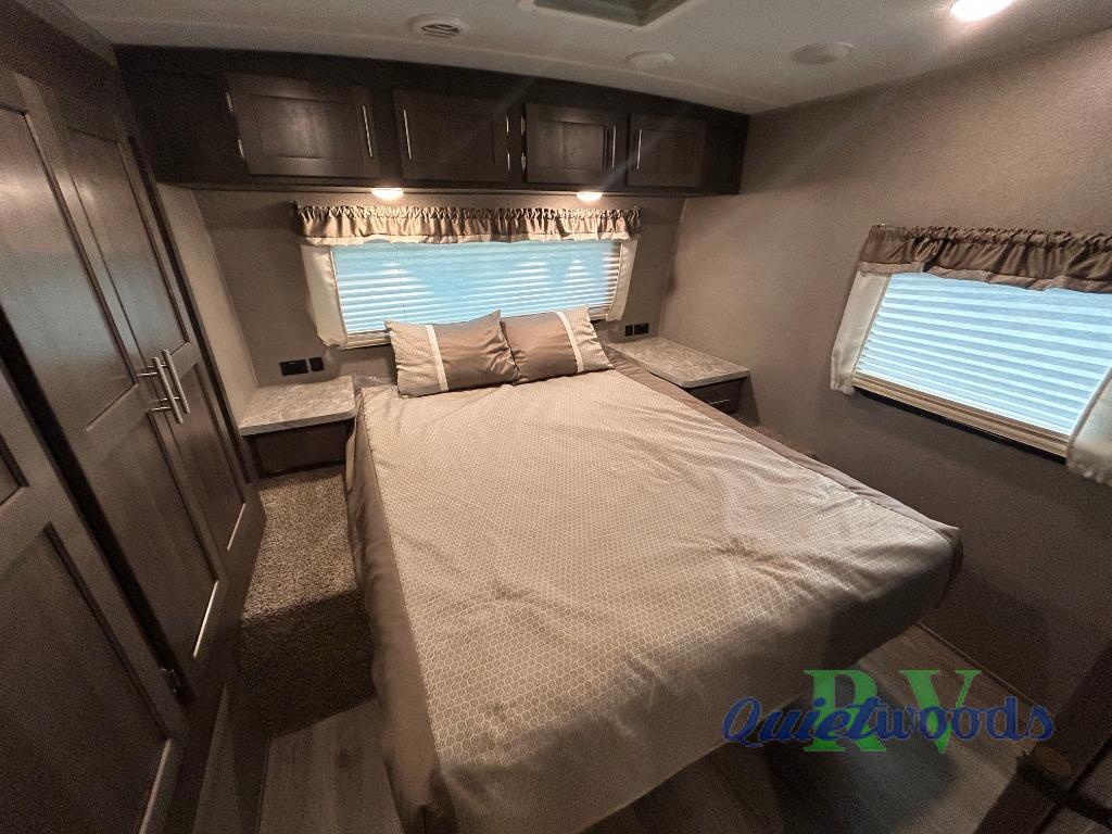 This travel trailer will allow you to enjoy any camping adventure! Transform the dinette into added sleeping space at night. In the front private bedroom, there is a wardrobe slide for your clothing storage needs, and a spot for an optional TV so you can catch the end of your movie or the news before turning in for the night. On the outside, you will find a 21' awning to create an outdoor living area, a gas grill, and front drop frame pass-through storage. You will also see additional exterior storage in the dinette slide out, plus many more features to enjoy!