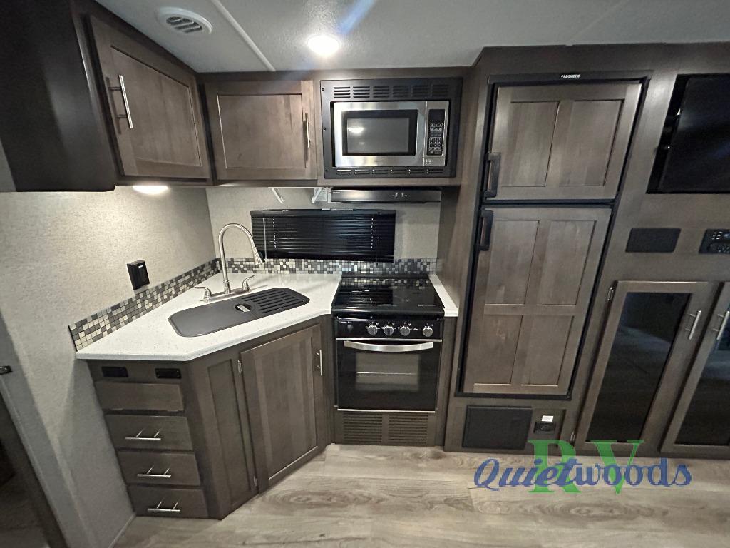 It will be easy to make plenty of memories with your family when you choose to camp with a Flagstaff Super Lite travel trailer by Forest River. These models have beautiful slatewood cabinetry with hardwood cabinet doors and drawer fronts, solid surface kitchen countertops, and ceiling LED 12 volt interior lighting. The 6 sided aluminum cage construction offers lightweight towing, the radius roof with interior vaulted ceilings give you more headroom, the WiFi ranger Wifi booster Sky 4, the enclosed underbelly, and the power awning with adjustable rain dump and LED light strip, will give you years of enjoyment!