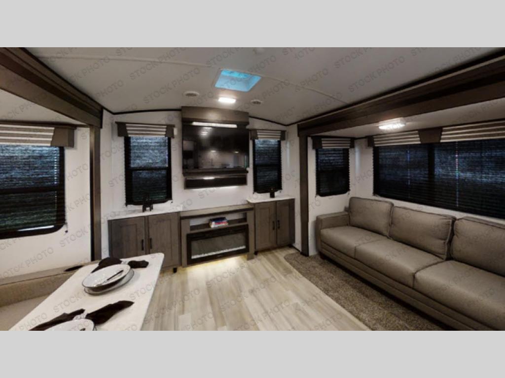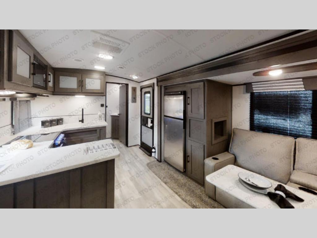 The thing that you are going to like best about this MPG travel trailer is the spacious rear living area! This part of the trailer has a rear entertainment center and a set of opposing sofa slides, and since this section is also adjacent to the kitchen, you can sit in one of the two bar stools at the breakfast bar while still being a part of the living area. Having a walk-through bath is convenient because it means that you can access the bathroom from the main living area or from the comfort of the front private bedroom, and having a king-size bed in the bedroom means that you will be able to sleep in supreme comfort each night.