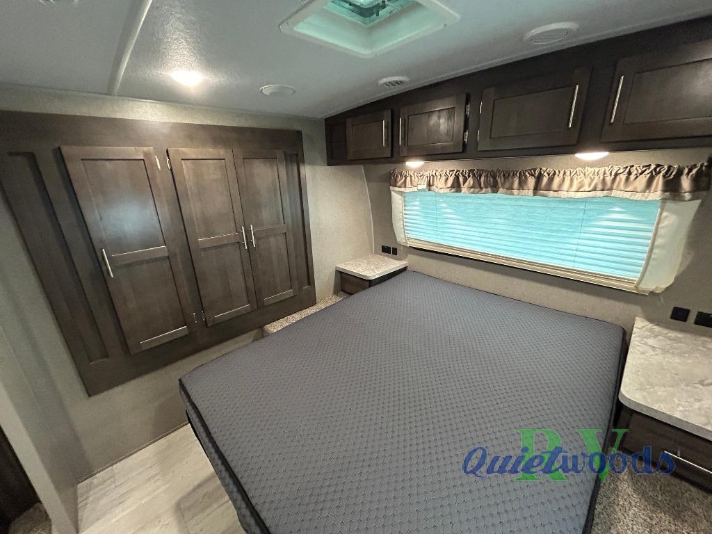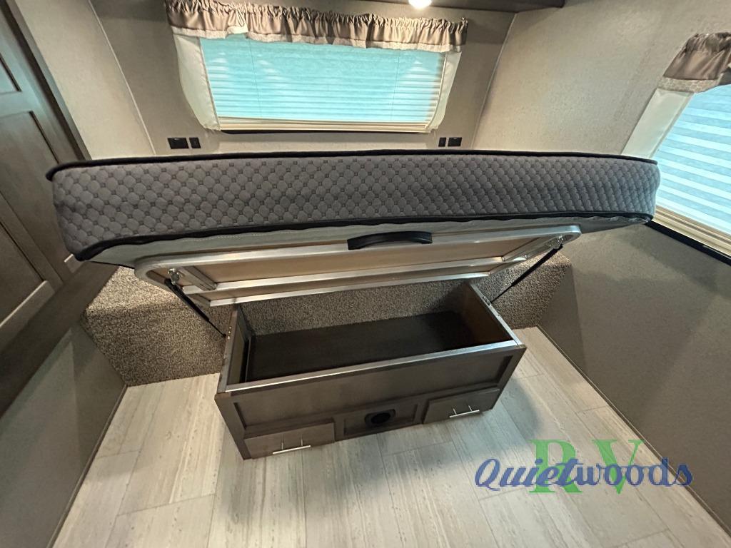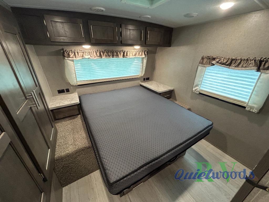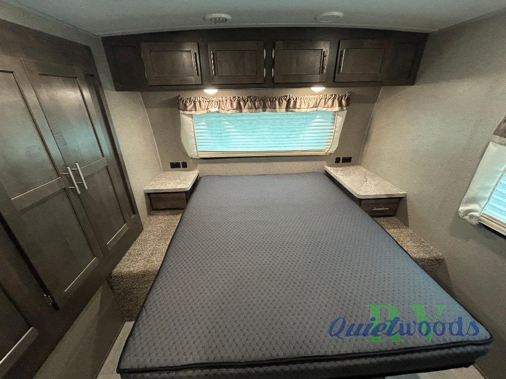 Camping just got a lot more comfortable with your family with your own walk-around queen bed, a slide out wardrobe and the second entry/exit into the front private bedroom. You might even like to add the TV option. The kids will have their own double size bunks to sleep on and the full bathroom is conveniently located a few steps away making those nighttime trips easier for them. You will soon find out that having dual entry doors keeps the flow of traffic moving especially when loading and unloading. You can cook inside with full amenities and store your cold food in the double door refrigerator, and/or cook outdoors using the outside kitchen with fridge. And you will find plenty of storage throughout the interior for everyone's things and along the exterior including in the drop frame pass-through storage.