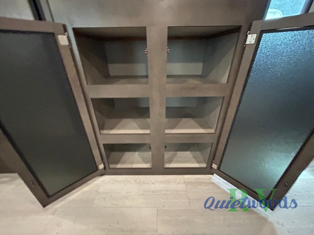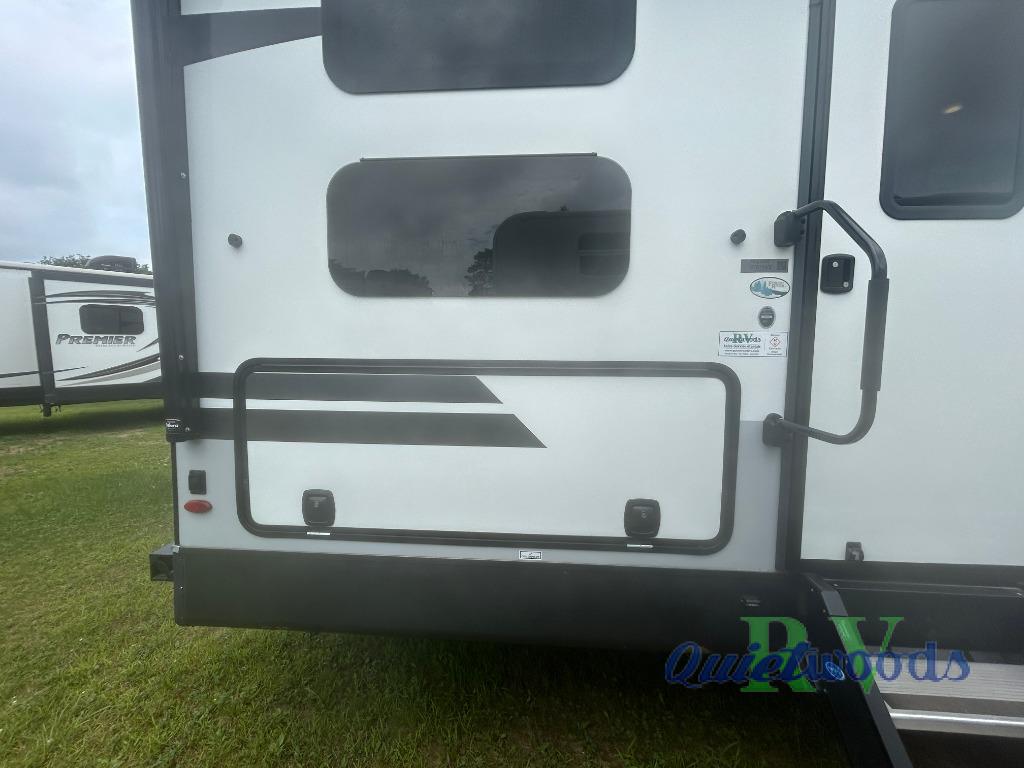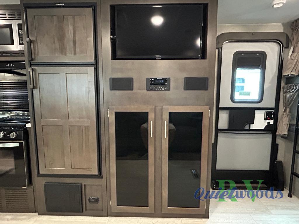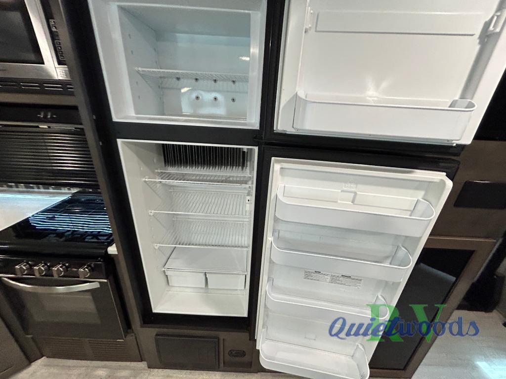 Camping just got a lot more comfortable with your family with your own walk-around queen bed, a slide out wardrobe and the second entry/exit into the front private bedroom. You might even like to add the TV option. The kids will have their own double size bunks to sleep on and the full bathroom is conveniently located a few steps away making those nighttime trips easier for them. You will soon find out that having dual entry doors keeps the flow of traffic moving especially when loading and unloading. You can cook inside with full amenities and store your cold food in the double door refrigerator, and/or cook outdoors using the outside kitchen with fridge. And you will find plenty of storage throughout the interior for everyone's things and along the exterior including in the drop frame pass-through storage.