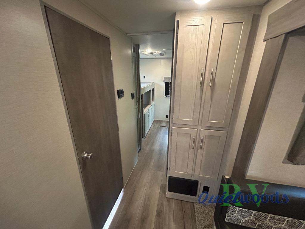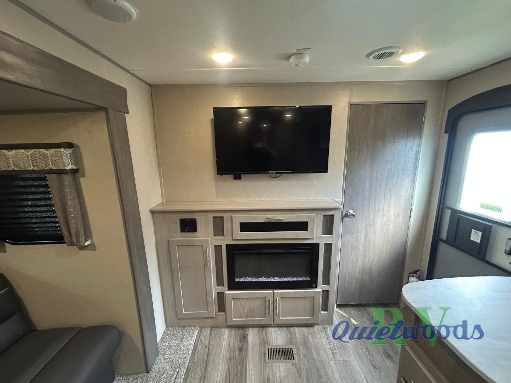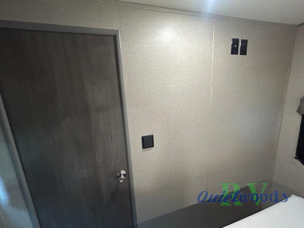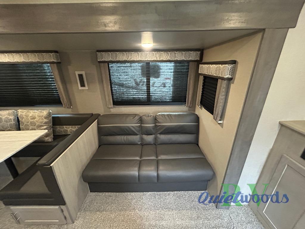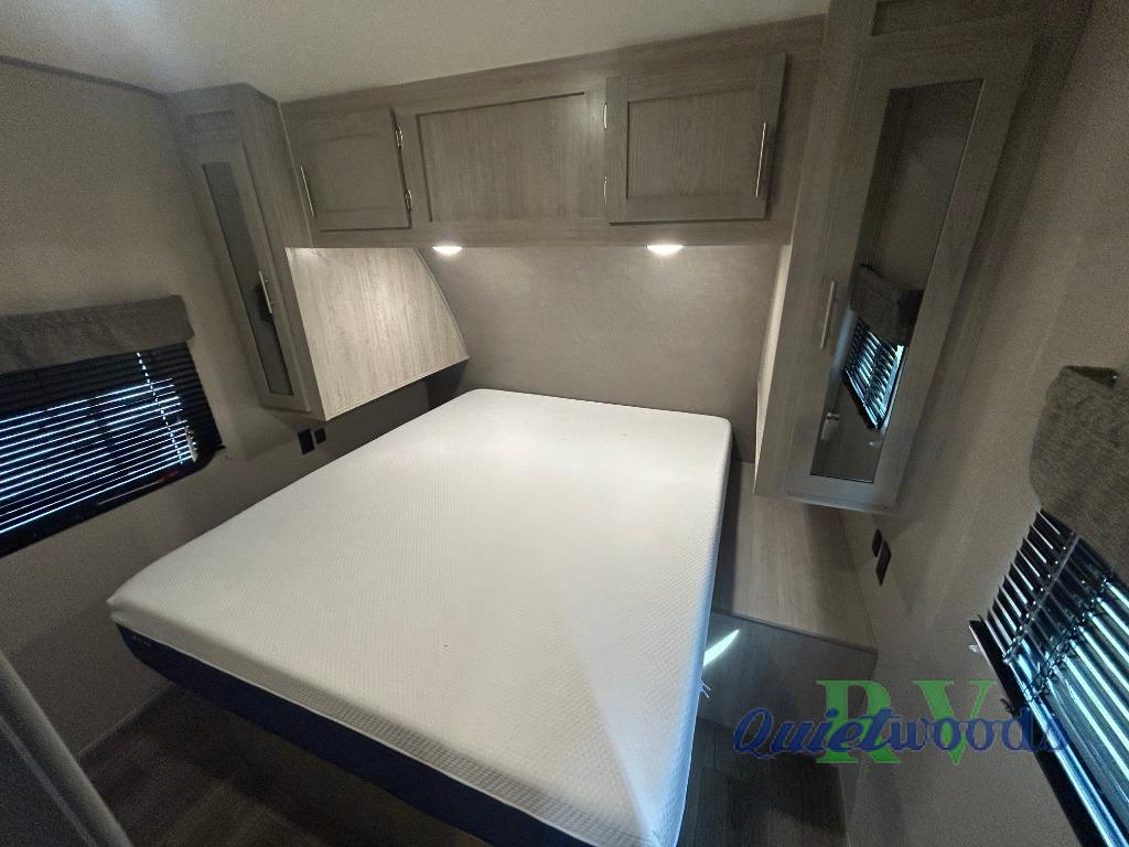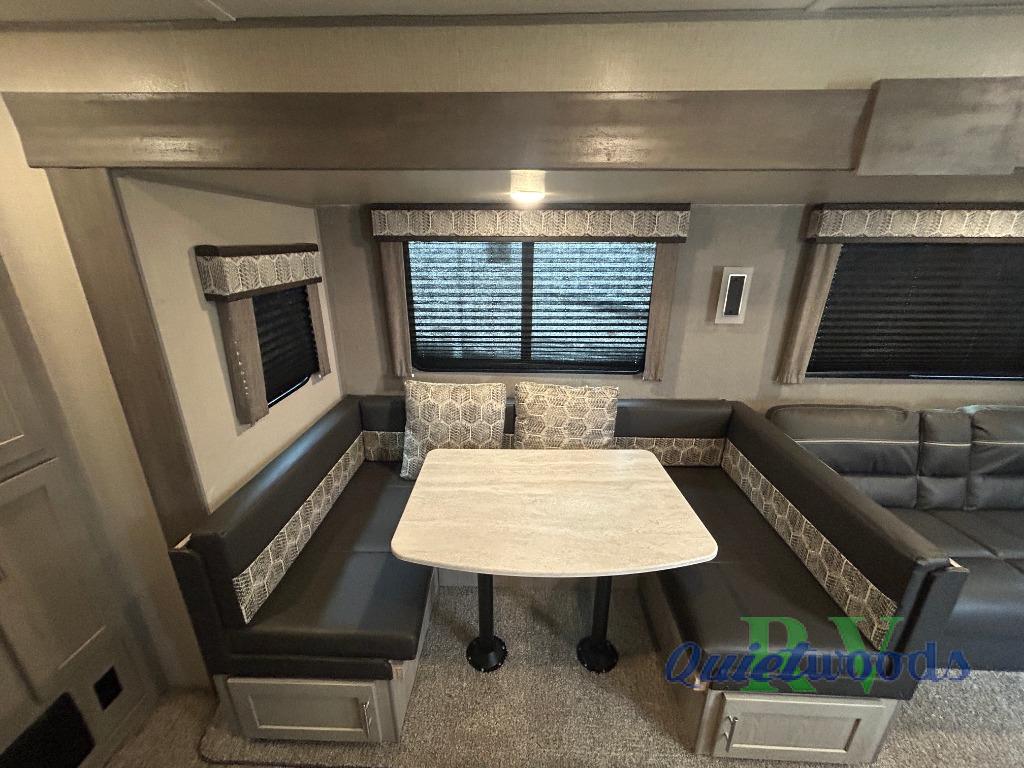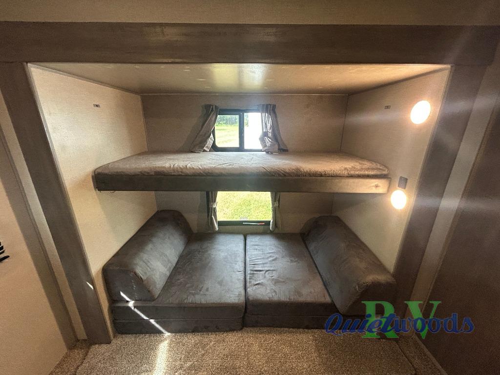 When you enjoy hiking, biking, fishing and/or any type of outdoor activities, and waking up to beautiful scenery from your own comforts, then start camping with this trailer at the campsite! You will be able to sleep like a queen on the walk-around bed with dual wardrobes and overhead storage for more items in the front private bedroom while your family or friends have their own privacy in the bunkhouse complete with two bunks, two COA cube futons and plenty of storage. The full bathroom includes the second entry/exit door for convenience when outside under the 21' electric awning with multicolor LED lights, or while cooking using the full size camper kitchen along the exterior. There are full kitchen amenities inside including a 10 cu. ft. refrigerator and a pantry. And there is a 39" TV to watch and a place to dine and relax on the U-shaped dinette and sofa slide out.